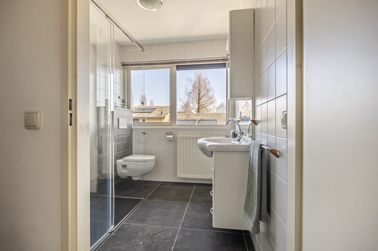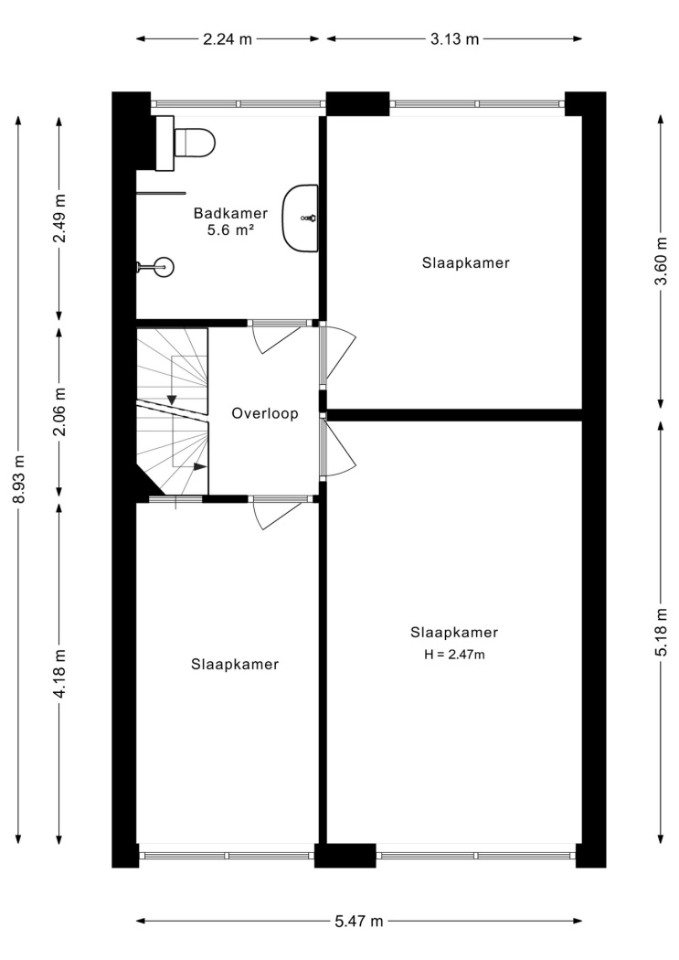 Op de eerste verdieping bevinden zich drie goed bemeten slaapkamers, waarvan twee aan de voorzijde en één aan de achterzijde van de woning. Dankzij de grote raampartijen zijn alle kamers heerlijk licht en flexibel in te richten. De badkamer is ruim en compleet uitgevoerd met een inloopdouche, toilet en wastafelmeubel. Ook de badkamer is voorzien van een raam wat niet alleen zorgt voor daglicht maar ook voor natuurlijke ventilatie, dit maakt deze ruimte extra comfortabel.