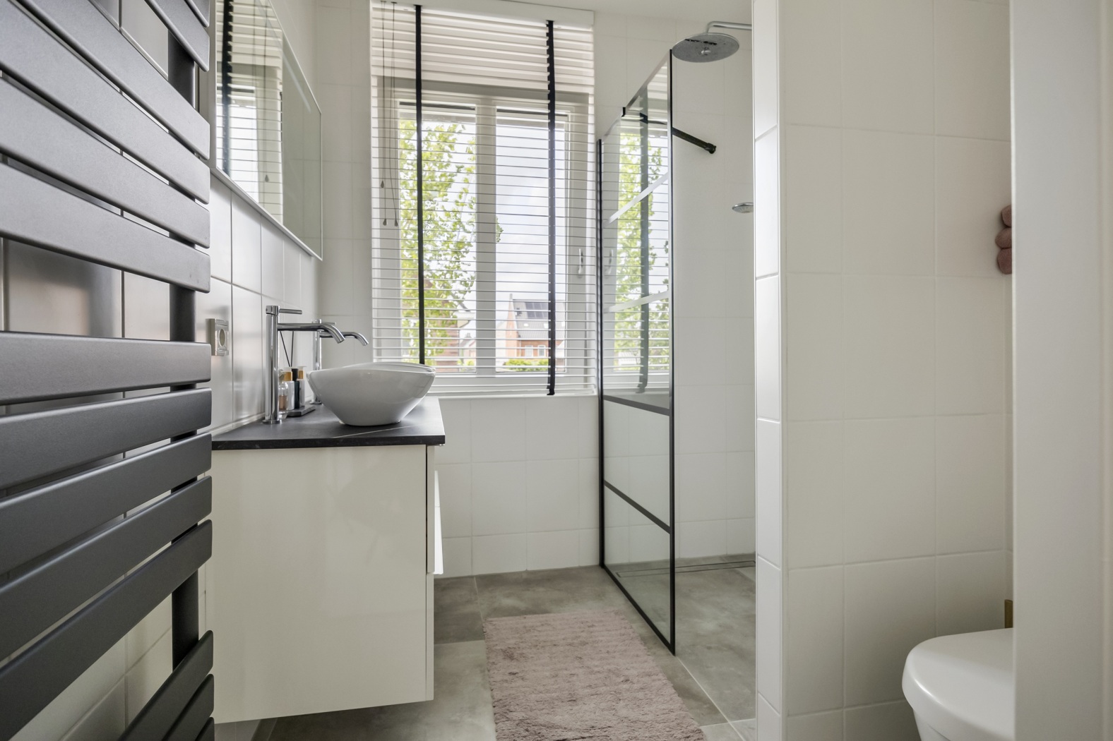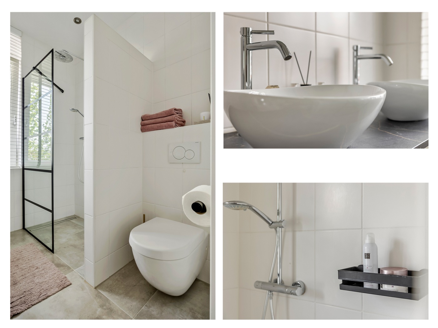 De badkamer, grotendeels vernieuwd in 2018 en in 2021 verder gemoderniseerd, straalt luxe en comfort uit met de uitstraling van een stijlvol hotel. Blikvanger is de royale inloopdouche met een elegante glazen wand en een luxe Grohe regendouche. Daarnaast is er een strak dubbel wastafelmeubel met twee waskommen, een tweede toilet stijlvol afgeschermd achter een hoge wand, en een moderne designradiator voor extra comfort.