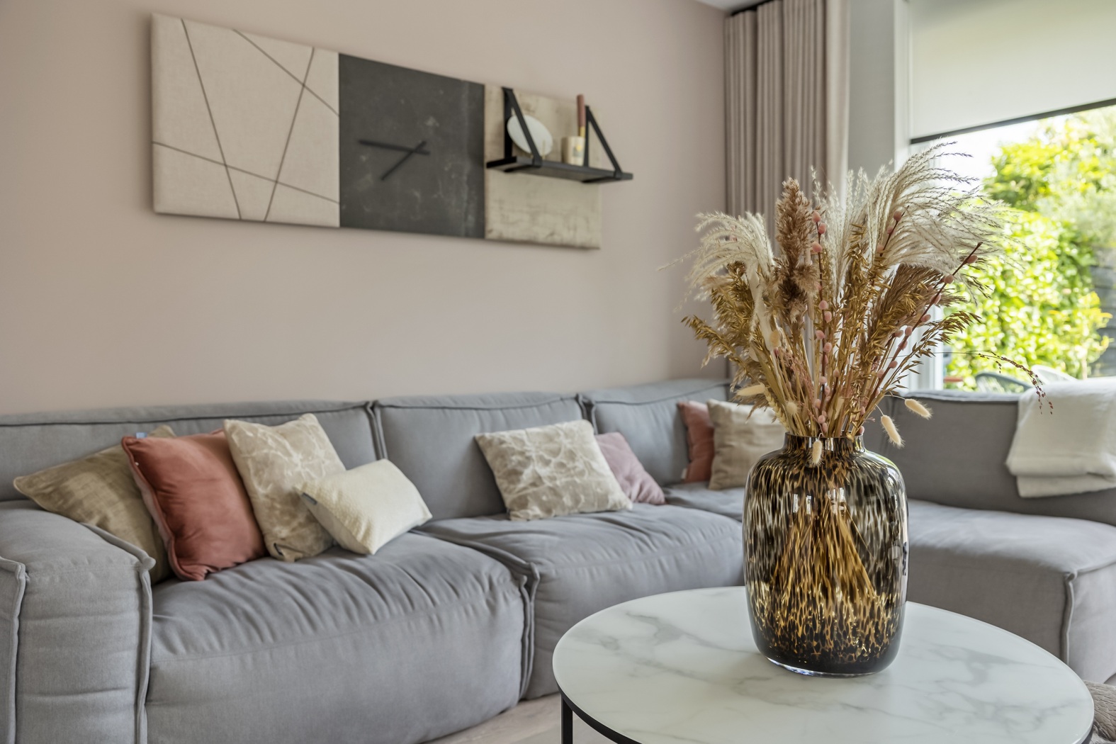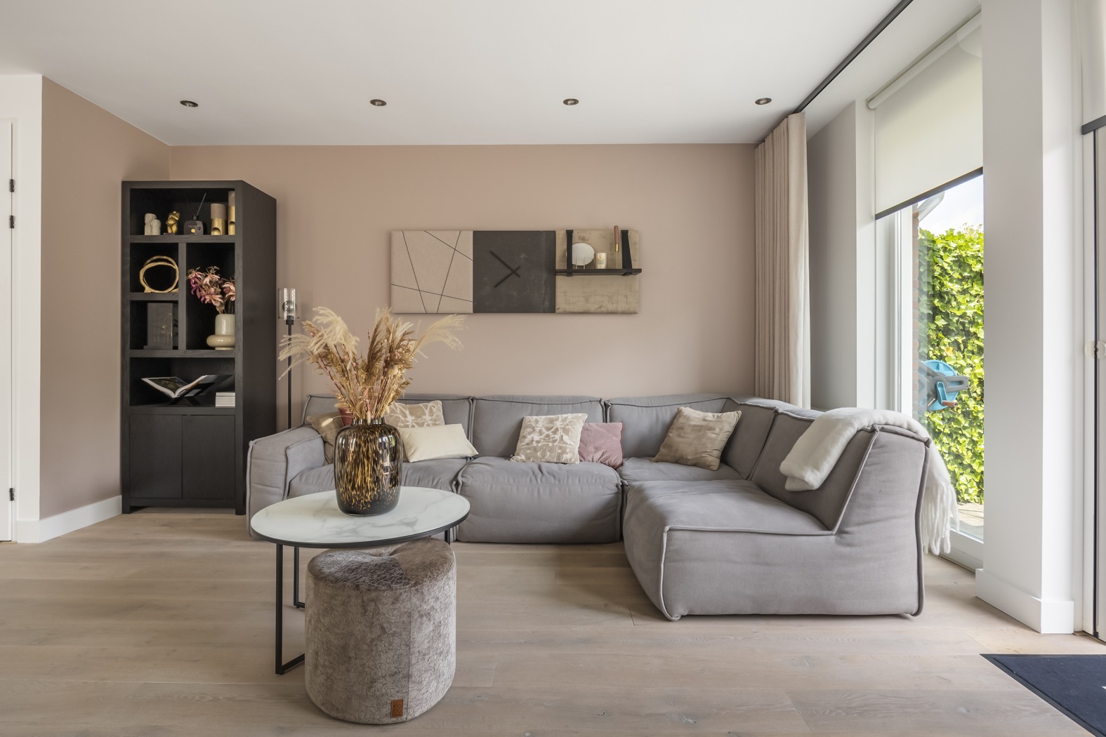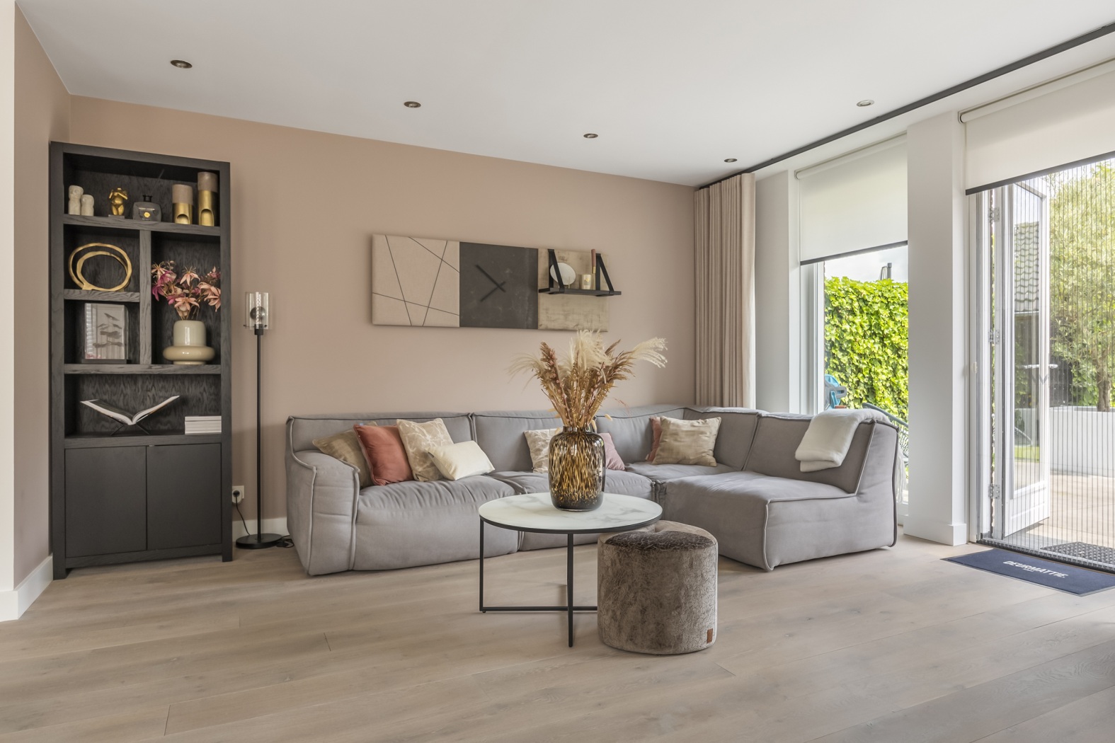 Dankzij de hoekligging geniet je van veel natuurlijk licht – met drie zijramen en twee ramen aan de achterzijde, plus een tuindeur die binnen naadloos met buiten verbindt. De gestucte wanden in zachte, rustige kleuren en het verlaagde plafond met dimbare inbouwspots zorgen voor een luxe uitstraling. De houten vloer is professioneel geschuurd, geborsteld en geolied.