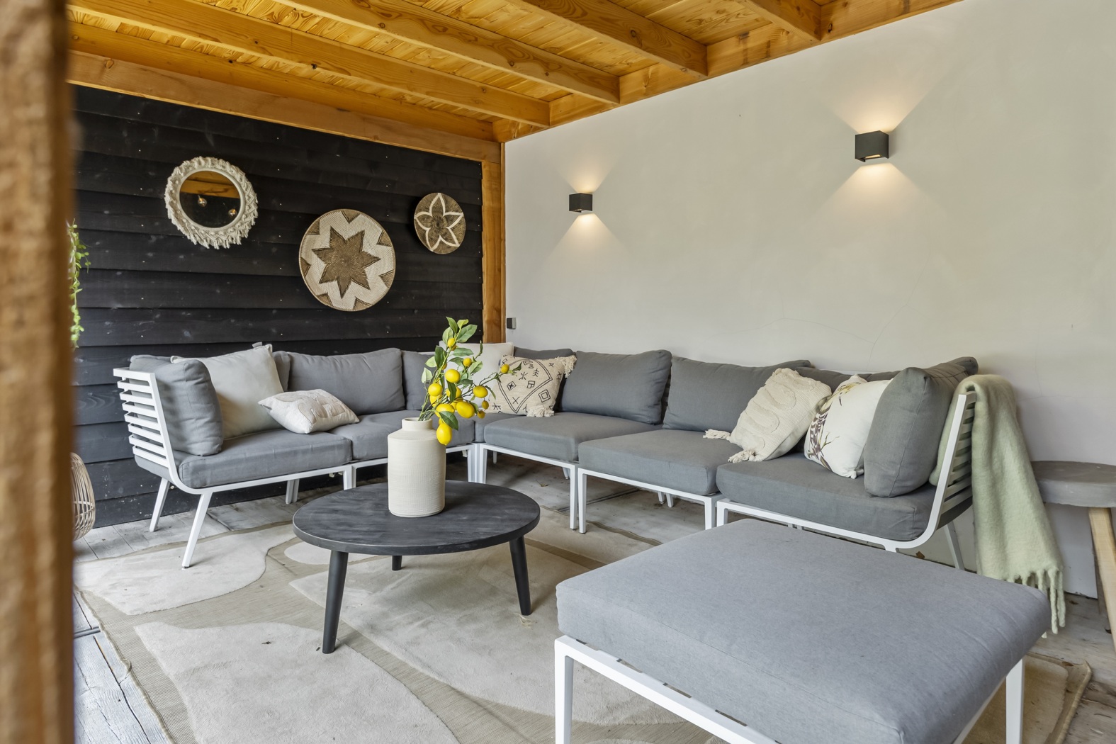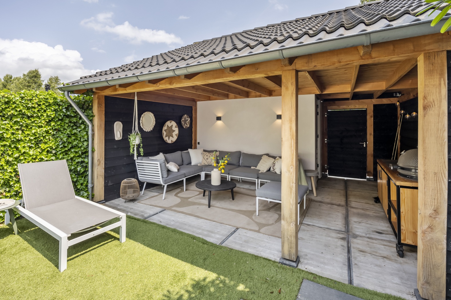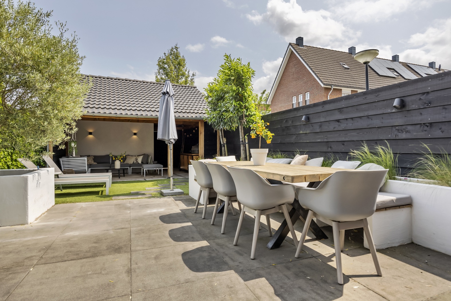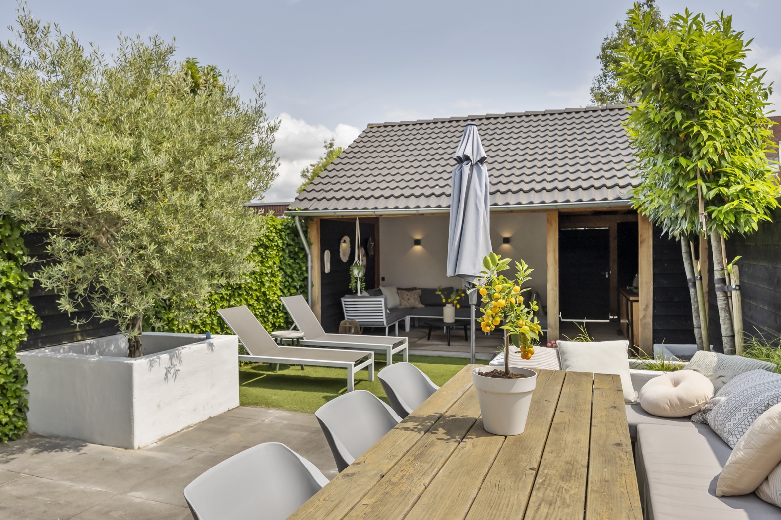 De tuin is ingericht met grote terrastegels, wit gestucte plantenbakken (waarvan één met olijfboom en één als zitbank), een kunstgras gazon, en een ruime lounge overkapping met schuur en bergzolder.