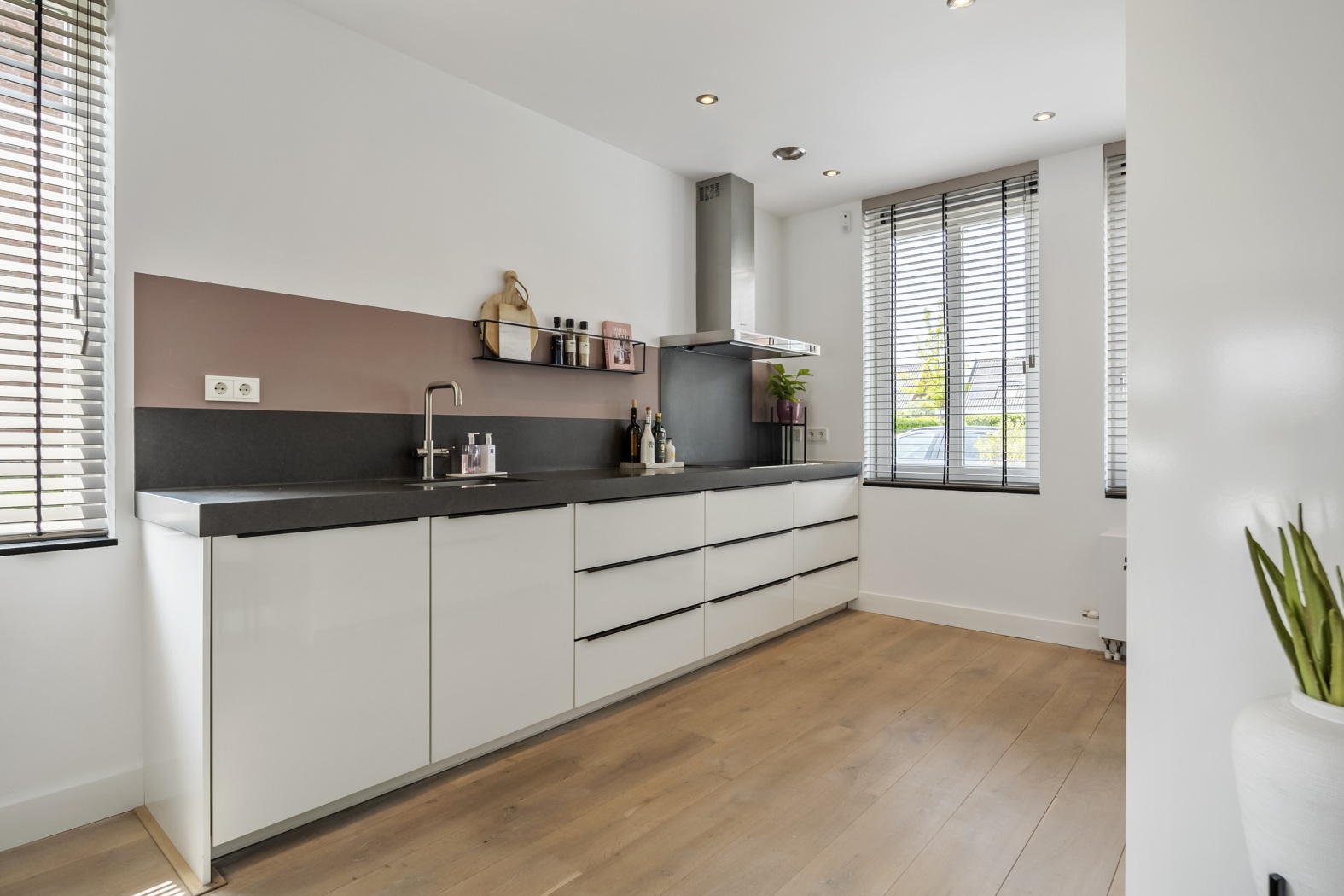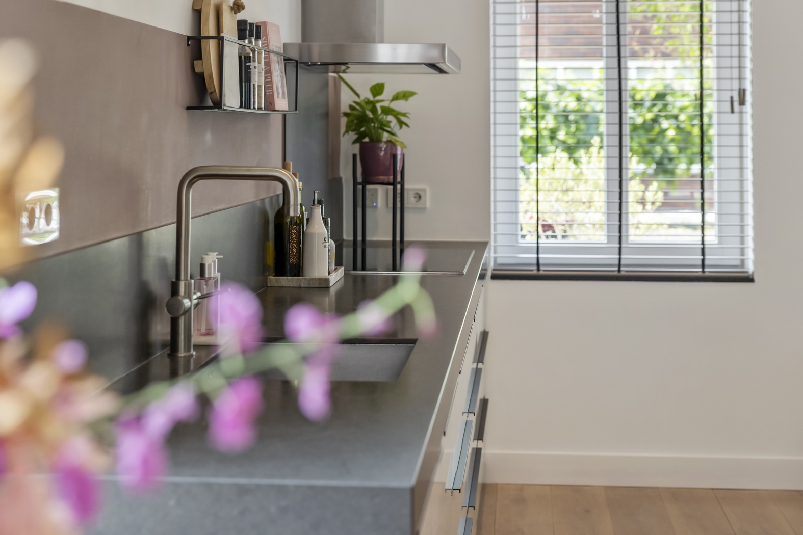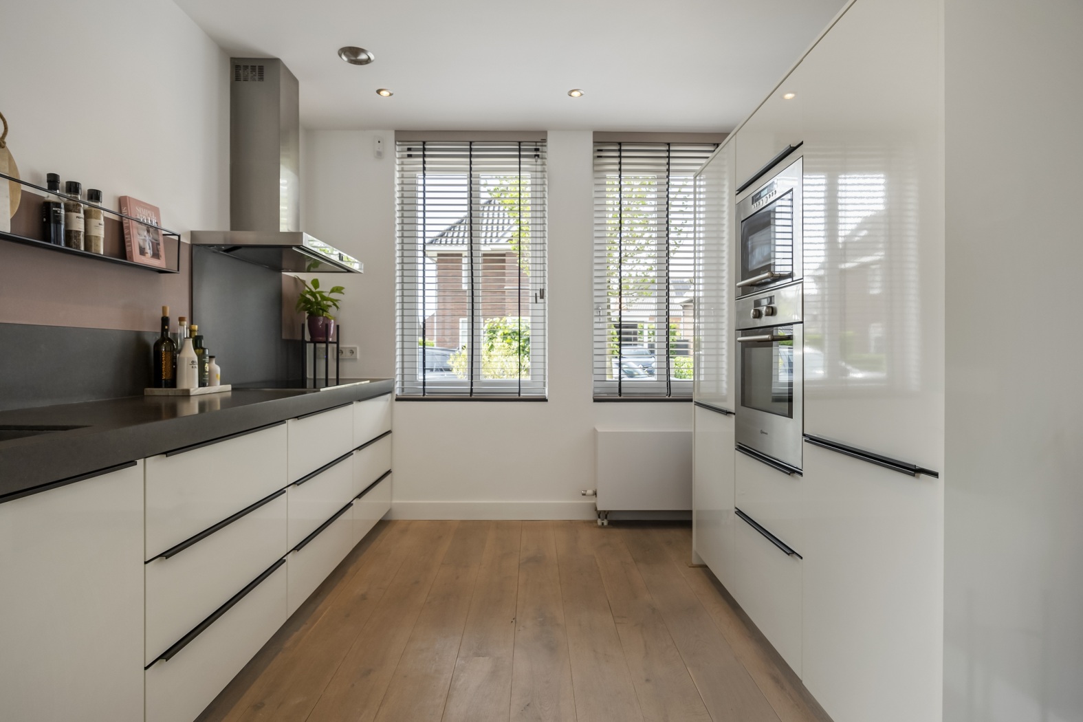 Aan de voorzijde van de woning bevindt zich de halfopen keuken – een perfecte mix van stijl en functionaliteit, met twee ramen die zorgen voor prettig daglicht. De keuken is strak ingericht met een recht blok zonder bovenkastjes, wat zorgt voor een ruimtelijk effect, en een apparatenwand aan de overzijde.
