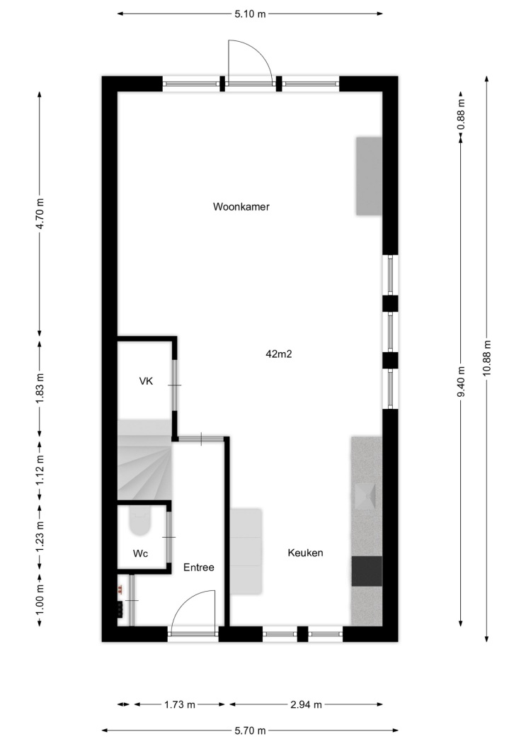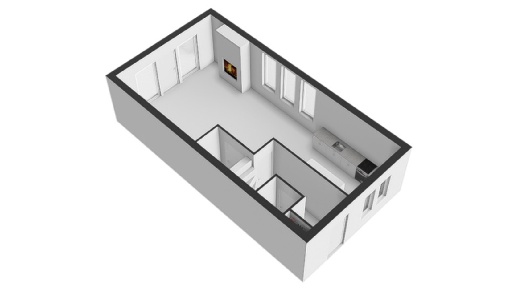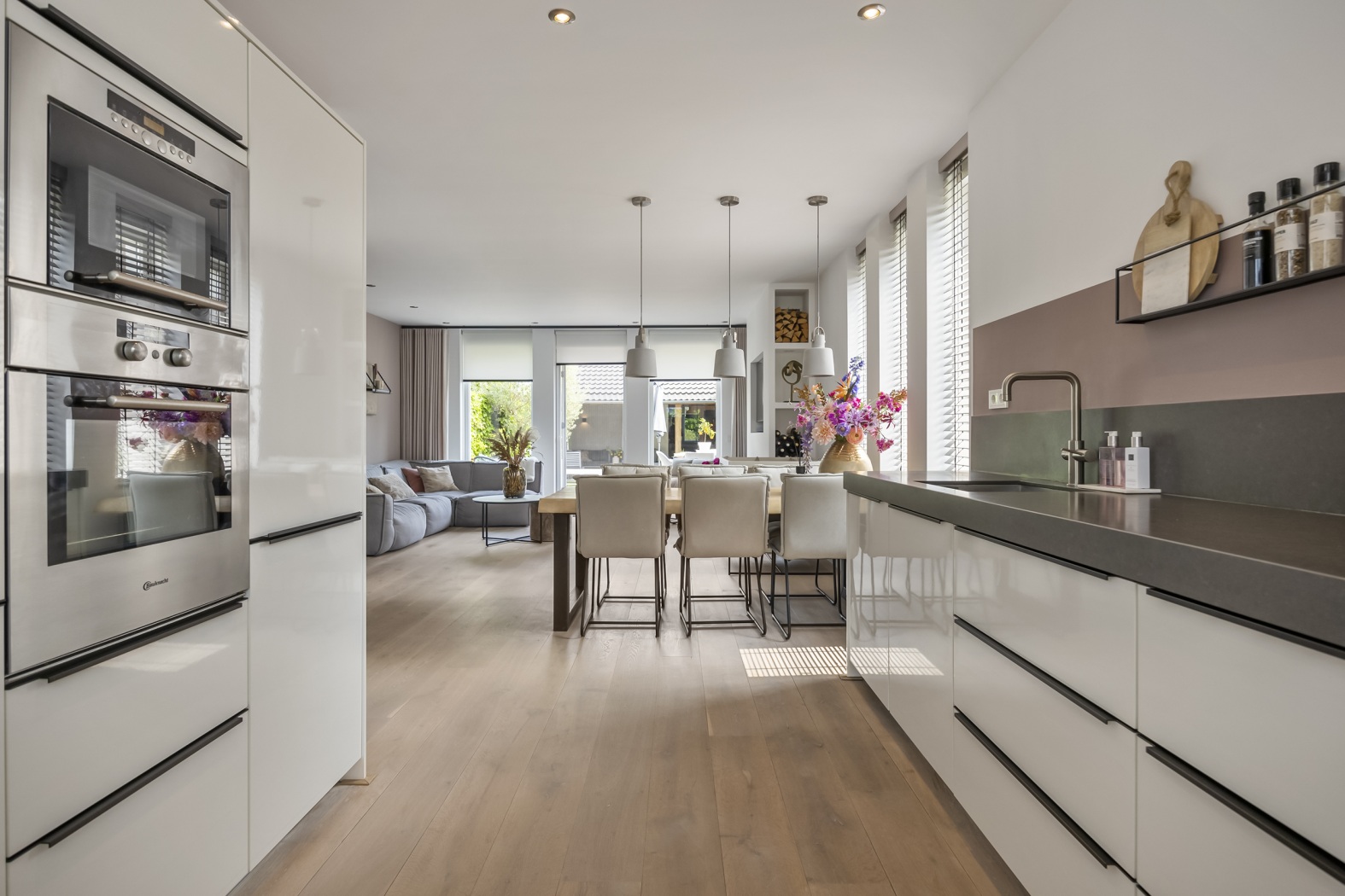 Aan de voorzijde van de woning bevindt zich de halfopen keuken – een perfecte mix van stijl en functionaliteit, met twee ramen die zorgen voor prettig daglicht. De keuken is strak ingericht met een recht blok zonder bovenkastjes, wat zorgt voor een ruimtelijk effect, en een apparatenwand aan de overzijde.