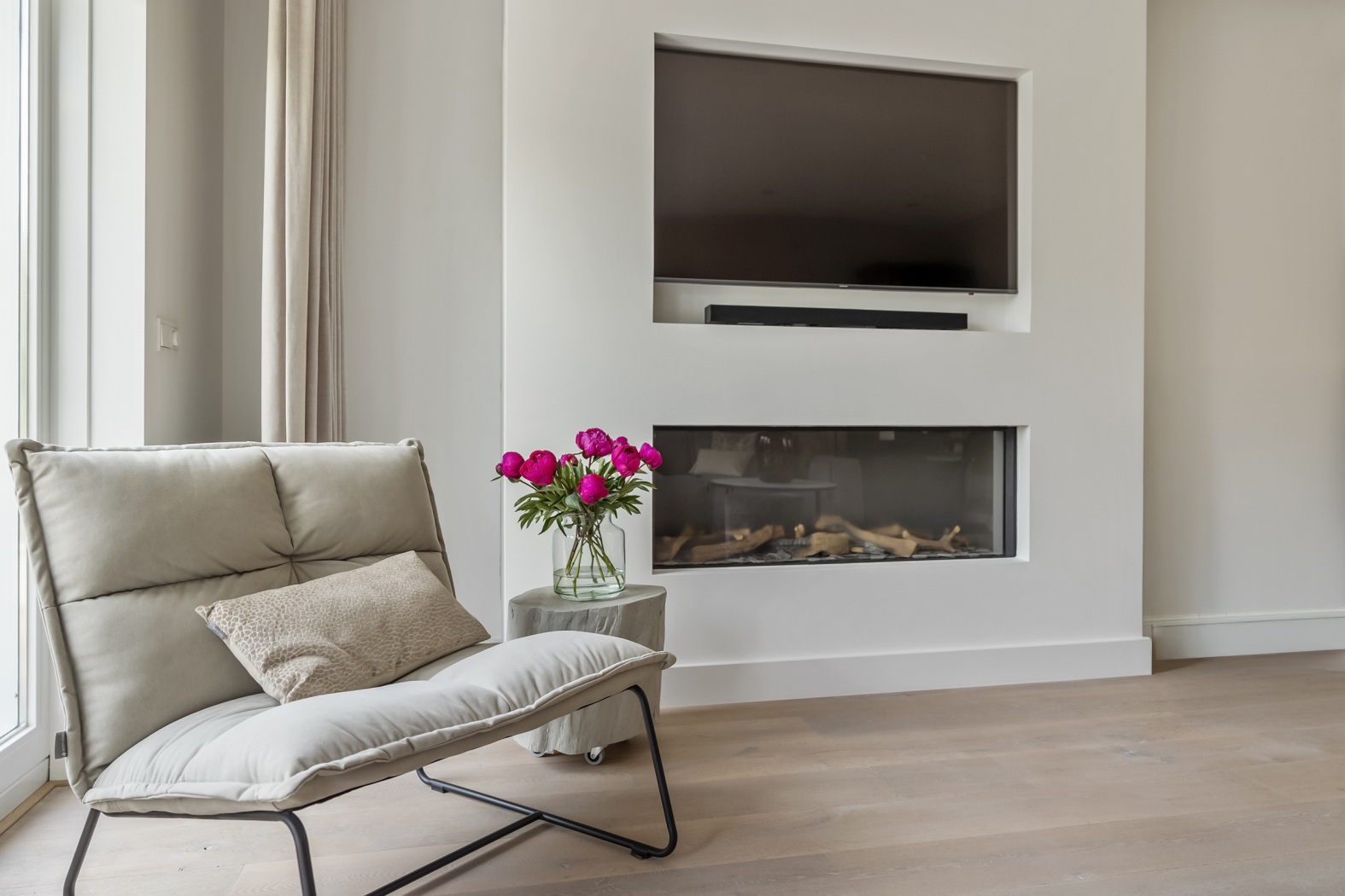 De royale woonkamer en open keuken – samen goed voor maar liefst 42 m² leefruimte – vormen een harmonieuze en sfeervolle leefomgeving waarin comfort en stijl moeiteloos samenkomen. Absolute blikvanger is de op maat gemaakte cinewall met moderne gashaard, subtiel geïntegreerd in het interieur. Deze stijlvolle wand is niet alleen functioneel met een verborgen bergkast voor apparatuur, maar ook sfeervol dankzij de decoratieve nisjes, waarvan één met geïntegreerde verlichting voor extra ambiance.