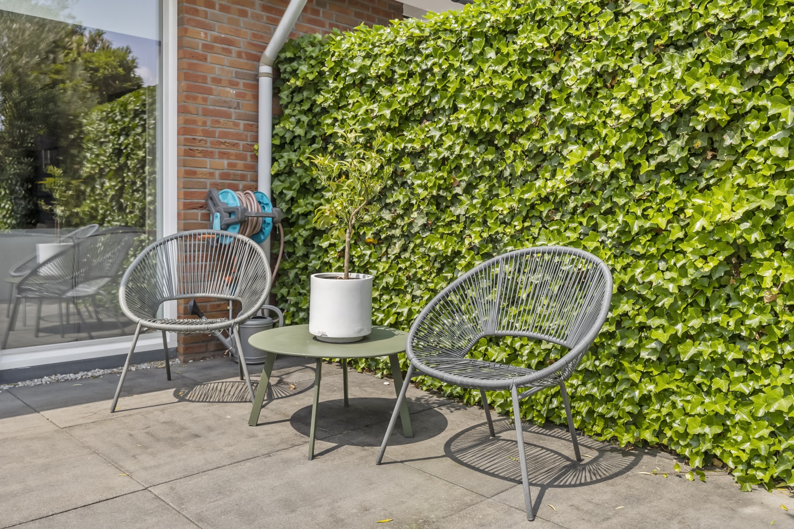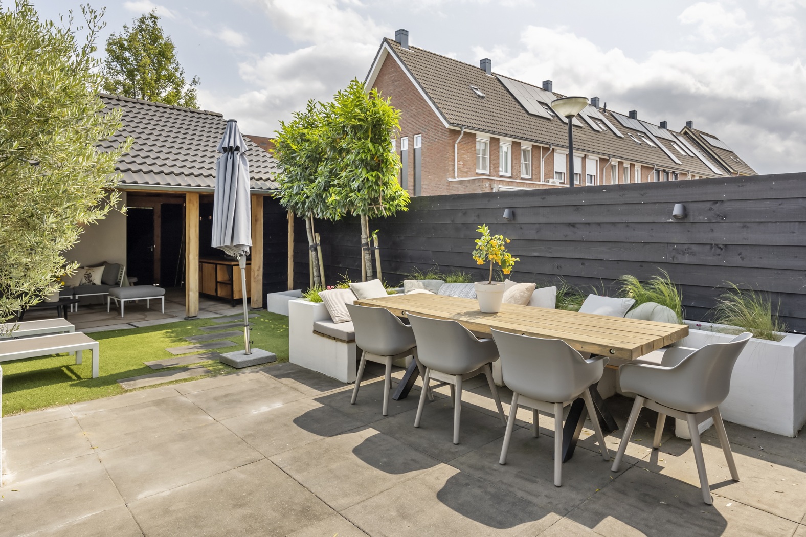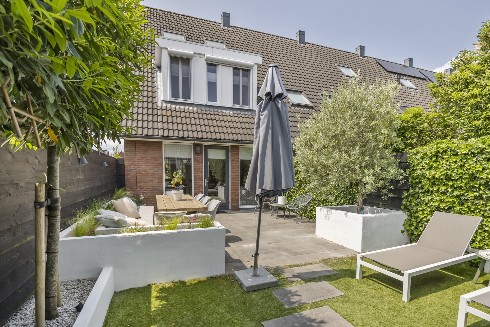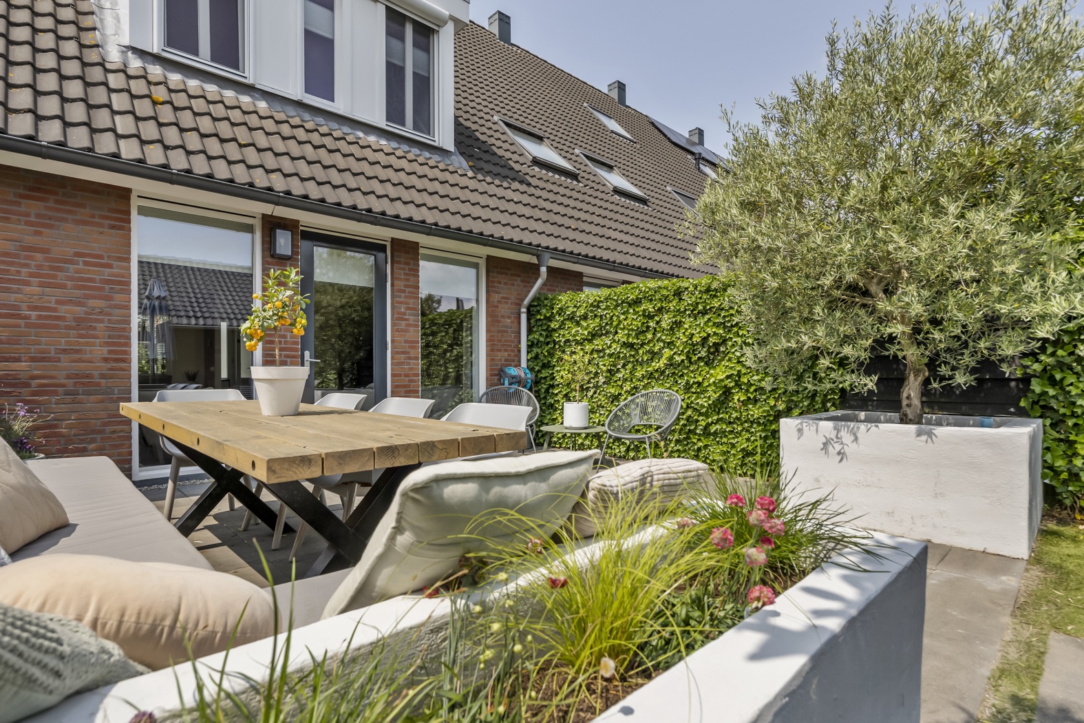 De fraai aangelegde tuin straalt een zonnige, mediterrane sfeer uit en ligt op een royaal perceel van 170 m². Dankzij de hoekligging, het brede pad naast de woning aan de zuidzijde en het ontbreken van bebouwing aan de achterzijde, is de tuin de hele dag verrassend zonnig.