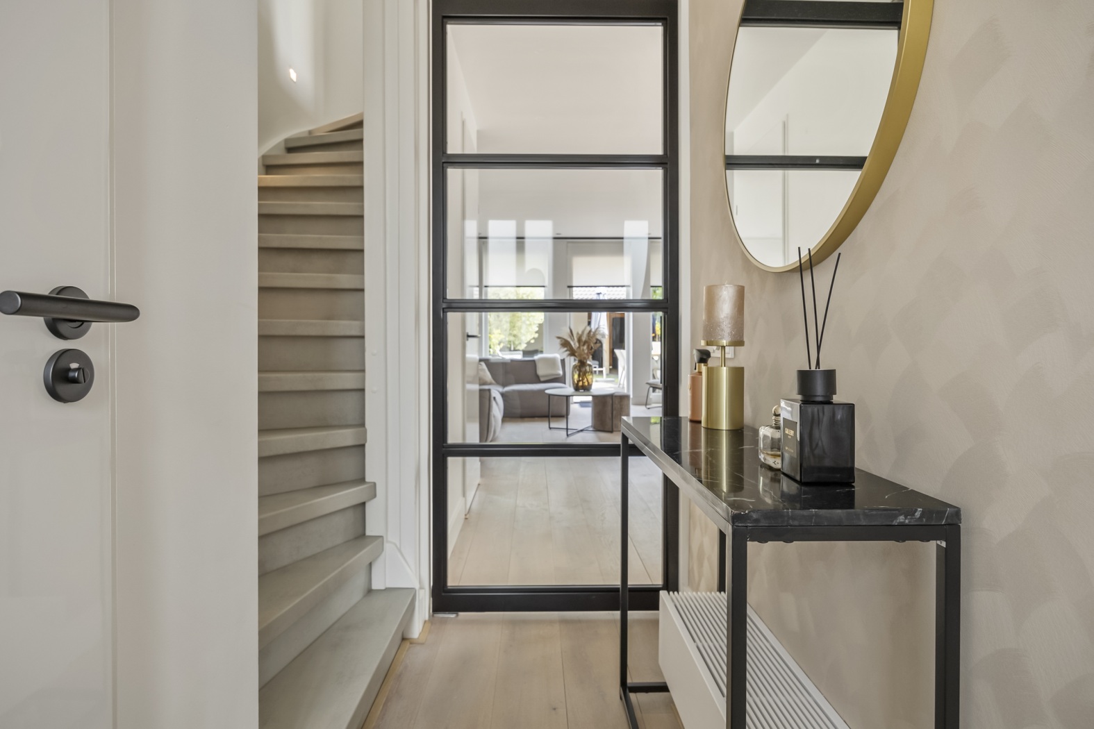 Een warm welkom en een smaakvol voorproefje van de rest van de woning. De entreehal maakt indruk met z’n elegante inrichting waar alles klopt: een modern afgewerkt toilet, een vernieuwde meterkast en een strak uitgevoerde trapopgang met stijlvolle trap spots, een vernieuwde trapbekleding en elegante stalen leuningen. De eikenhouten vloer geeft direct een warme en karaktervolle uitstraling, terwijl de imposante stalen taatsdeur naar de woonkamer zorgt voor een eigentijdse, luxe touch. De woning is bovendien voorzien van een professioneel alarmsysteem, voor extra comfort en veiligheid.