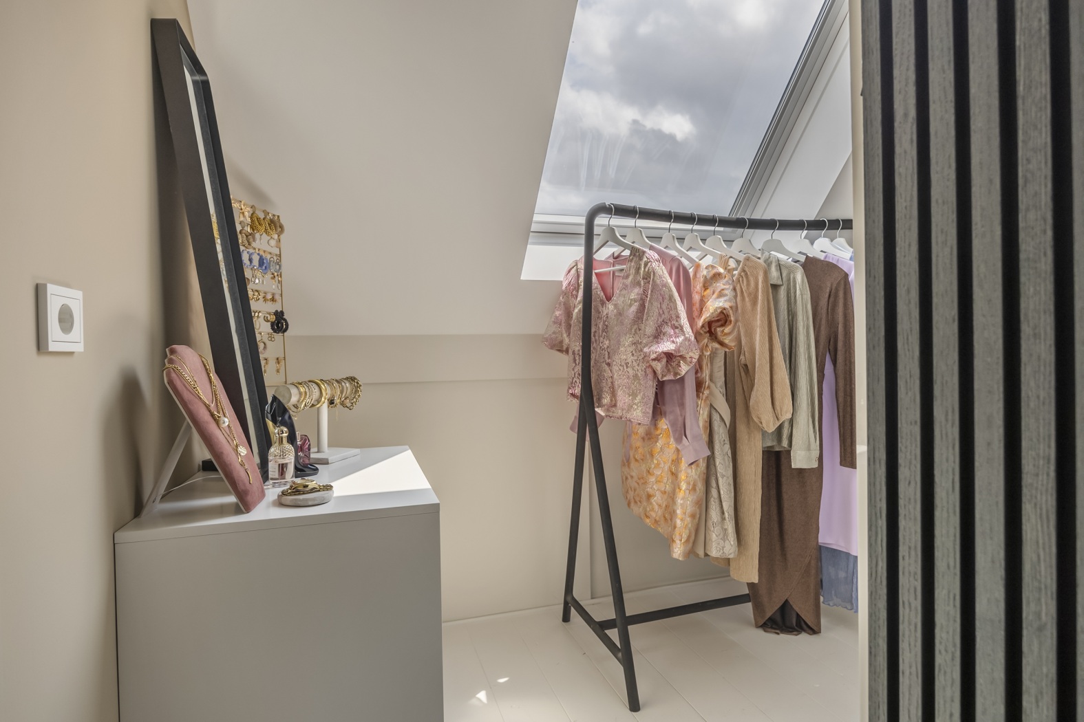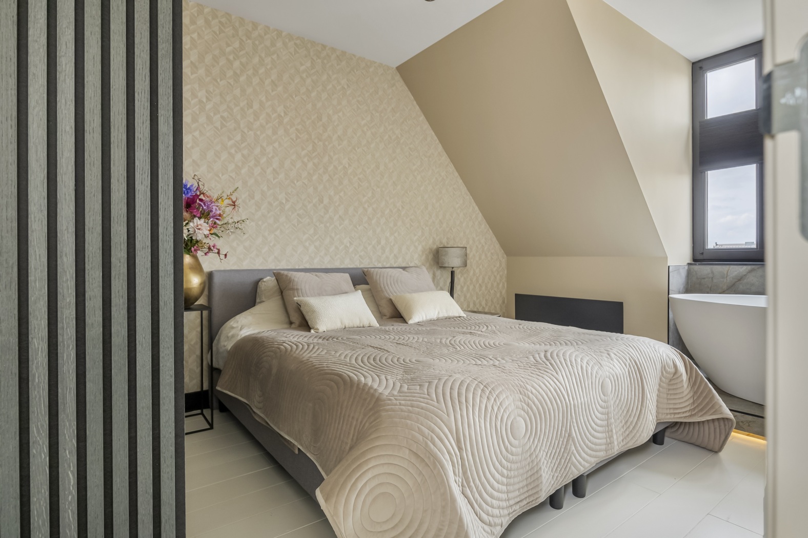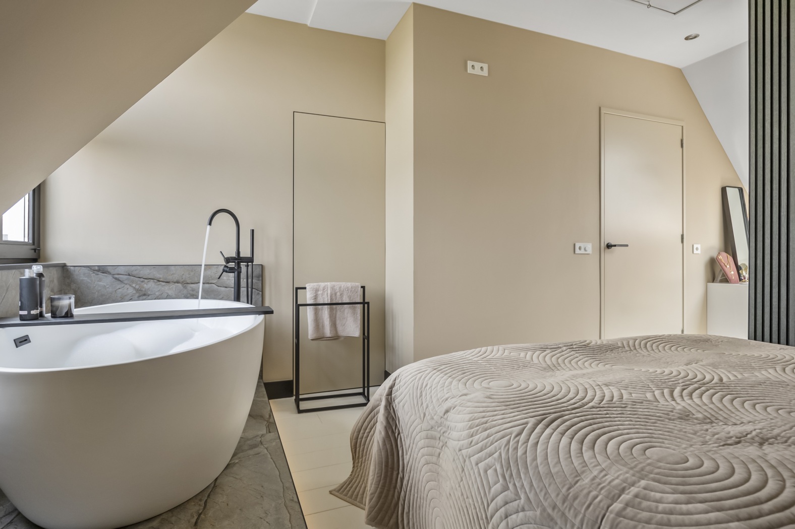 De master suite heeft de allure van een hotelsuite met dakkapel is een stijlvolle en serene plek om te ontspannen. Een echte eyecatcher is het grote vrijstaande bad, subtiel omlijst met tegelwerk en een sfeervolle ledstrip (2023). Aangrenzend vind je een praktische walk-in closet, opgebouwd uit een verplaatsbare kast die is bekleed met wandpanelen, voorzien van verlichting en die achterblijft bij de verkoop. Ook in deze ruimte is aan ieder verfijnd detail gedacht. De vloer, plinten en het behang zijn overal doorgelegd, waardoor de ruimte flexibel in te delen is. Ook is er een inzethor aanwezig voor het raam in de dakkapel.