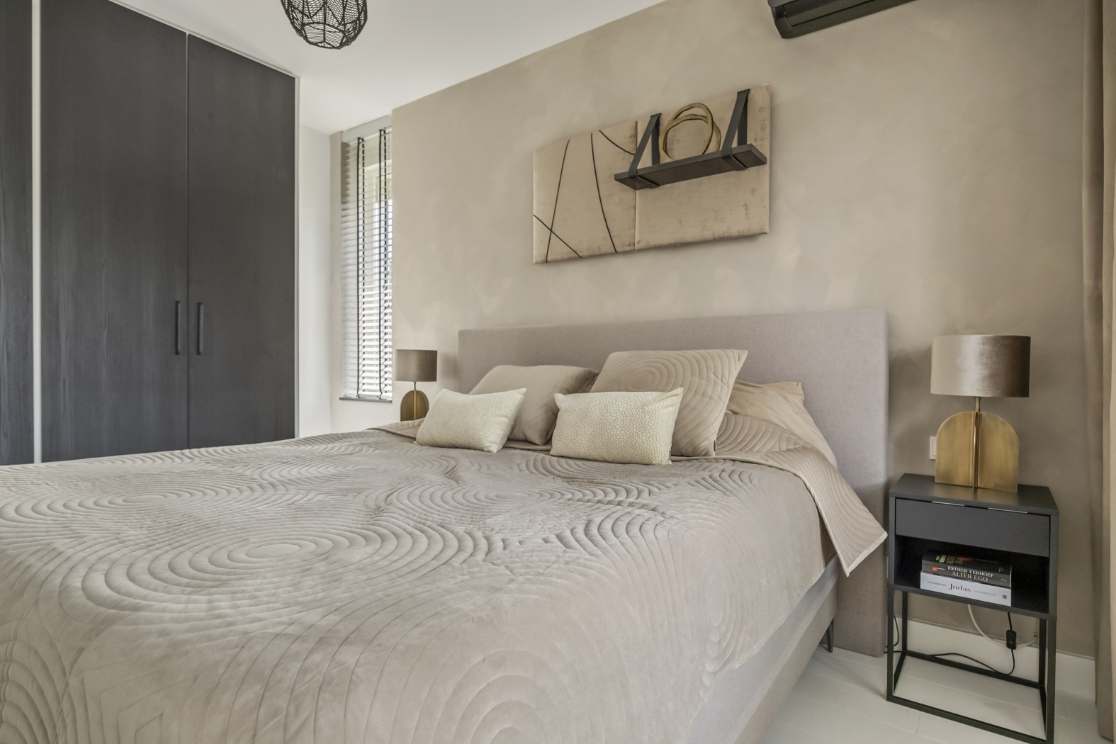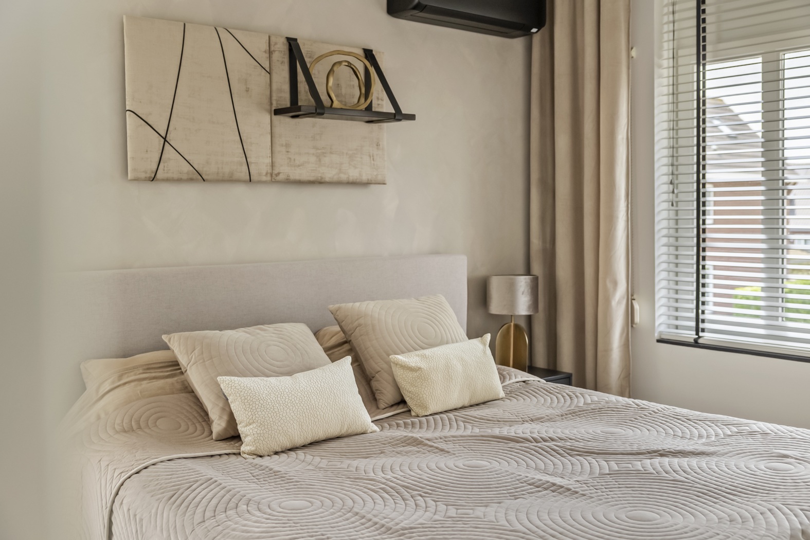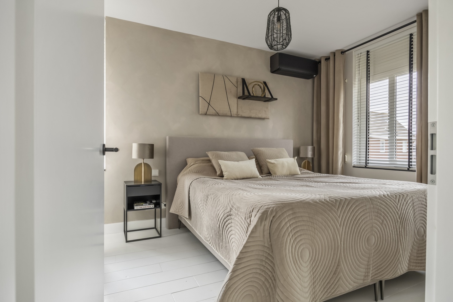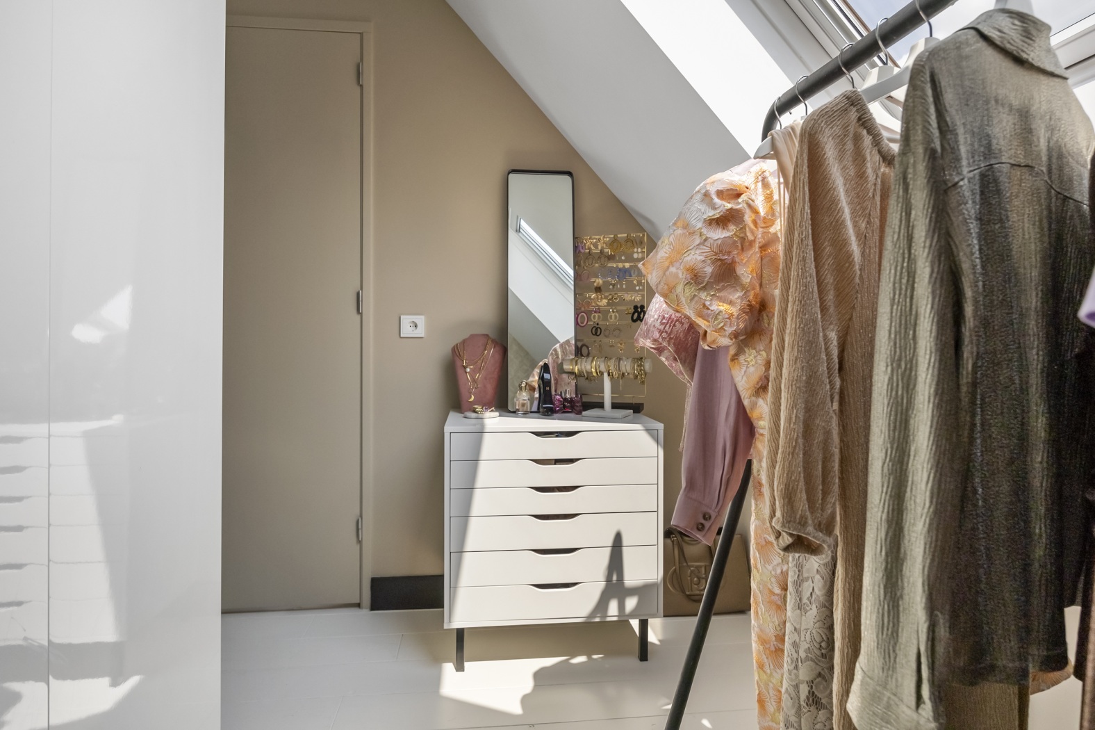 De master suite heeft de allure van een hotelsuite met dakkapel is een stijlvolle en serene plek om te ontspannen. Een echte eyecatcher is het grote vrijstaande bad, subtiel omlijst met tegelwerk en een sfeervolle ledstrip (2023). Aangrenzend vind je een praktische walk-in closet, opgebouwd uit een verplaatsbare kast die is bekleed met wandpanelen, voorzien van verlichting en die achterblijft bij de verkoop. Ook in deze ruimte is aan ieder verfijnd detail gedacht. De vloer, plinten en het behang zijn overal doorgelegd, waardoor de ruimte flexibel in te delen is. Ook is er een inzethor aanwezig voor het raam in de dakkapel.