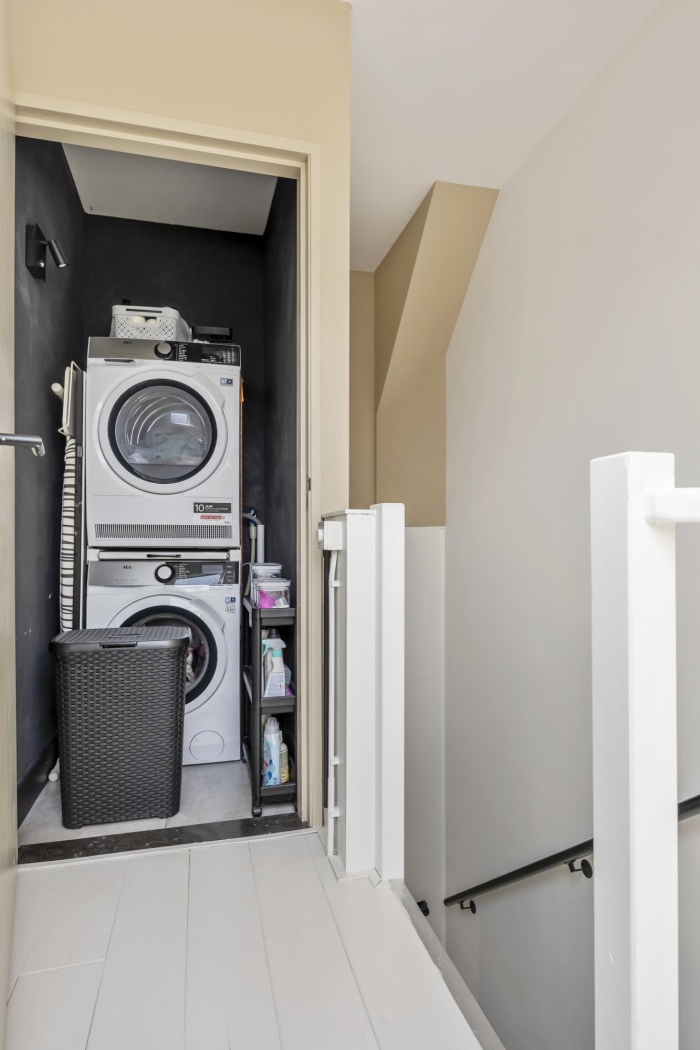 Je komt boven op een overloop met toegang tot een net betegelde wasruimte, voorzien van een dubbele groep voor wasmachine en droger – zodat beide tegelijk kunnen draaien.