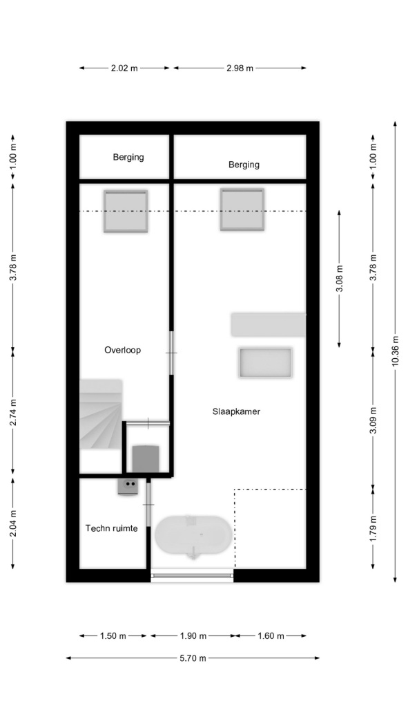 Onder de schuine kanten bevinden zich knieschotten voor extra bergruimte. Verder is er een aparte technische ruimte met cv-ketel, mechanische ventilatie en extra opslagmogelijkheden.