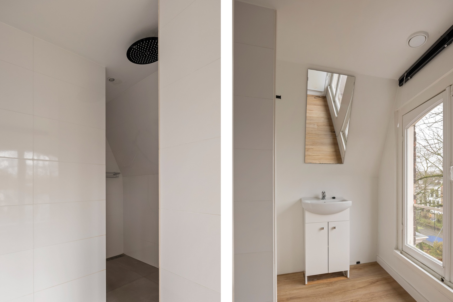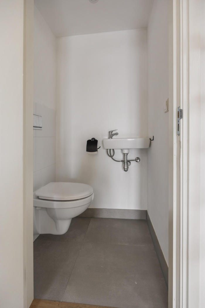 De ruime slaapkamer biedt voldoende ruimte voor een comfortabel bed. De badkamer is strak en modern afgewerkt, met een inloopdouche en wastafelmeubel. Het toilet is apart, wat extra comfort biedt.