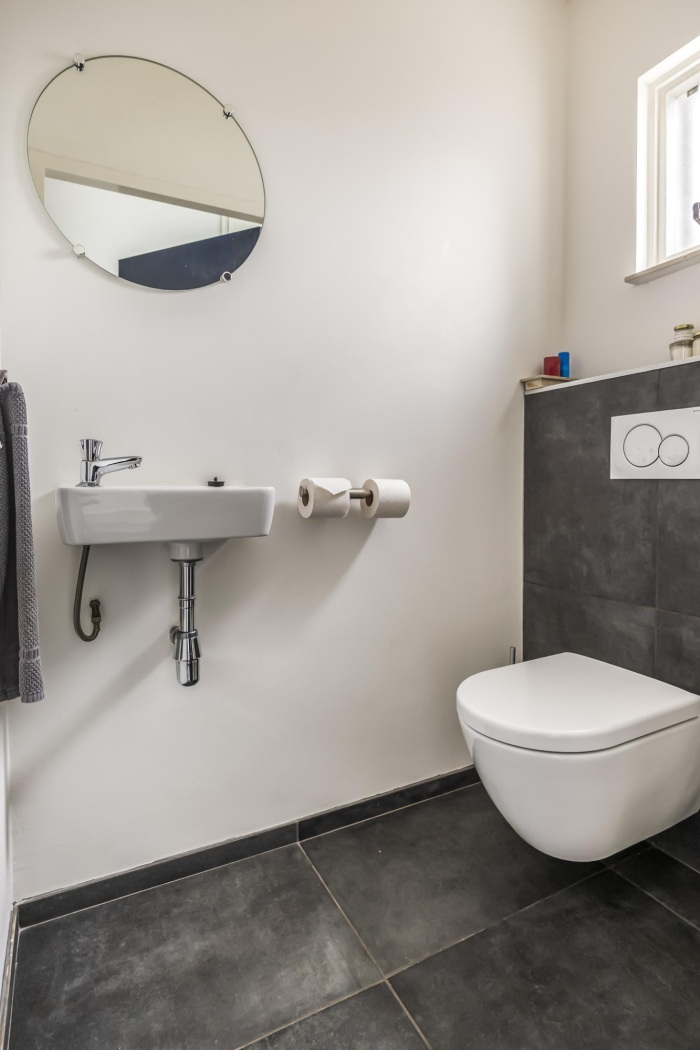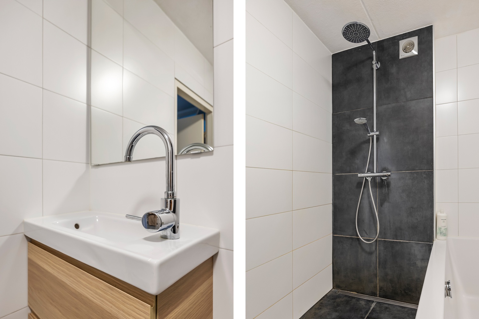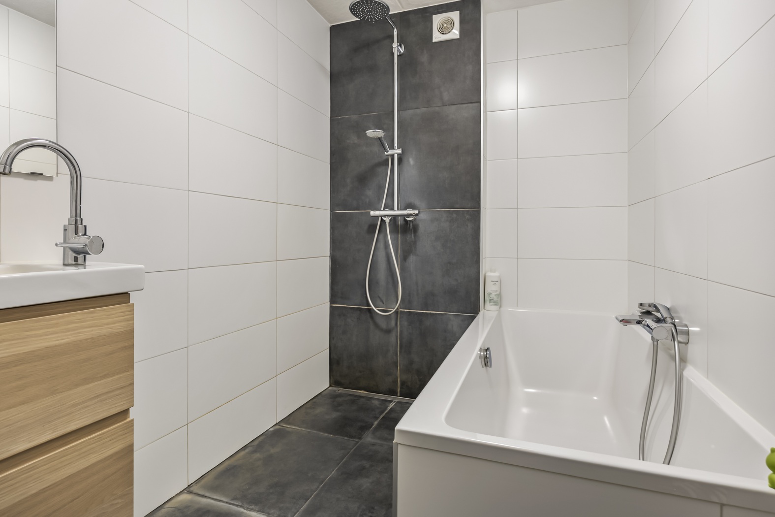 Op de eerste verdieping bevinden zich twee goed bemeten slaapkamers en een complete badkamer. De badkamer is uitgerust met een ligbad, inloopdouche en wastafel, comfortabel en praktisch. De verdieping is voorzien van kunststof kozijnen, wat zorgt voor extra onderhoudsgemak.