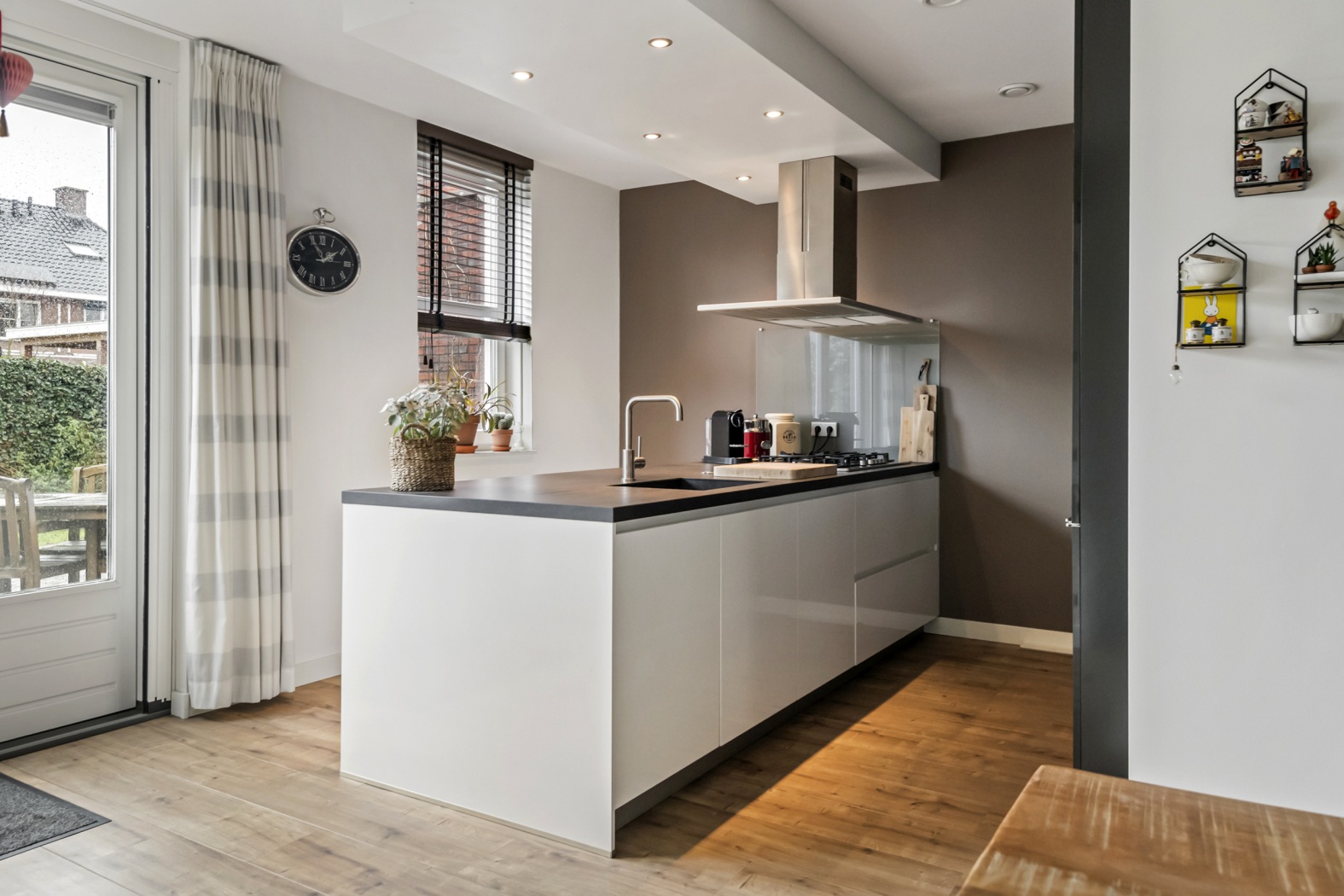 De moderne open keuken is strak uitgevoerd en voorzien van een spoel- en kookeiland en alle benodigde inbouwapparatuur. Via de openslaande deuren stap je zo de verzorgde achtertuin in, waar voldoende ruimte is voor een ontspannen zitplek om heerlijk van buiten te genieten.