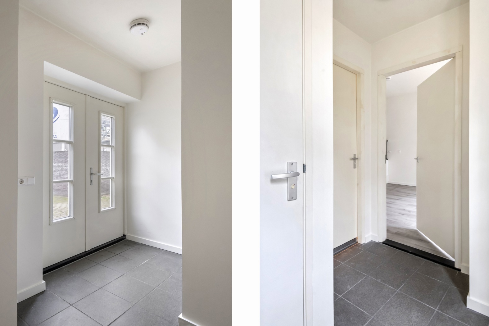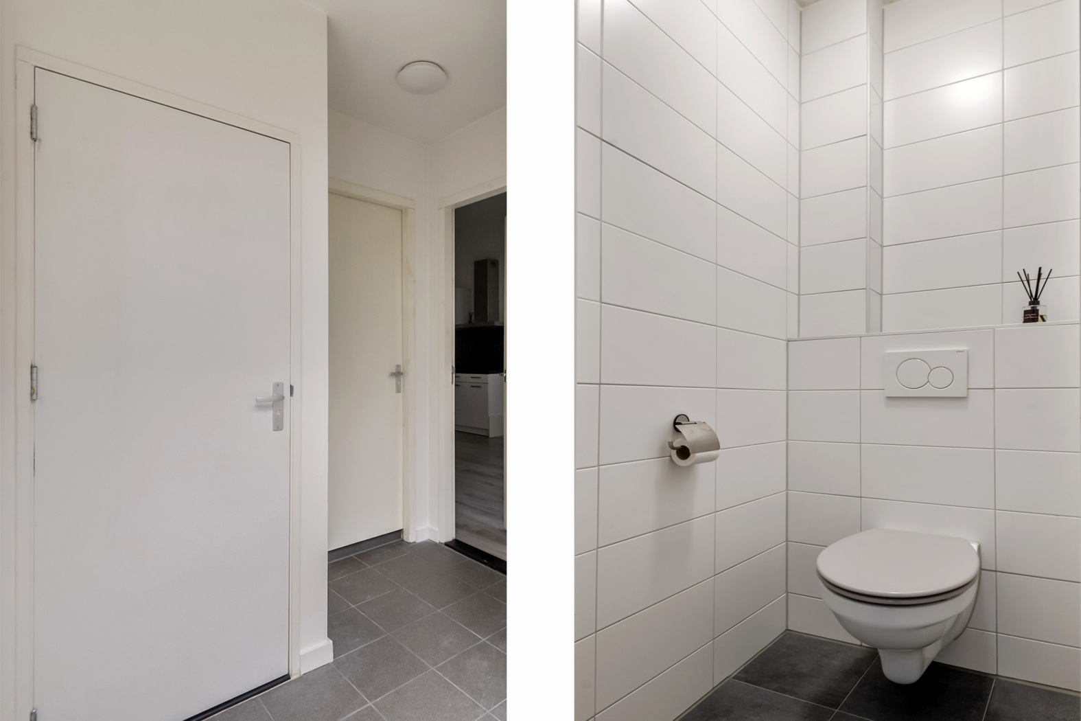 Via de dubbele openslaande deuren stap je binnen in de hal, waar een stijlvolle donkere plavuizenvloer je meteen verwelkomt. Vanuit hier heb je toegang tot het moderne, zwevende toilet, de frisse badkamer en natuurlijk de gezellige woonkamer.