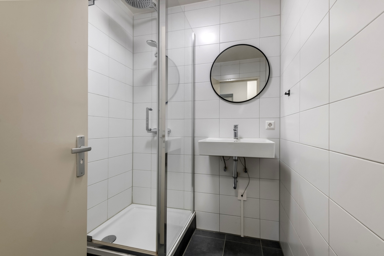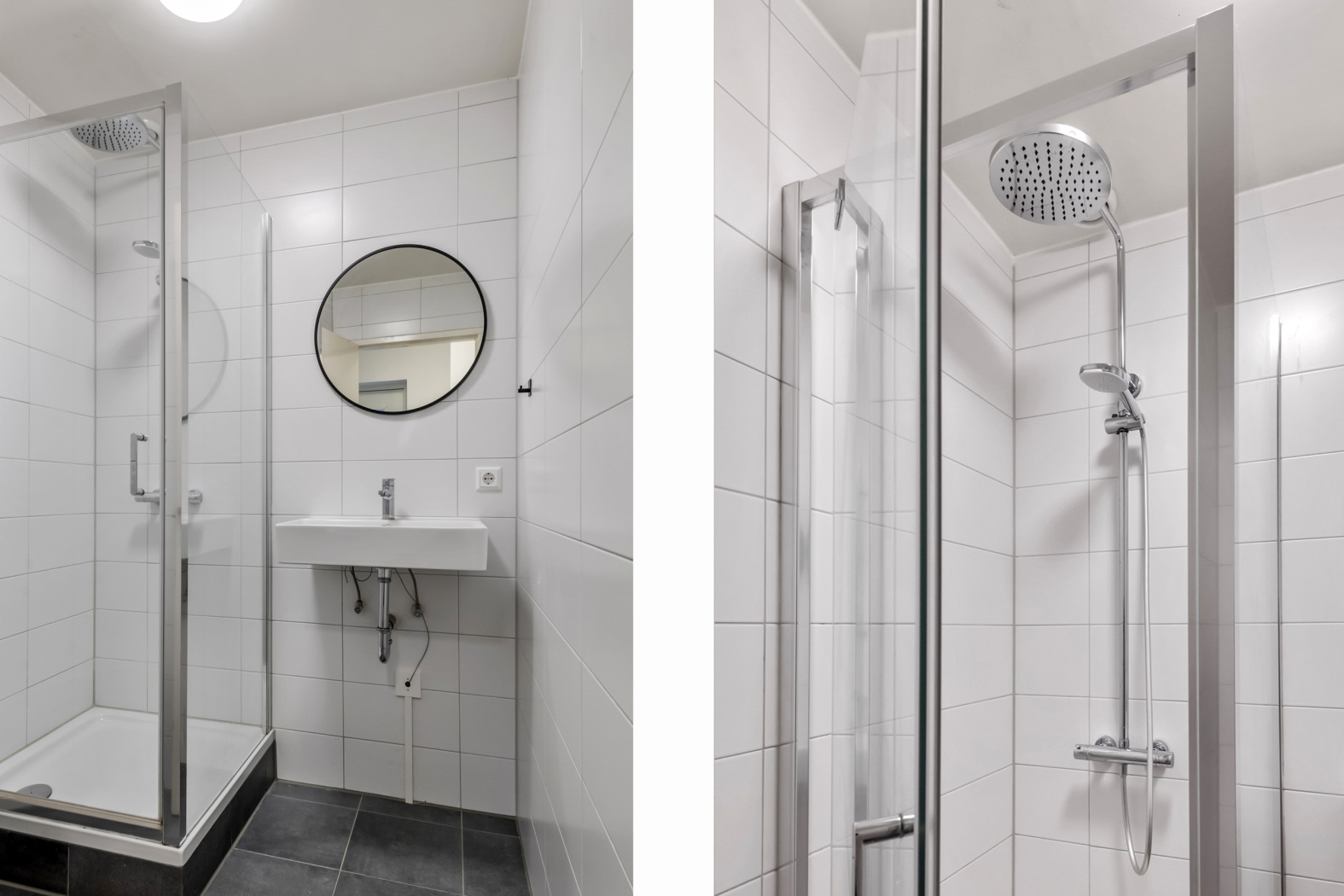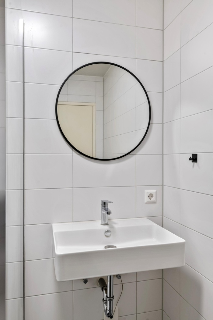 Vanuit de hal bereik je de badkamer, die is uitgerust met een moderne douchecabine met zowel een regendouche als een handdouche. De wastafel wordt sfeervol aangevuld met een ronde spiegel. De ruimte is volledig betegeld met frisse witte wandtegels en stijlvolle, donker gekleurde vloertegels, wat zorgt voor een strakke en eigentijdse uitstraling.