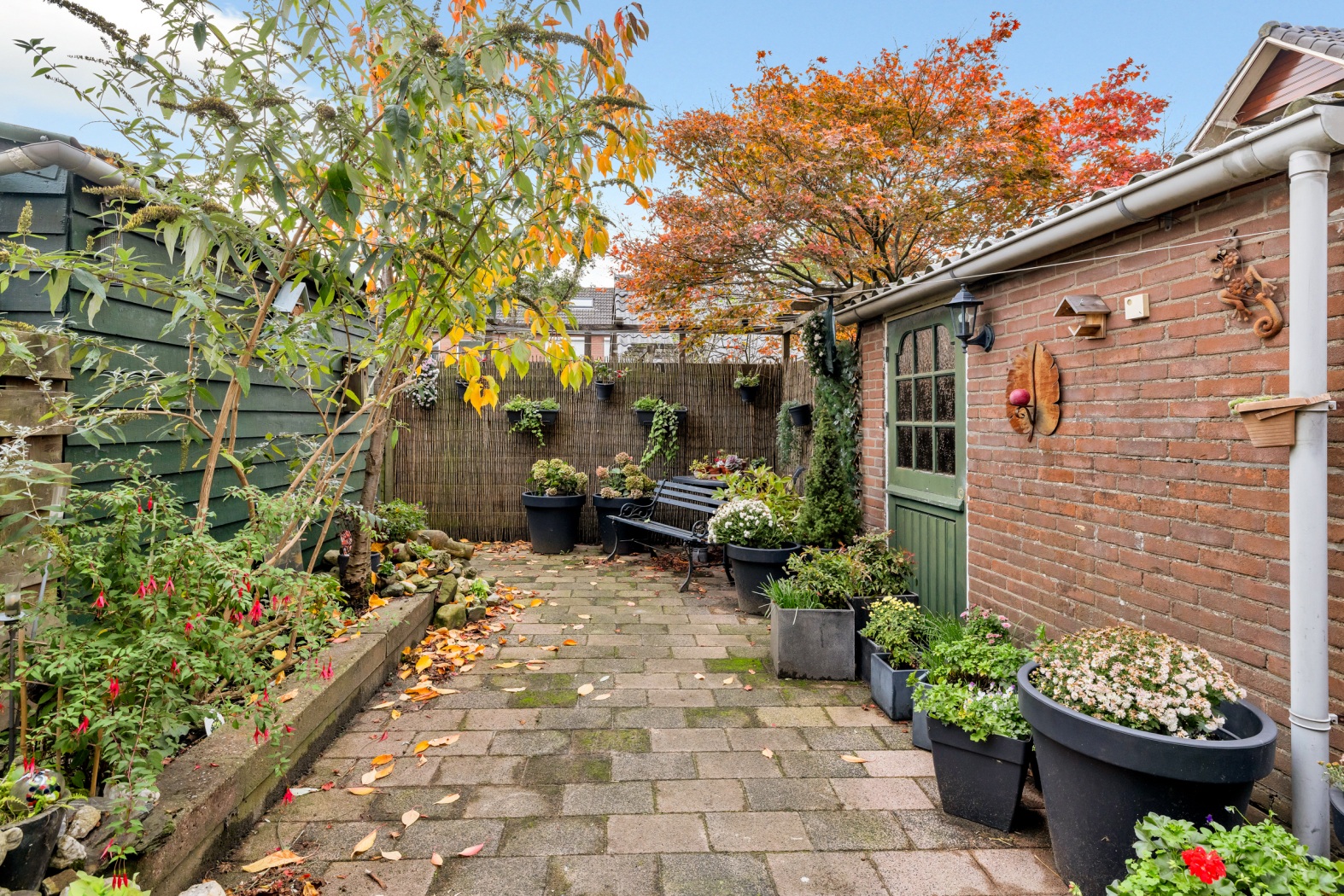 De tuin op het westen is verzorgd aangelegd met bestrating en groene borders. Aan de achtergevel bevindt zich een fijn terras met zonnescherm, waar je tot laat op de dag van de zon kunt genieten. Achterin de tuin staat een stenen berging, ideaal voor het opbergen van fietsen en tuingereedschap.