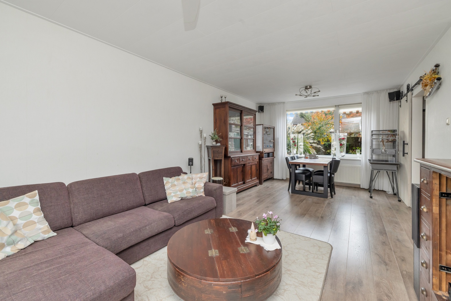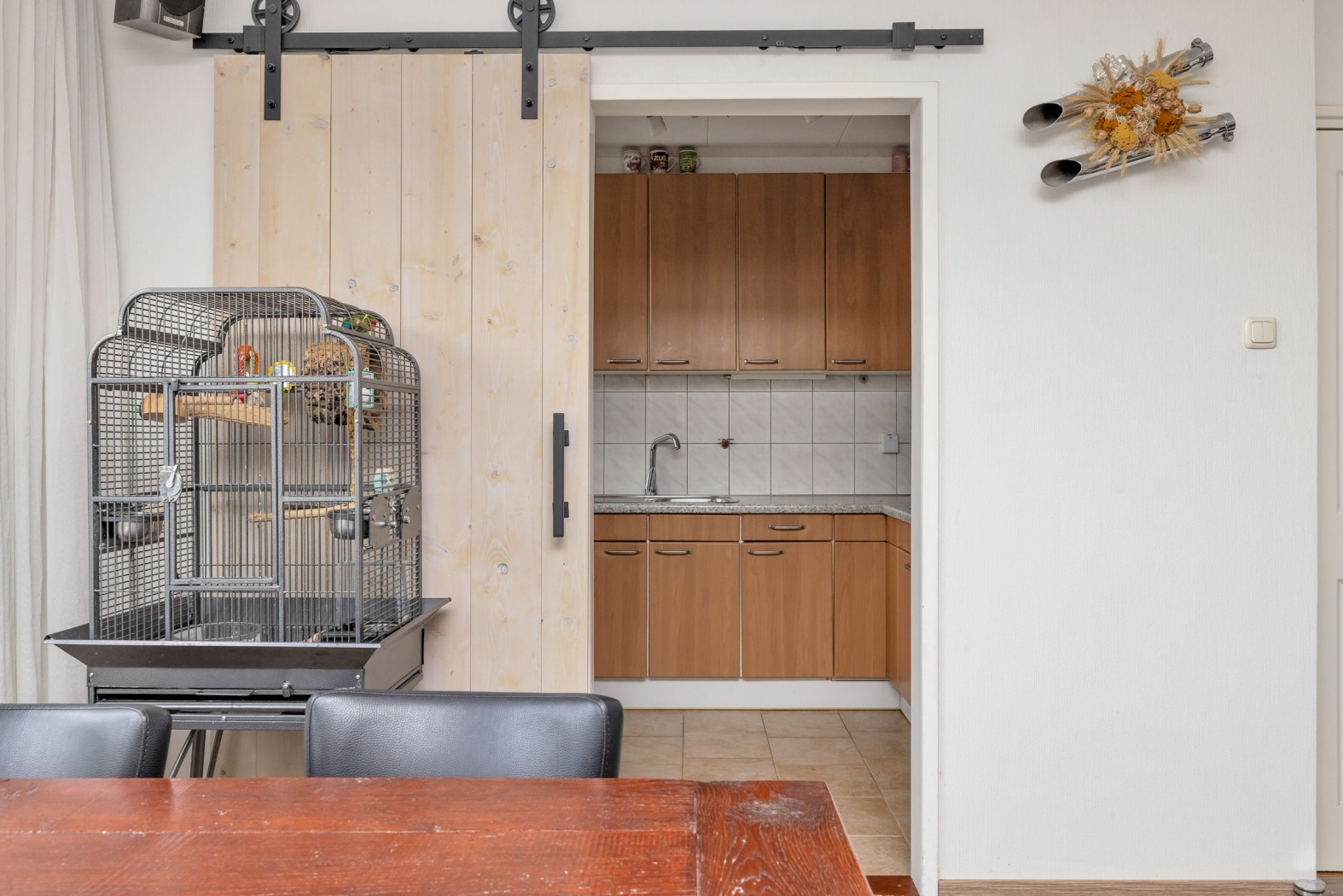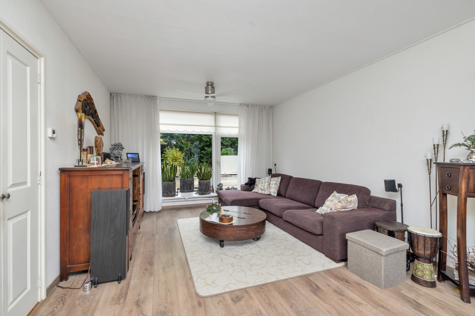 De lichte doorzon woonkamer heeft grote ramen en kijkt prettig uit op de tuin. Via een stoere schuifdeur aan een railsysteem bereik je de hoekkeuken, die is voorzien van inbouwapparatuur. Daarnaast is de woning uitgerust met rolluiken, airconditioning en een groot zonnescherm voor extra comfort.