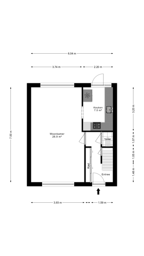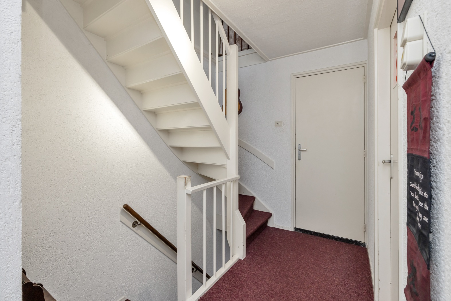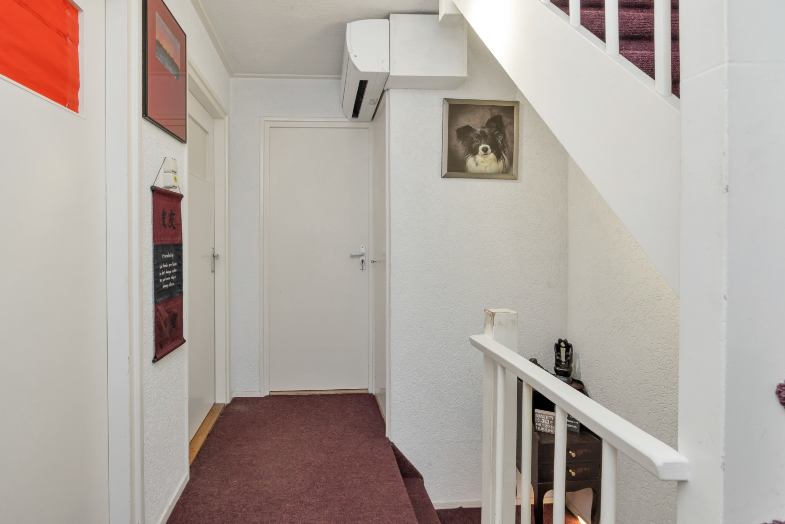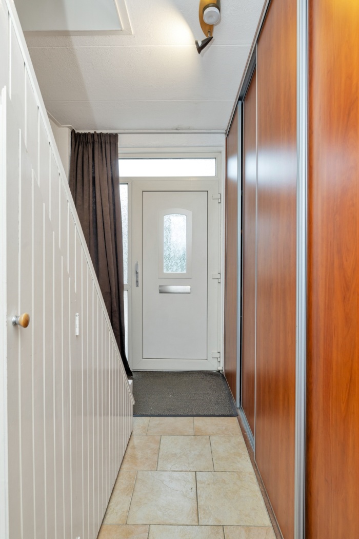 De entree verleent toegang tot de woonkamer, de toiletruimte, de meterkast, trapkast, kasten en de trapopgang naar de verdieping.
