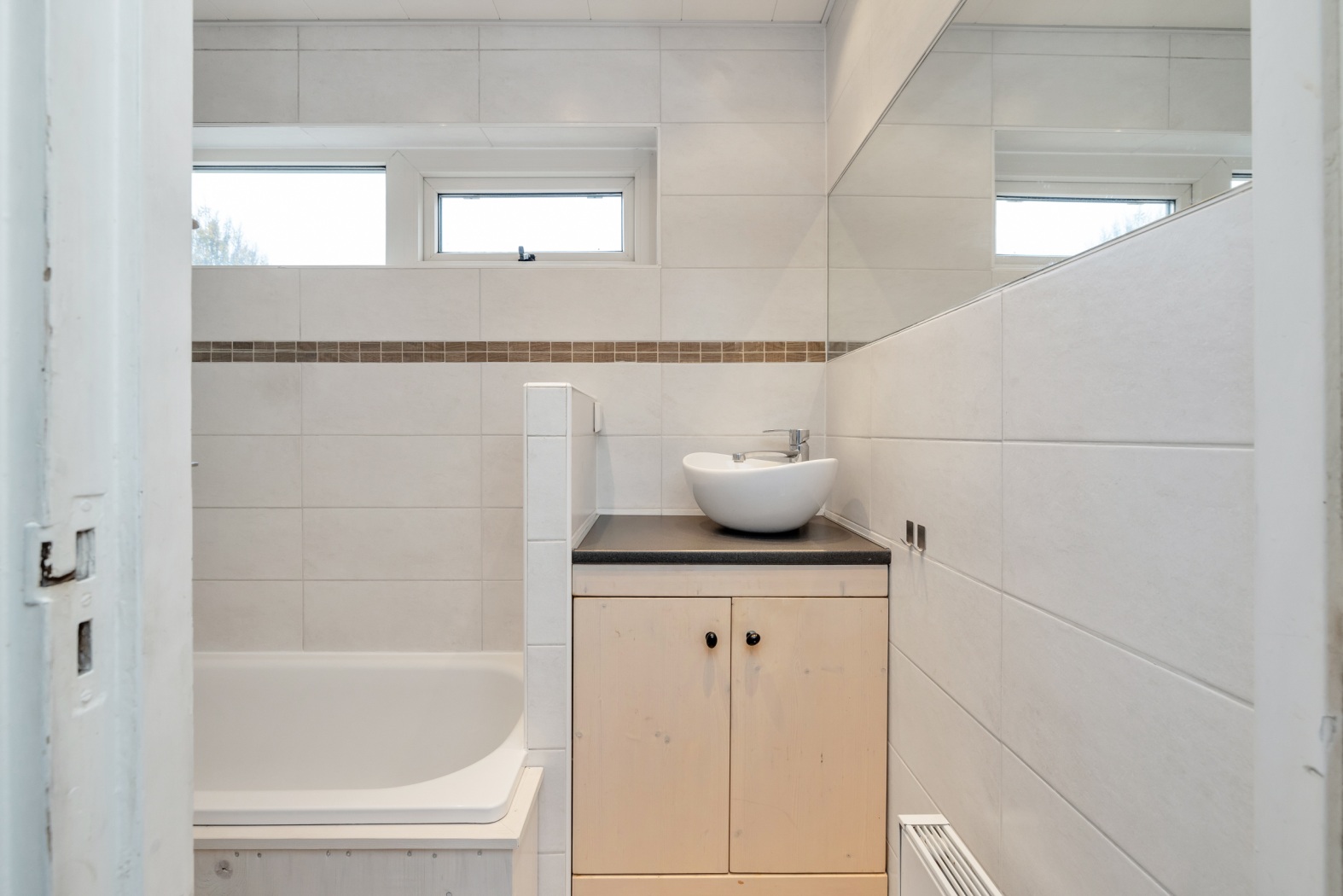 De compacte badkamer is voorzien van een zitbad met douche mogelijkheid en een wastafelmeubel.