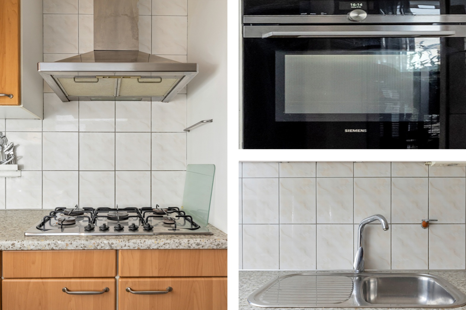 De keuken is uitgevoerd in een warme houttint en voorzien van alle benodigde apparatuur, waaronder een 5-pits kookplaat, RVS afzuigkap, combi-oven, koel-/vriescombinatie en een recent vernieuwde vaatwasser. Vanuit de keuken is er een deur naar de tuin voor directe toegang tot het terras.