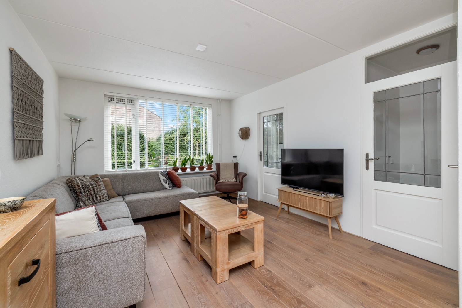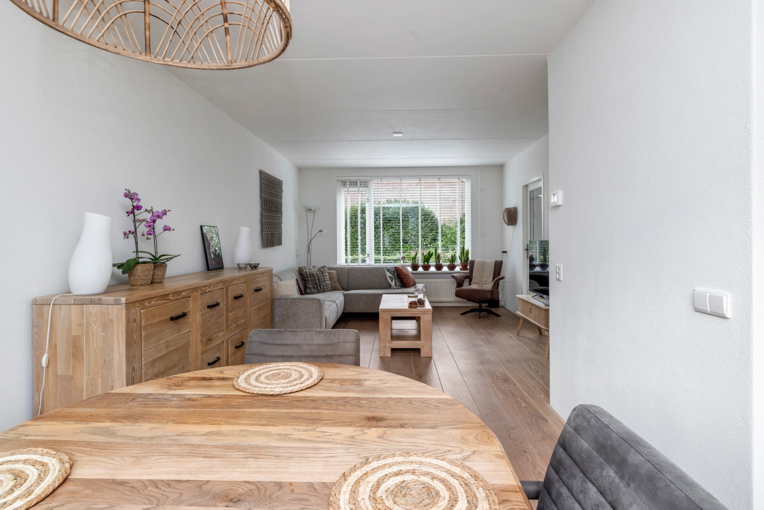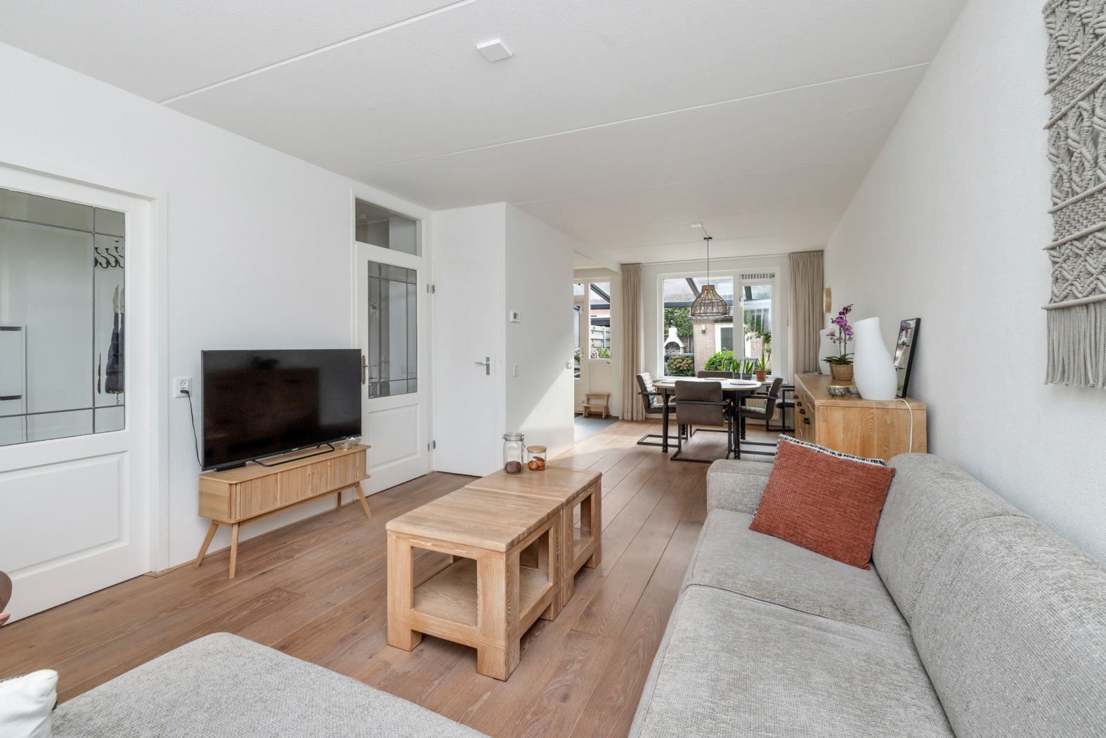 De lichte woonkamer beschikt over grote raampartijen aan zowel de voor- als achterzijde, waardoor er veel daglicht binnenvalt. Aan de voorzijde bevindt zich het zitgedeelte met uitzicht op de singel, terwijl aan de achterzijde ruimte is voor een eettafel met zicht op de tuin. De houten vloer en de praktische trapkast zorgen voor een warme en functionele leefruimte.