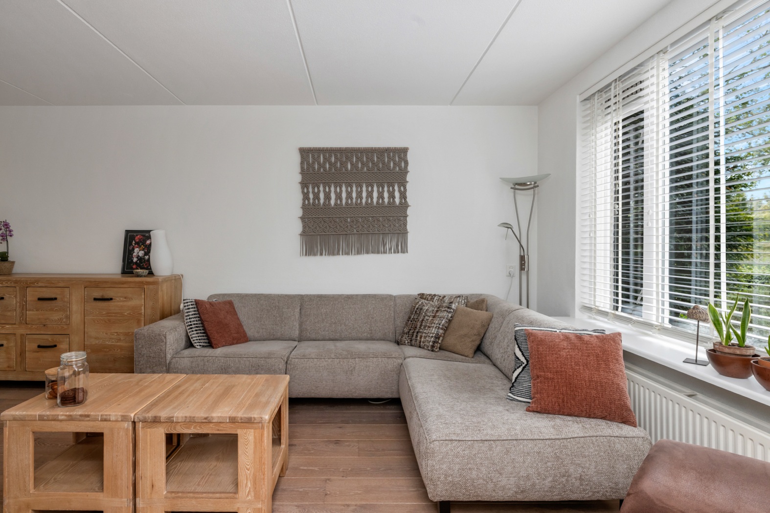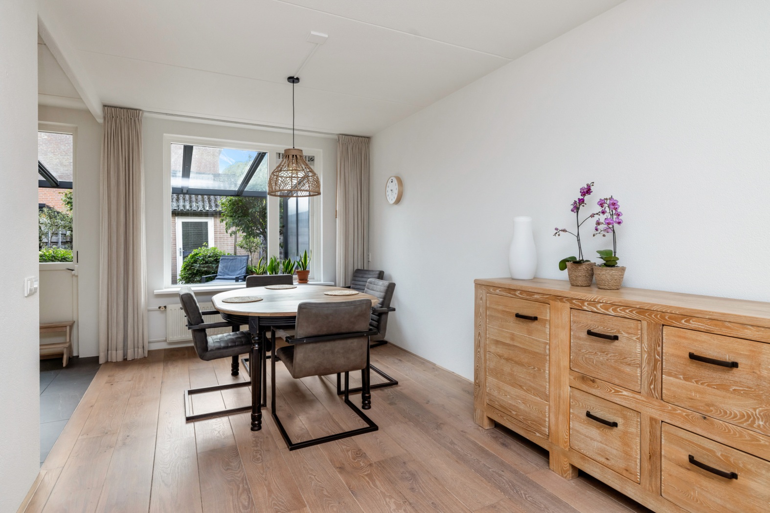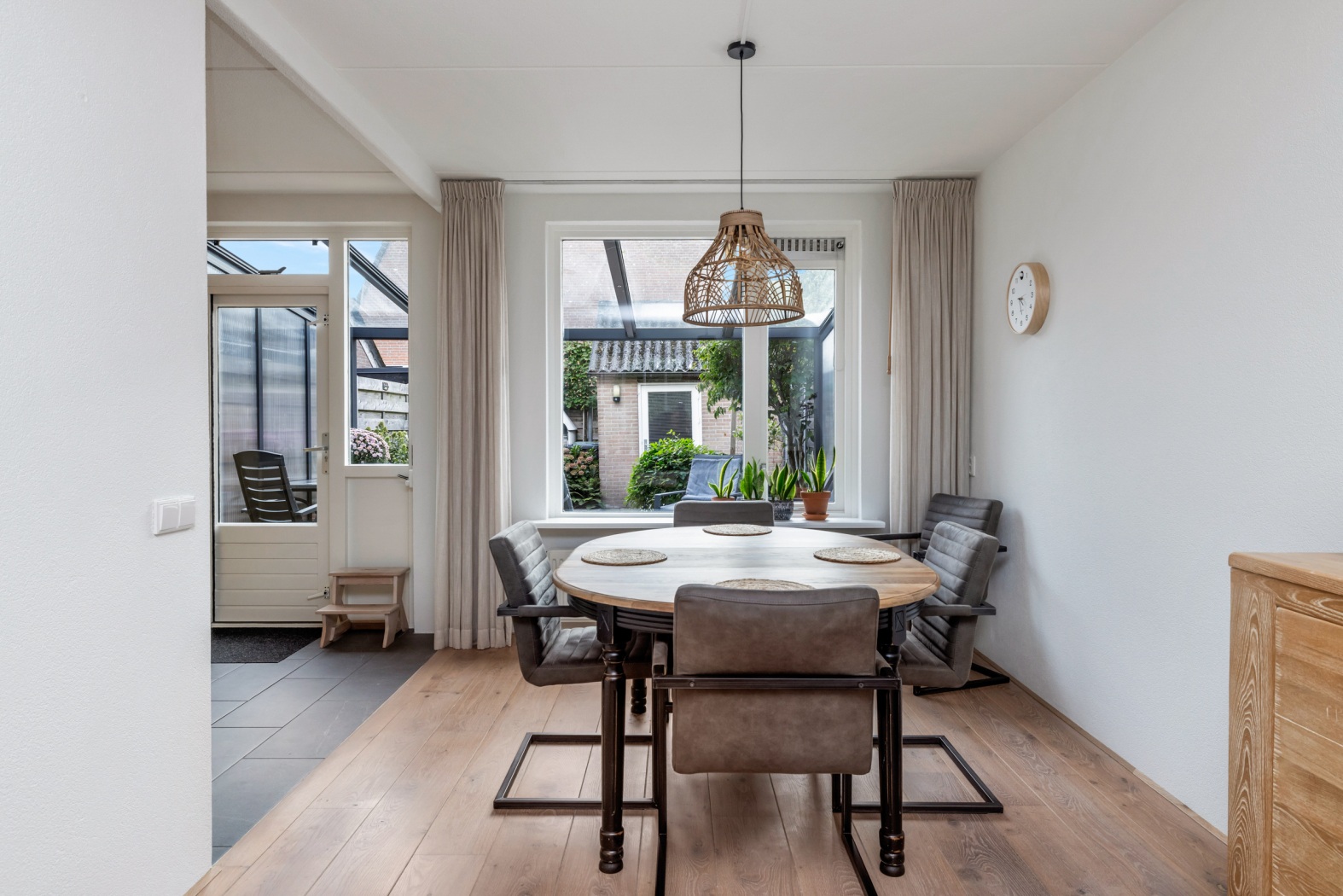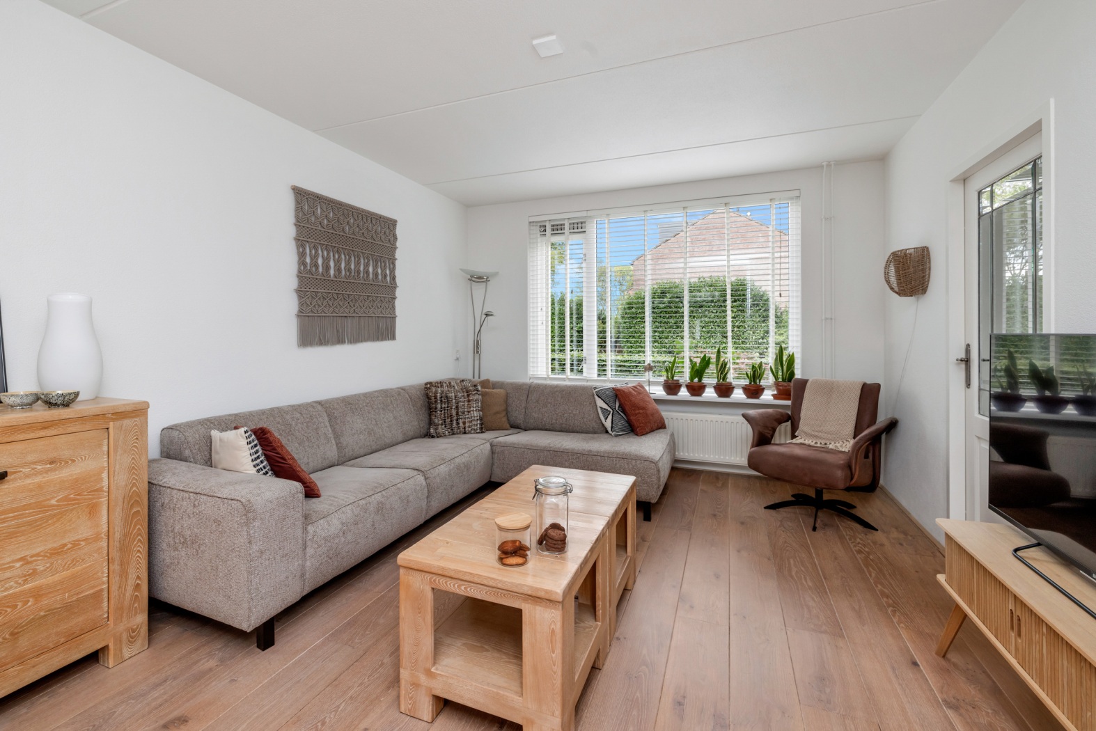 De lichte woonkamer beschikt over grote raampartijen aan zowel de voor- als achterzijde, waardoor er veel daglicht binnenvalt. Aan de voorzijde bevindt zich het zitgedeelte met uitzicht op de singel, terwijl aan de achterzijde ruimte is voor een eettafel met zicht op de tuin. De houten vloer en de praktische trapkast zorgen voor een warme en functionele leefruimte.