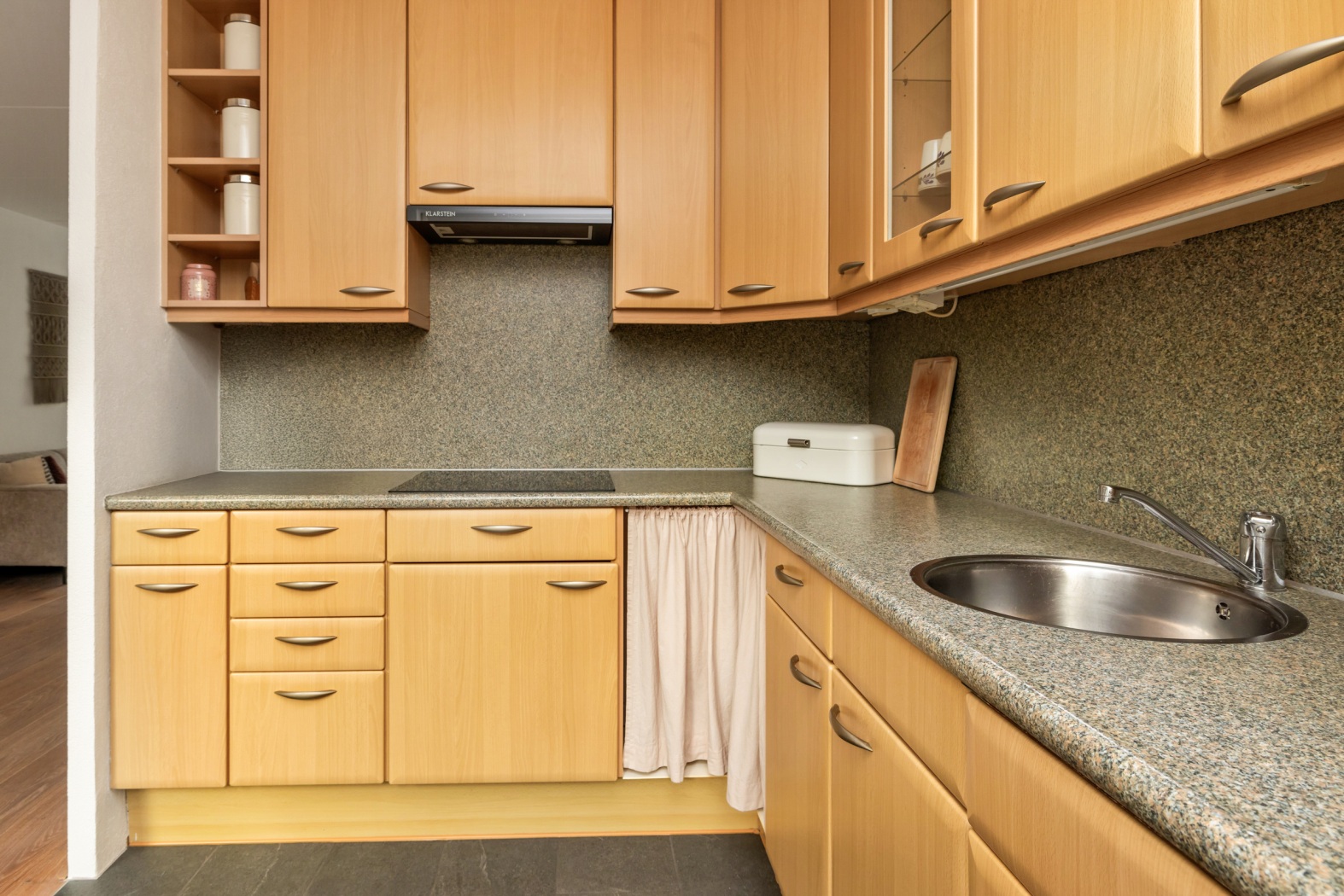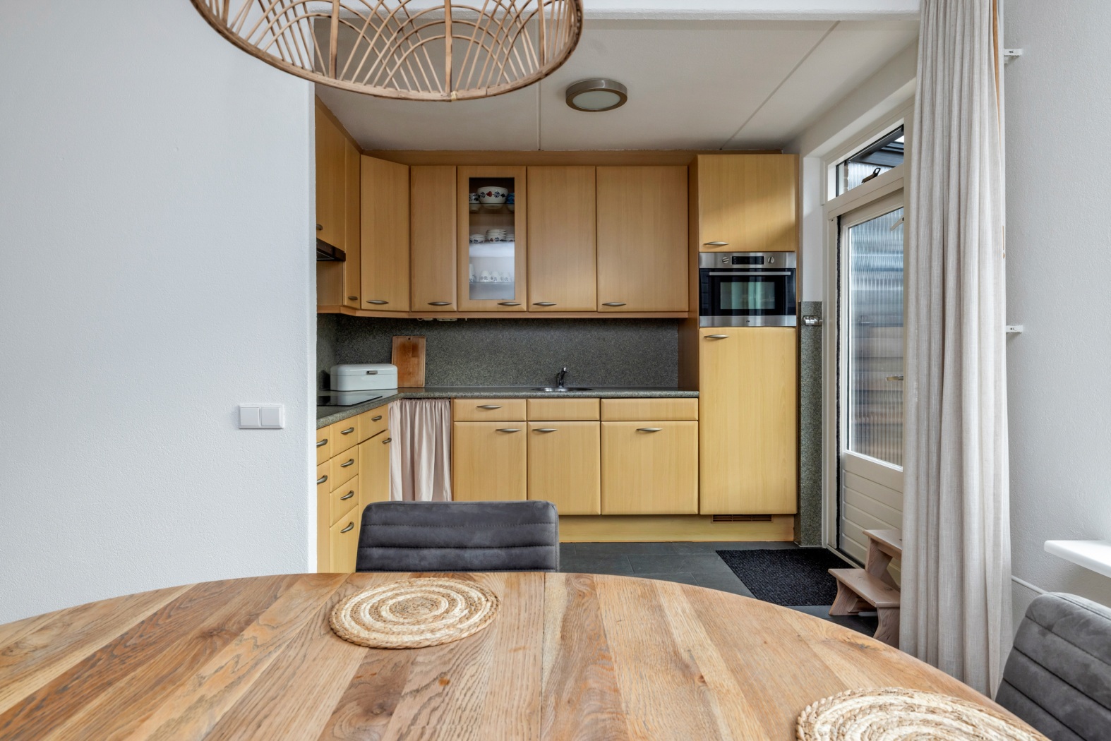 De half open keuken is voorzien van een plavuizenvloer en uitgevoerd in een L-opstelling met houtlook fronten. De keuken beschikt over diverse inbouwapparatuur, waaronder een kookplaat, afzuigkap, combi-oven, koelkast en vaatwasmachine. Vanuit de keuken is er een deur naar de veranda en tuin, wat het binnen- en buitenleven mooi met elkaar verbindt.