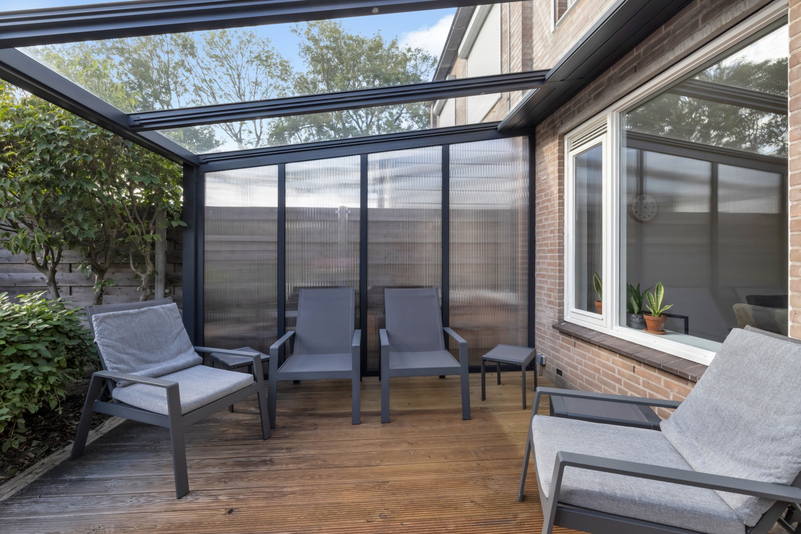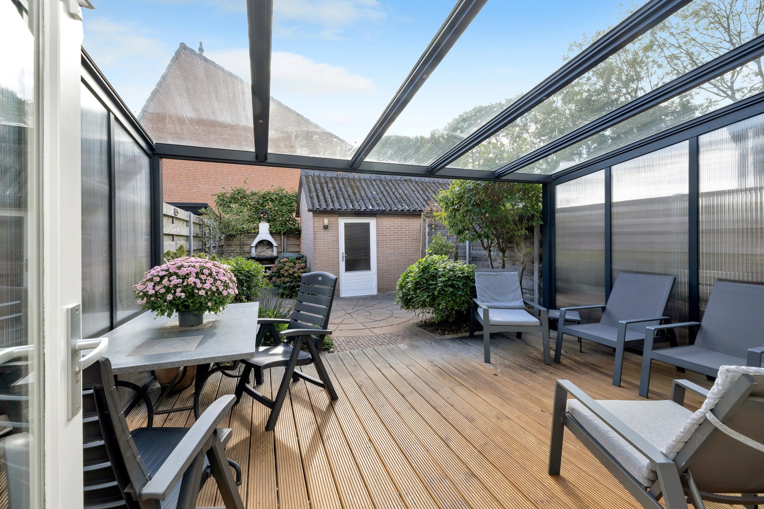 De veranda is afgewerkt met elegante vlonderplanken en stevig verankerd aan de achtergevel, waardoor een beschutte, sfeervolle buitenruimte ontstaat. De ideale plek om te ontspannen, te dineren of simpelweg te genieten van het buitenleven, in elk jaargetijde.