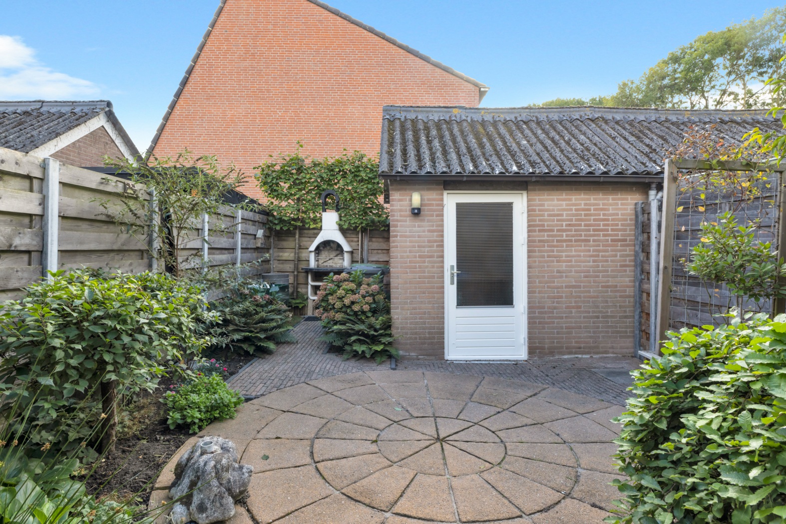 En dan die tuin... een zonnige topper op het zuidwesten, compleet met stenen berging. Perfect voor de barbecue, een boek of gewoon niks doen.
