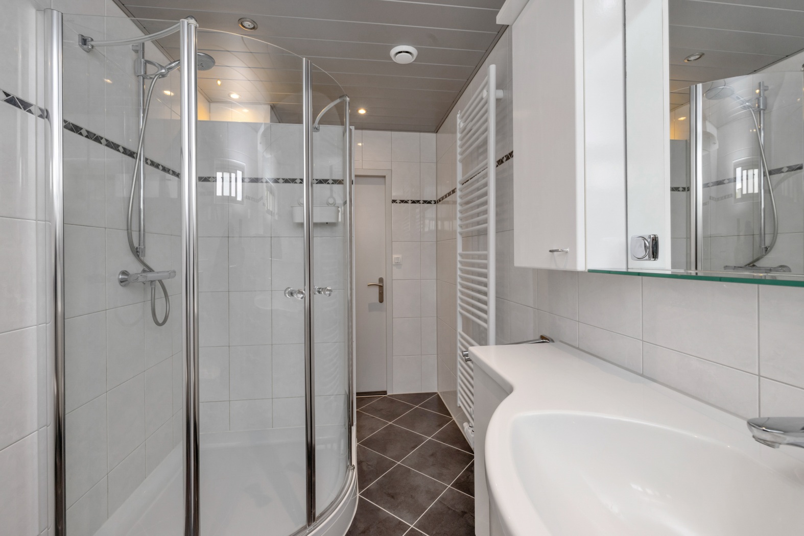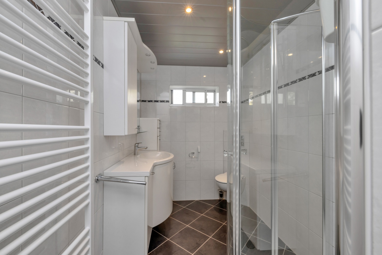 •Frisse badkamer met toilet, kwartronde douchecabine, wastafelmeubel en designradiator