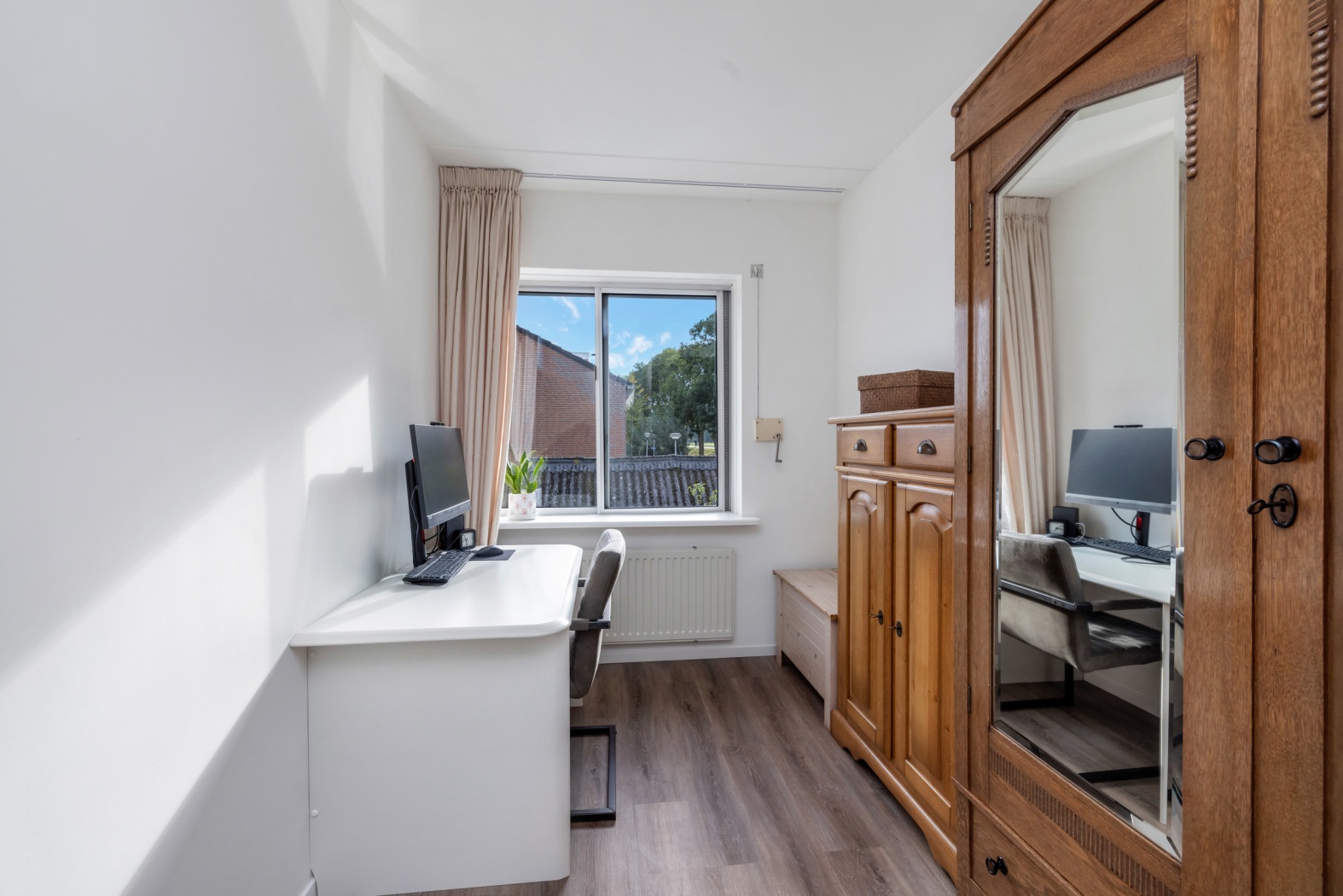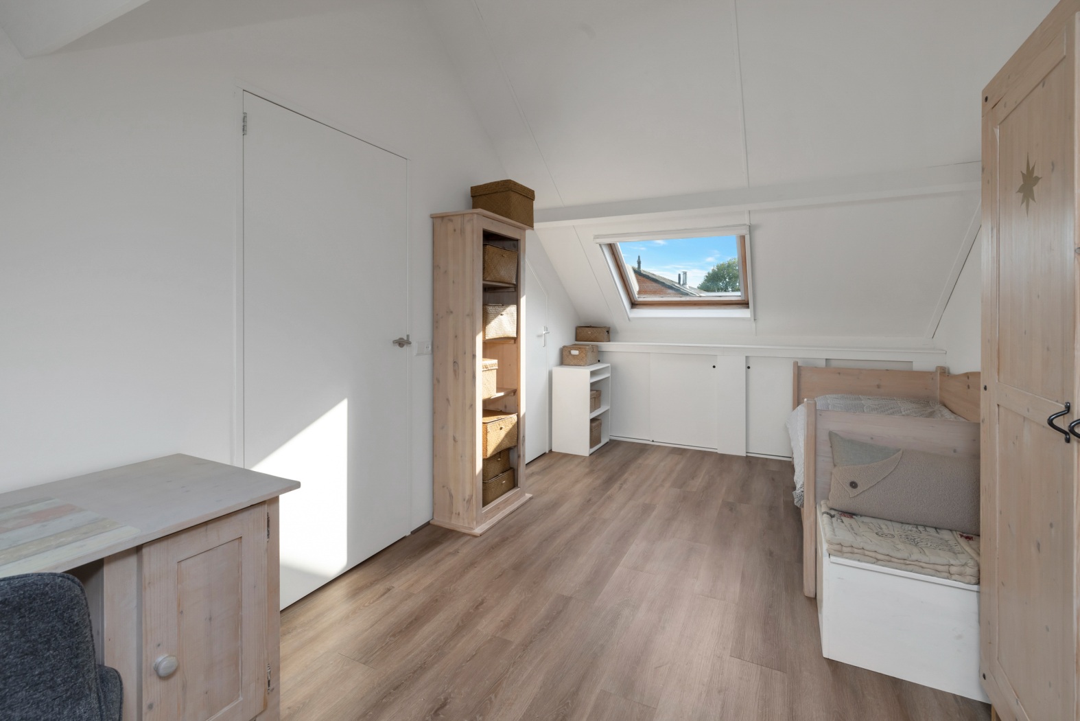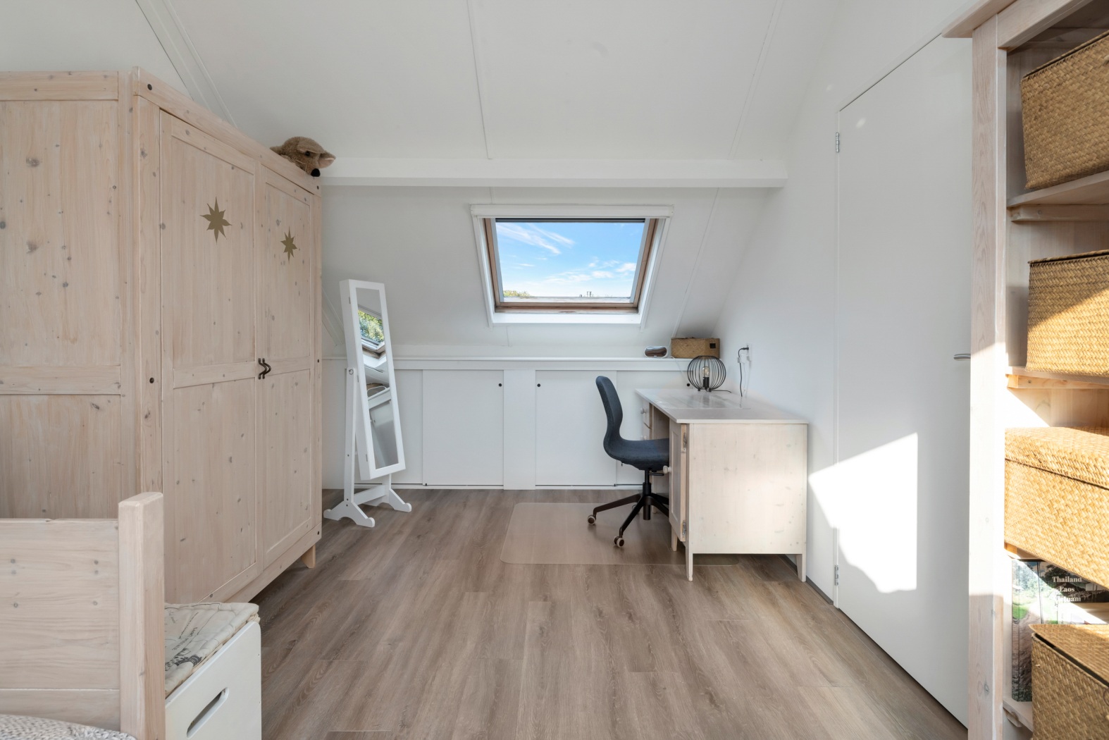 Aansluitend bevindt zich een ruime vierde slaapkamer (of werk-/hobbykamer, wat jij wilt!) met twee dakramen, een laminaatvloer en bergruimte achter de knieschotten. Vanuit de kamer is er bovendien een deur naar een extra bergkast.