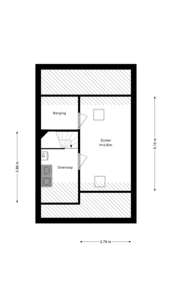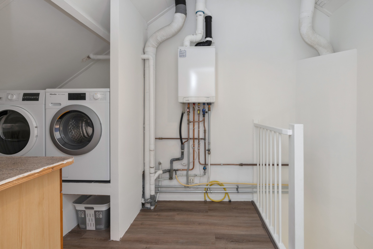 Via een vaste trap bereik je de tweede verdieping. De overloop biedt ruimte voor de opstelling van de cv-combiketel en heeft een praktische verhoging met aansluitingen voor de wasmachine en droger – daaronder handig plaats voor de wasmand.