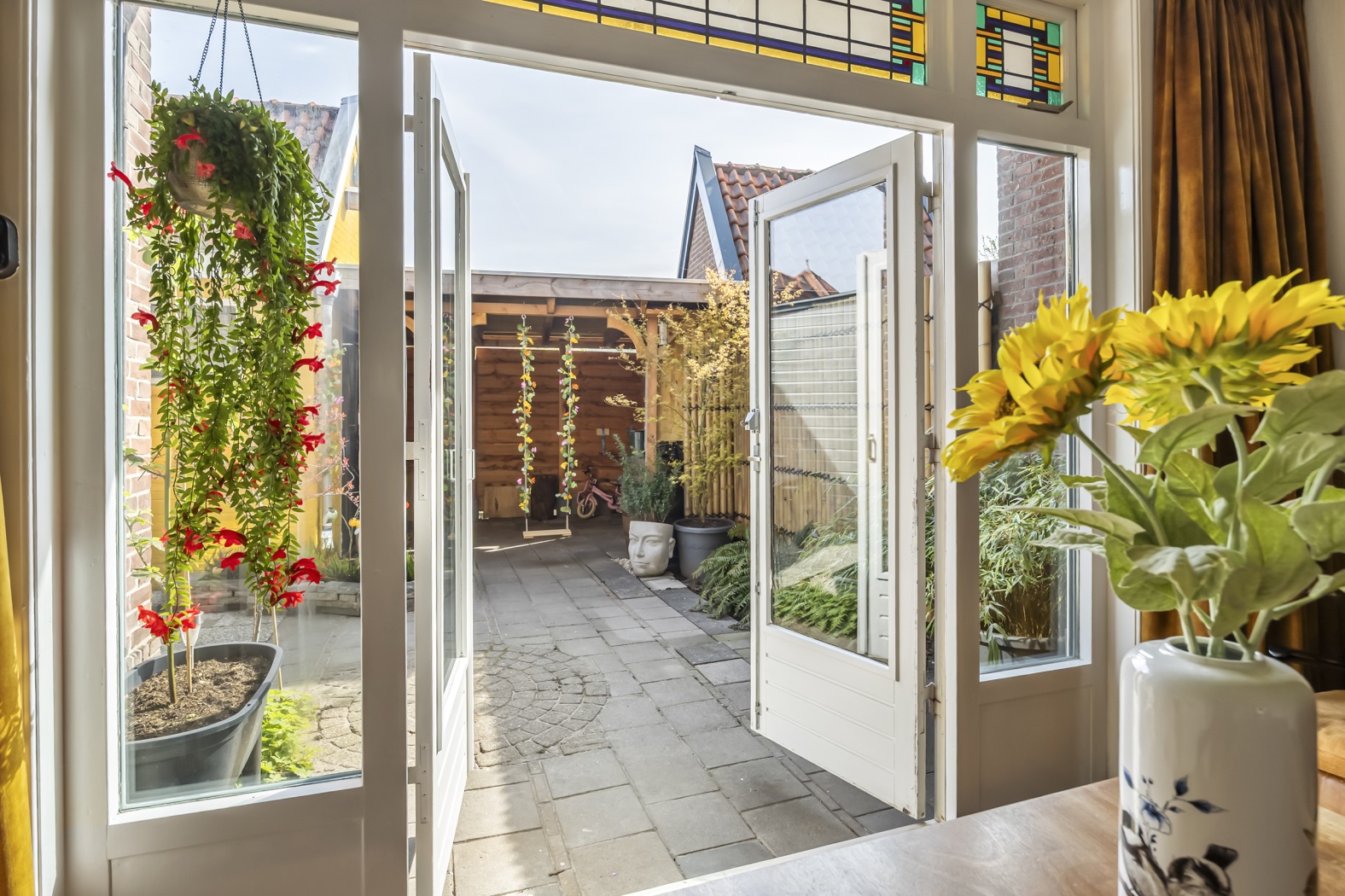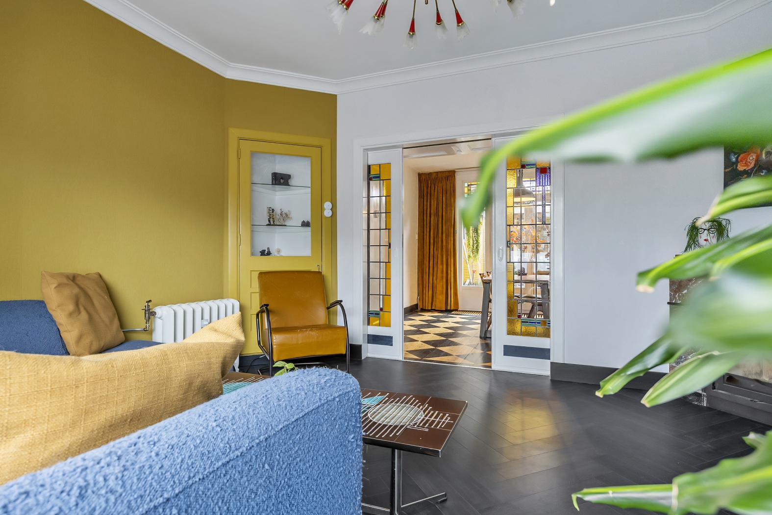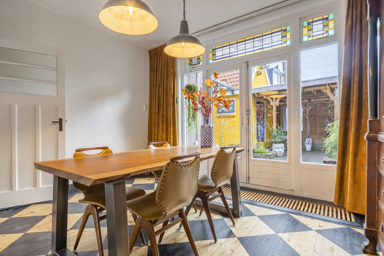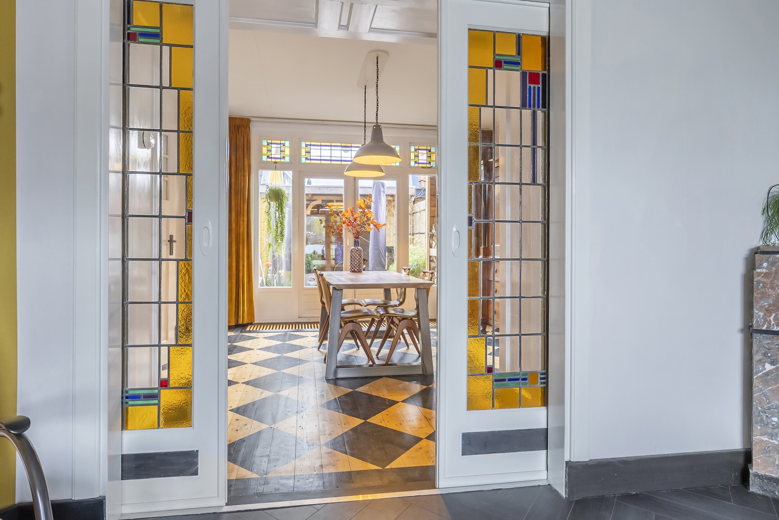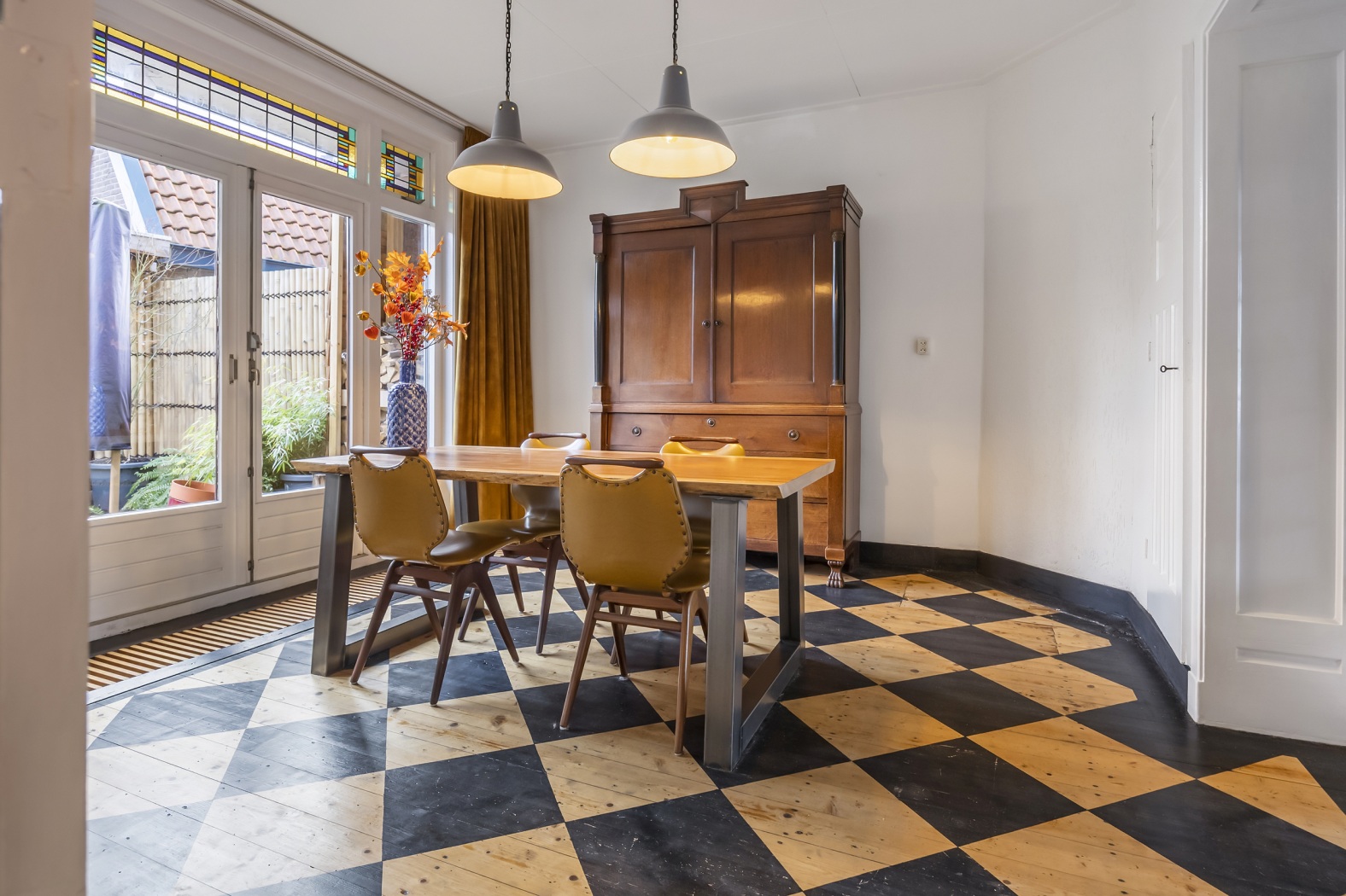 Via de kleurrijke schuifdeuren met glas-in-lood bereik je de achterkamer (ca. 17 m²), waar ruimte is voor een royale eettafel. Ook hier zorgen vaste kasten, een houten vloer met subtiel motief en de dubbele openslaande deuren naar de tuin voor een warme en uitnodigende sfeer. De glas-in-lood bovenlichten maken het geheel compleet.