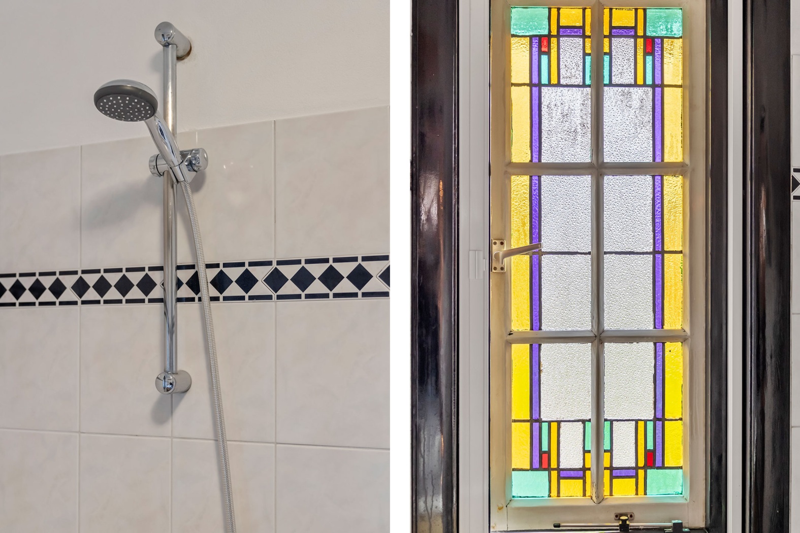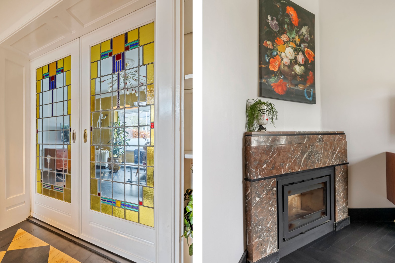 Je komt binnen via de halfronde voordeur, in een vestibule met karakteristieke art-deco-tegellambrisering en een prachtig patroon onder je voeten. Paneeldeuren, een kamer-en-suite met schuifdeuren voorzien van kunstig glas-in-lood en vaste kasten zoals het hoort: authentiek, stijlvol en met zorg behouden. De marmeren haard met houtkachel zorgt voor extra warmte en gezelligheid. De voorkamer met erker en de achterkamer met dubbele openslaande deuren worden royaal verlicht en staan in directe verbinding met de tuin, waar bovenlichten met glas-in-lood het licht nog mooier maken.