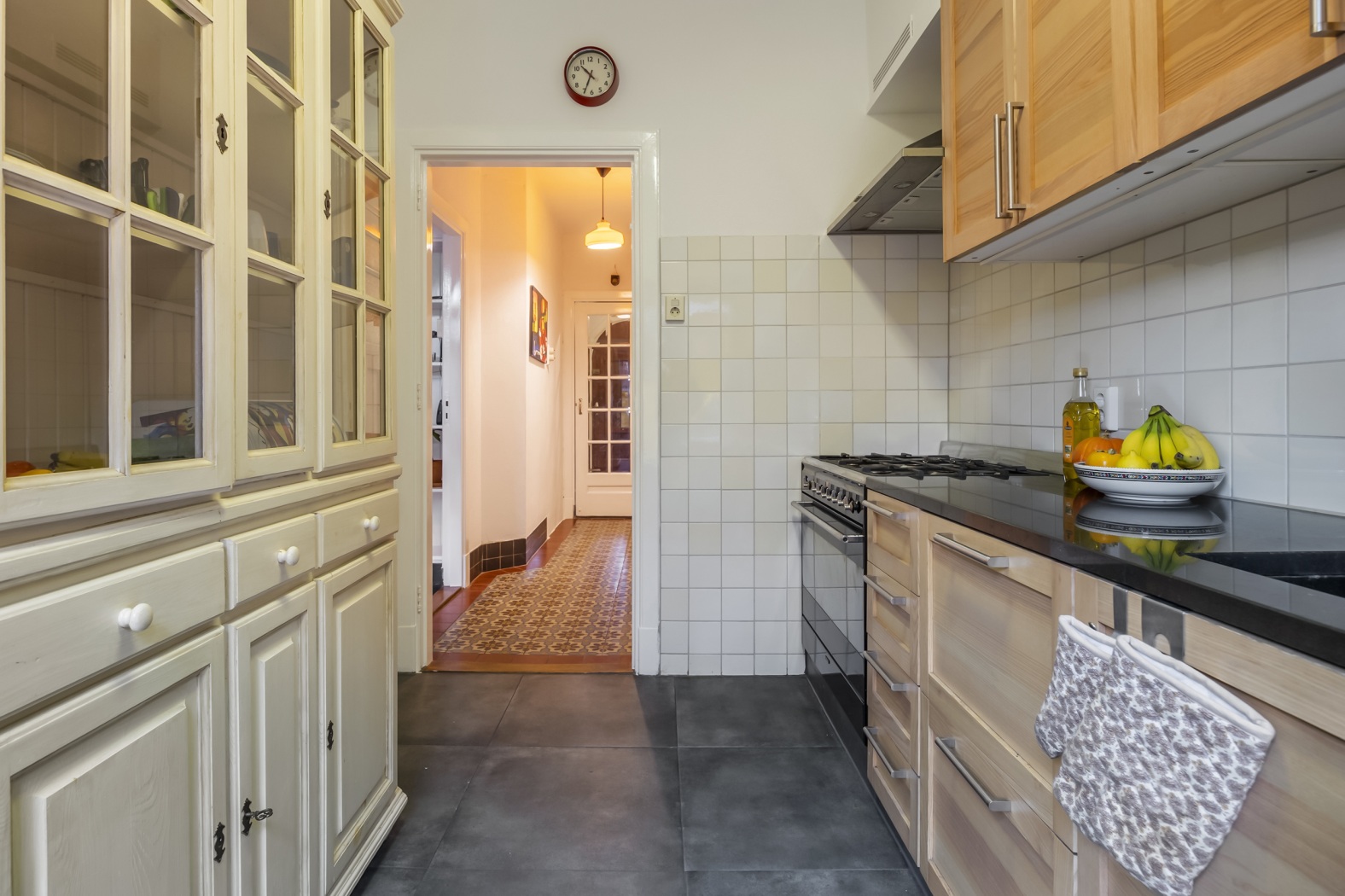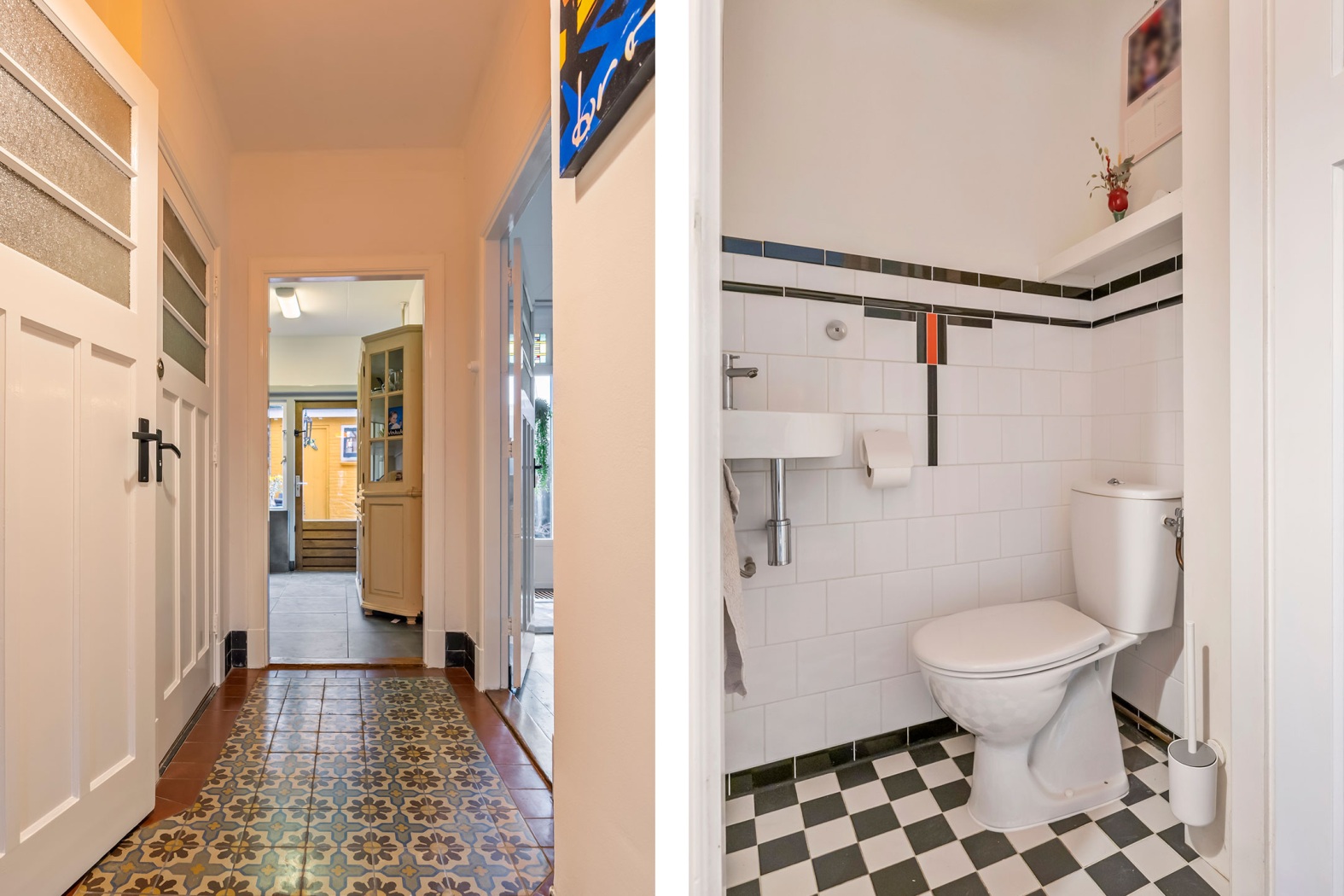 Vanuit de vestibule loop je door naar de lange gang met vintage bloemmotief tegels en fraaie paneeldeuren. Hier bevinden zich het toilet, stijlvol afgewerkt met jaren dertig tegels in zwaluwe motief en een zwarte rand, voorzien van een fontein, evenals de praktische kelderkast. Vanuit de gang heb je toegang tot de sfeervolle kamer-en-suite, terwijl rechtdoor de keuken bereikbaar is.