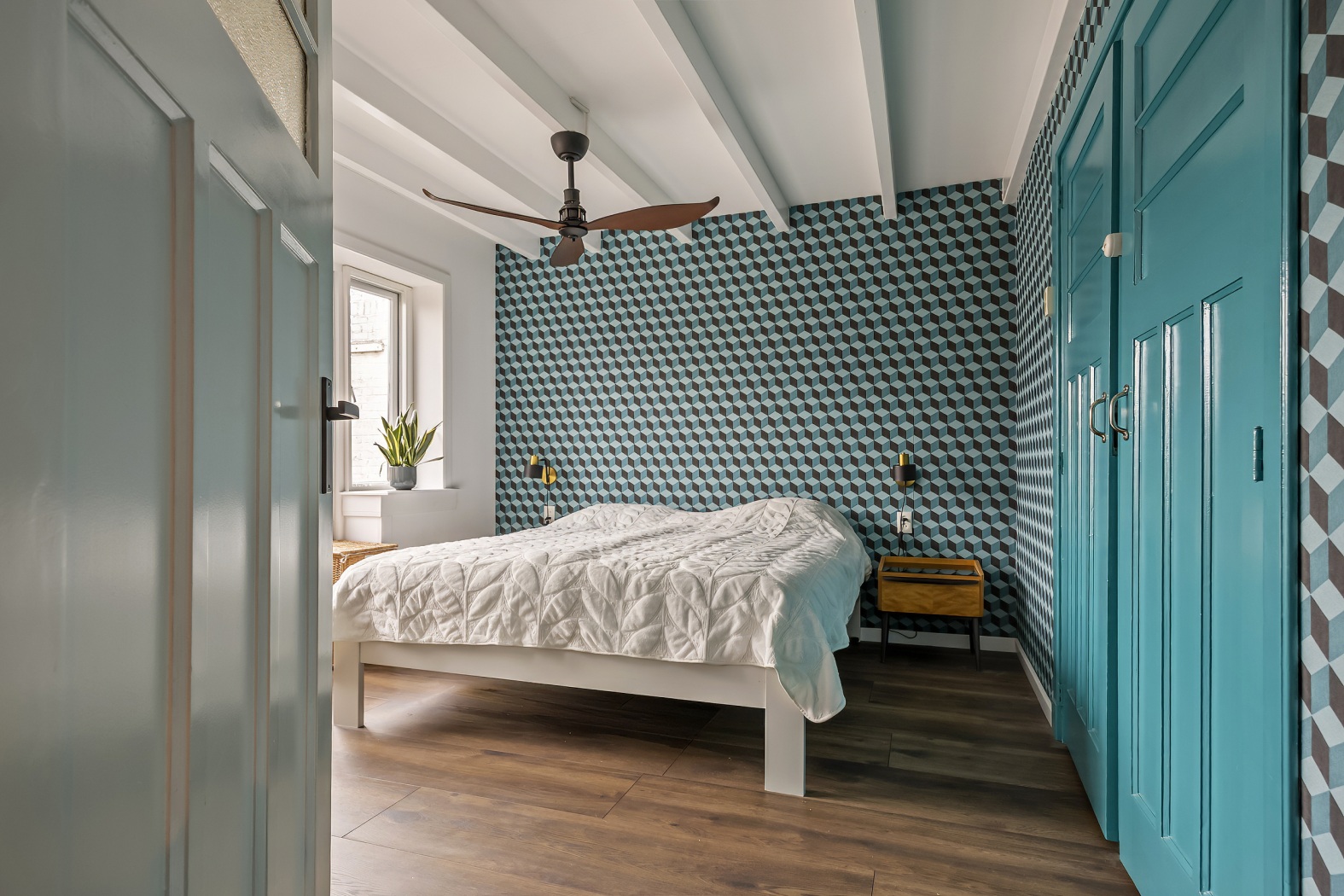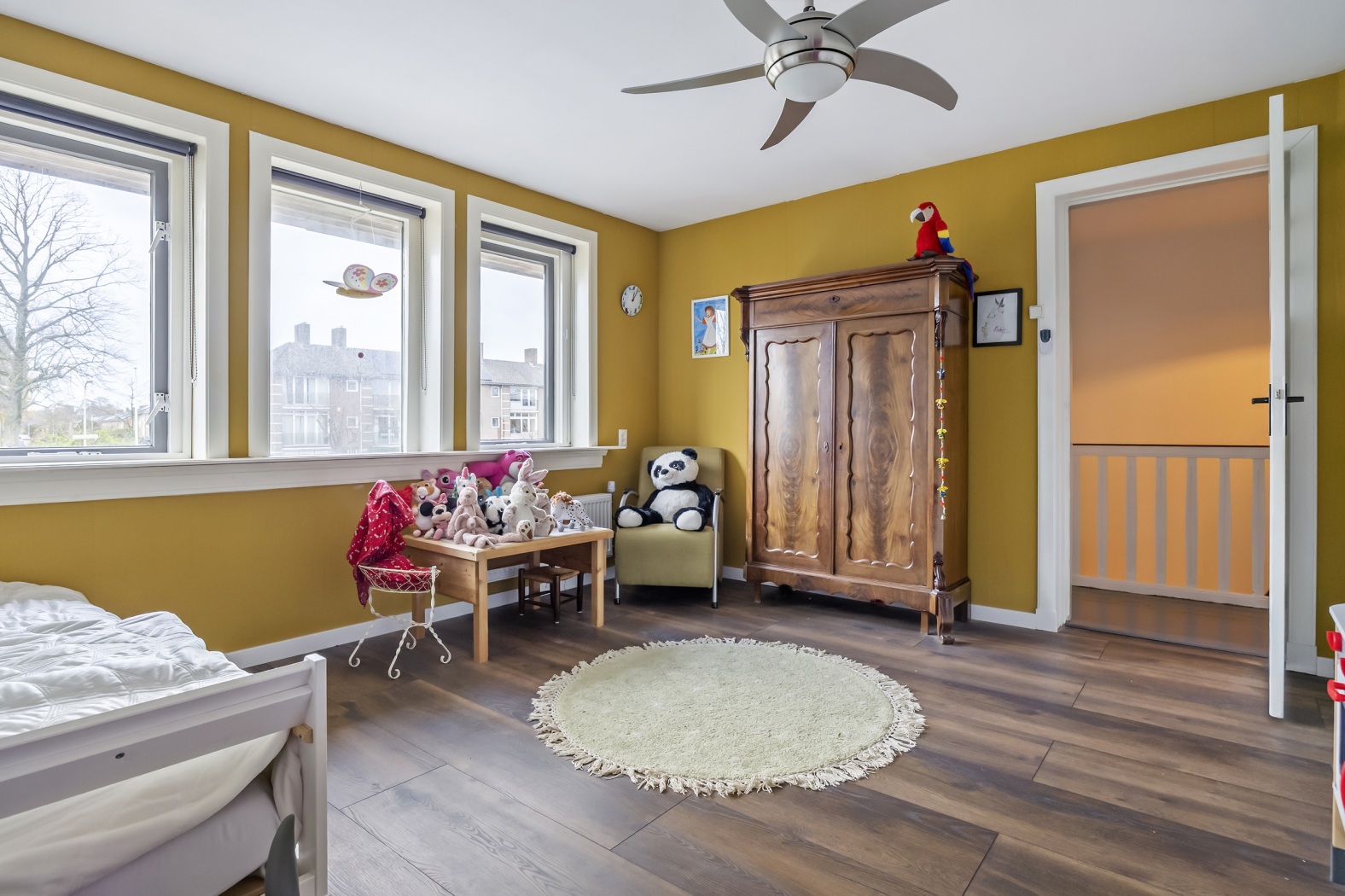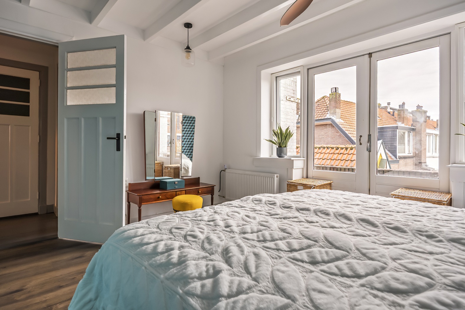 Op deze verdieping bevinden zich drie comfortabele slaapkamers: één aan de voorzijde en twee aan de achterzijde. De royale master bedroom is een fijne plek om tot rust te komen en beschikt over een grote inbouwkast, een karakteristiek balkenplafond en dubbele deuren naar het balkon. Alle slaapkamers zijn voorzien van vaste kasten en afgewerkt met een laminaatvloer. De twee slaapkamers aan de achterzijde zijn bovendien voorzien van rolluiken en horren. De slaapkamer aan de voorzijde en de badkamer beschikken eveneens over horren.
