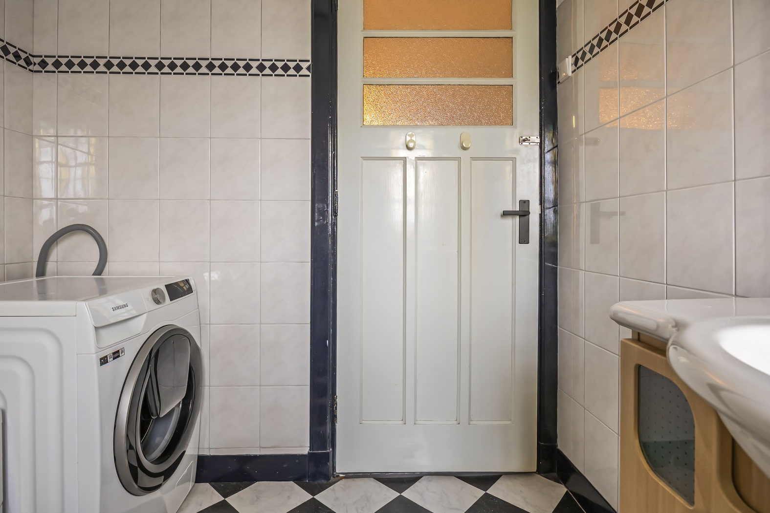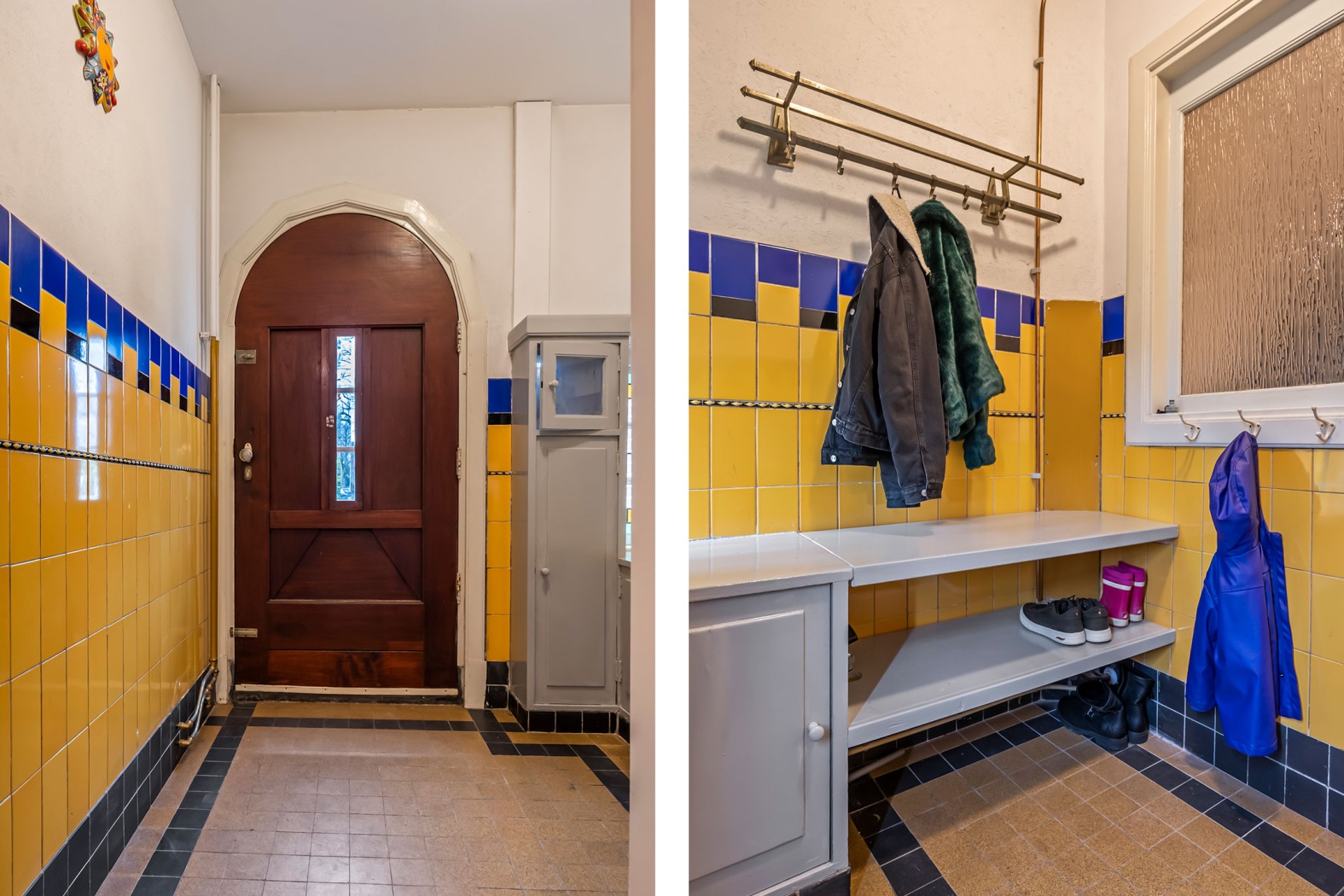 Via de voortuin, waar tevens een praktische parkeerplaats is aangelegd, bereiken we de statige halfronde voordeur. Eenmaal binnen word je verwelkomd in de vestibule met karakteristieke jaren-dertig lambrisering tegels en bijpassende vloertegels. Een charmant kastje met meterkast en brievenbus onderstreept het authentieke karakter.