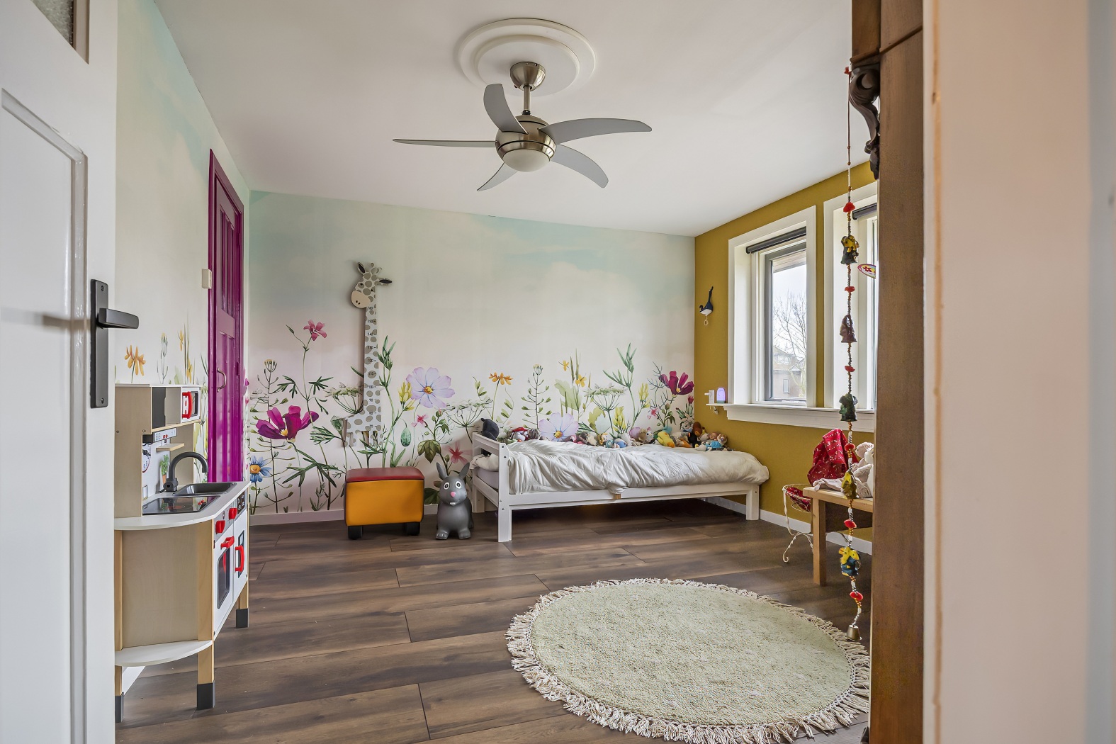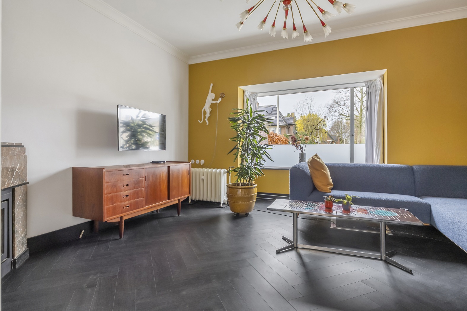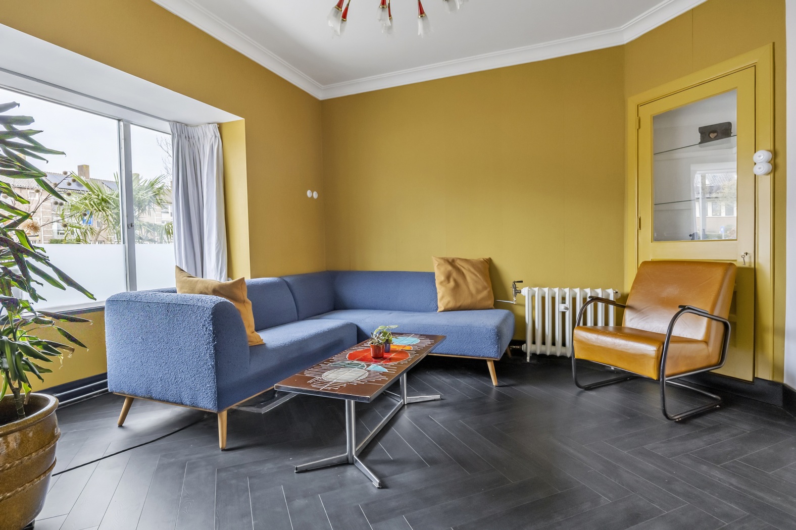 Wat een prettig en sfeervol leefgedeelte. De voorkamer (ca. 17,5 m²) is ingericht als zonnig zitgedeelte en valt direct op door de warme gele wanden, de erker en de visgraatvloer. De marmeren haard met houtkachel en de vaste kast vormen samen een gezellig en karaktervol geheel.