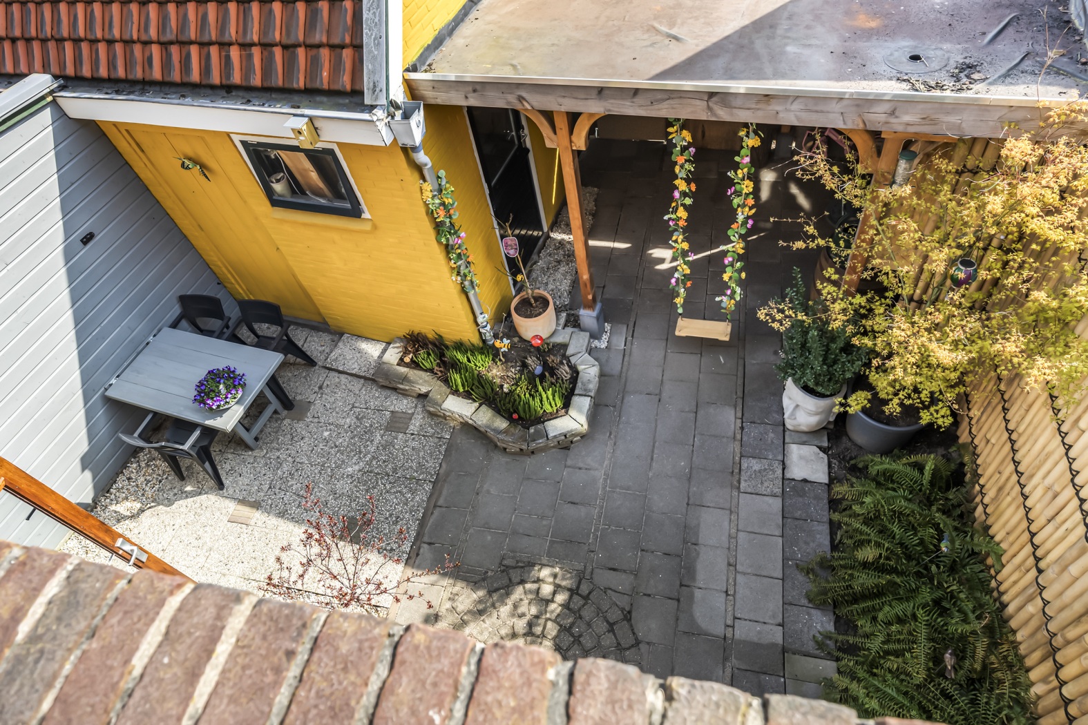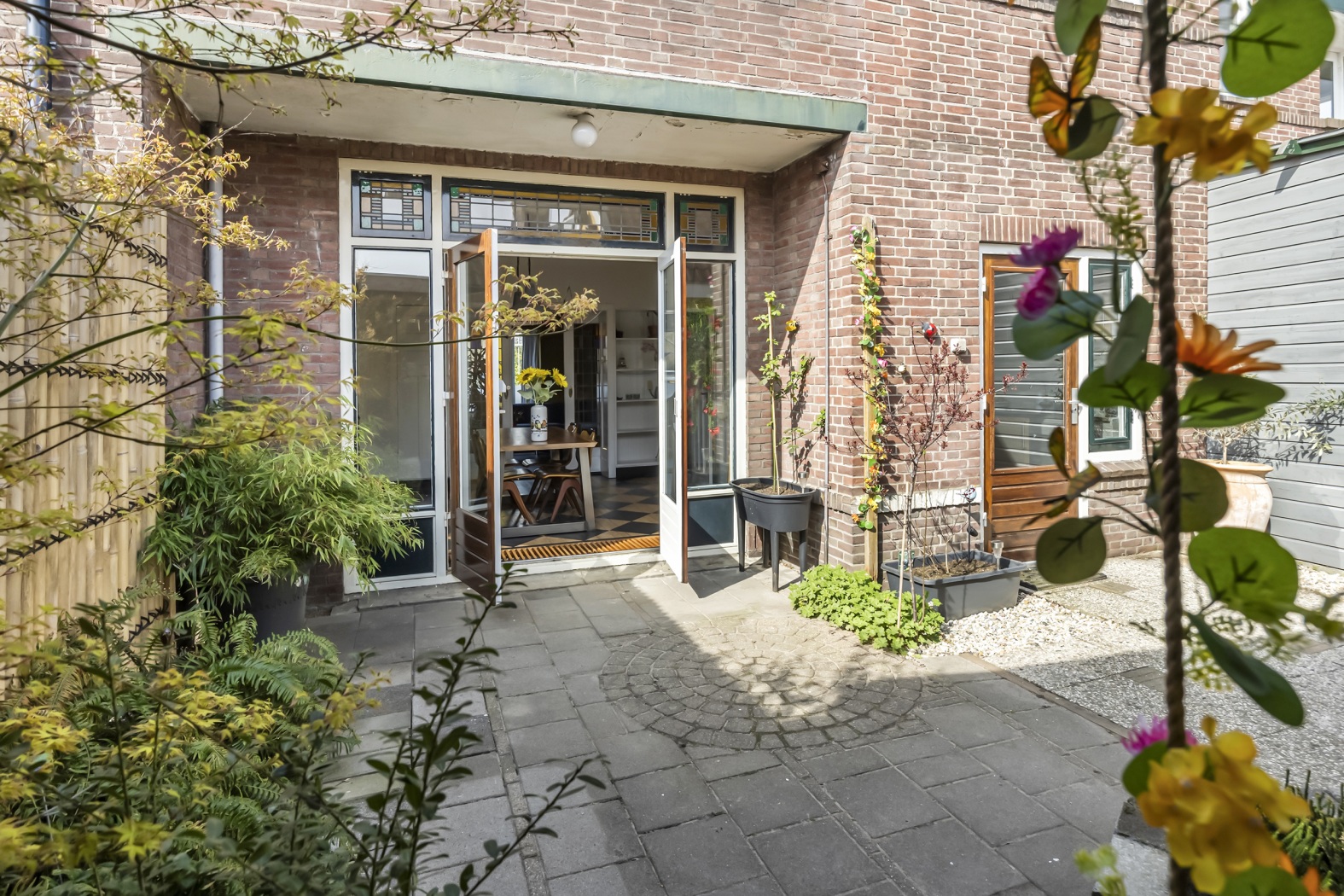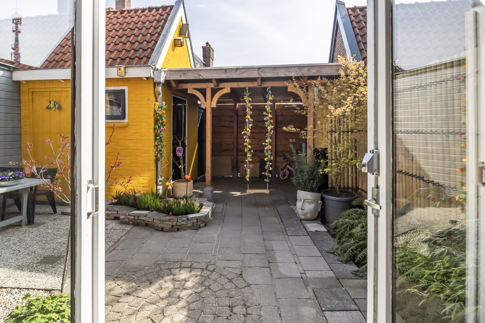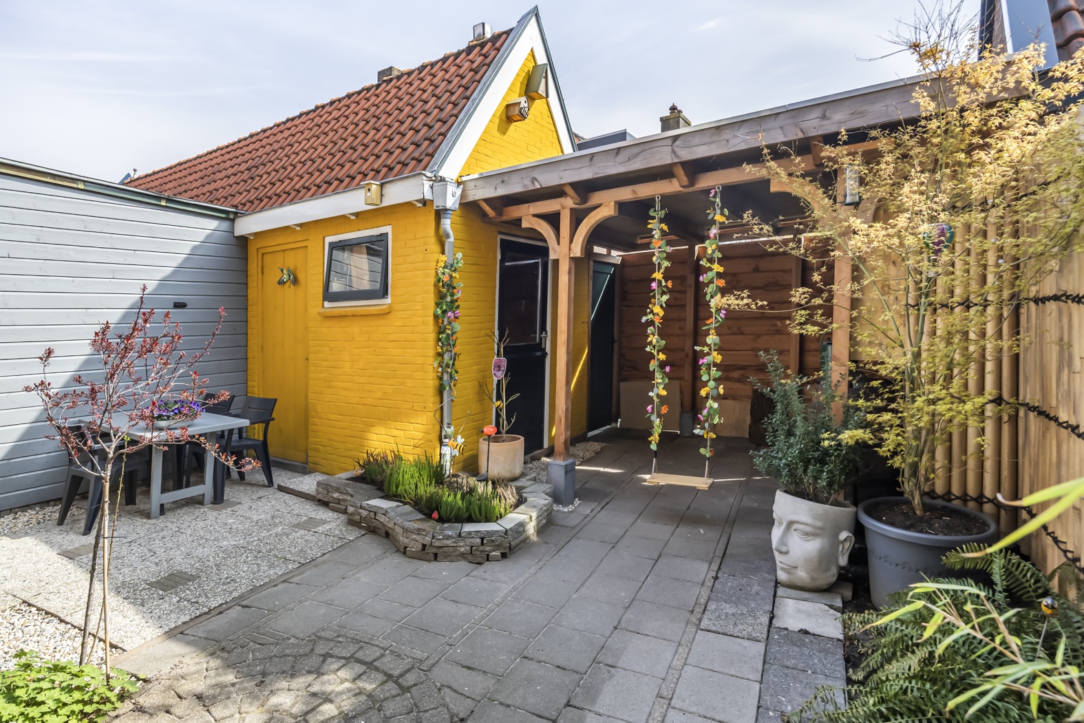 De tuin is bereikbaar via de dubbele openslaande deuren vanuit de woonkamer, die uitkomen op een deels overdekt terras dankzij het balkon op de verdieping erboven. Ook vanuit de keuken is de tuin toegankelijk, met een overdekte overkapping richting de berging.