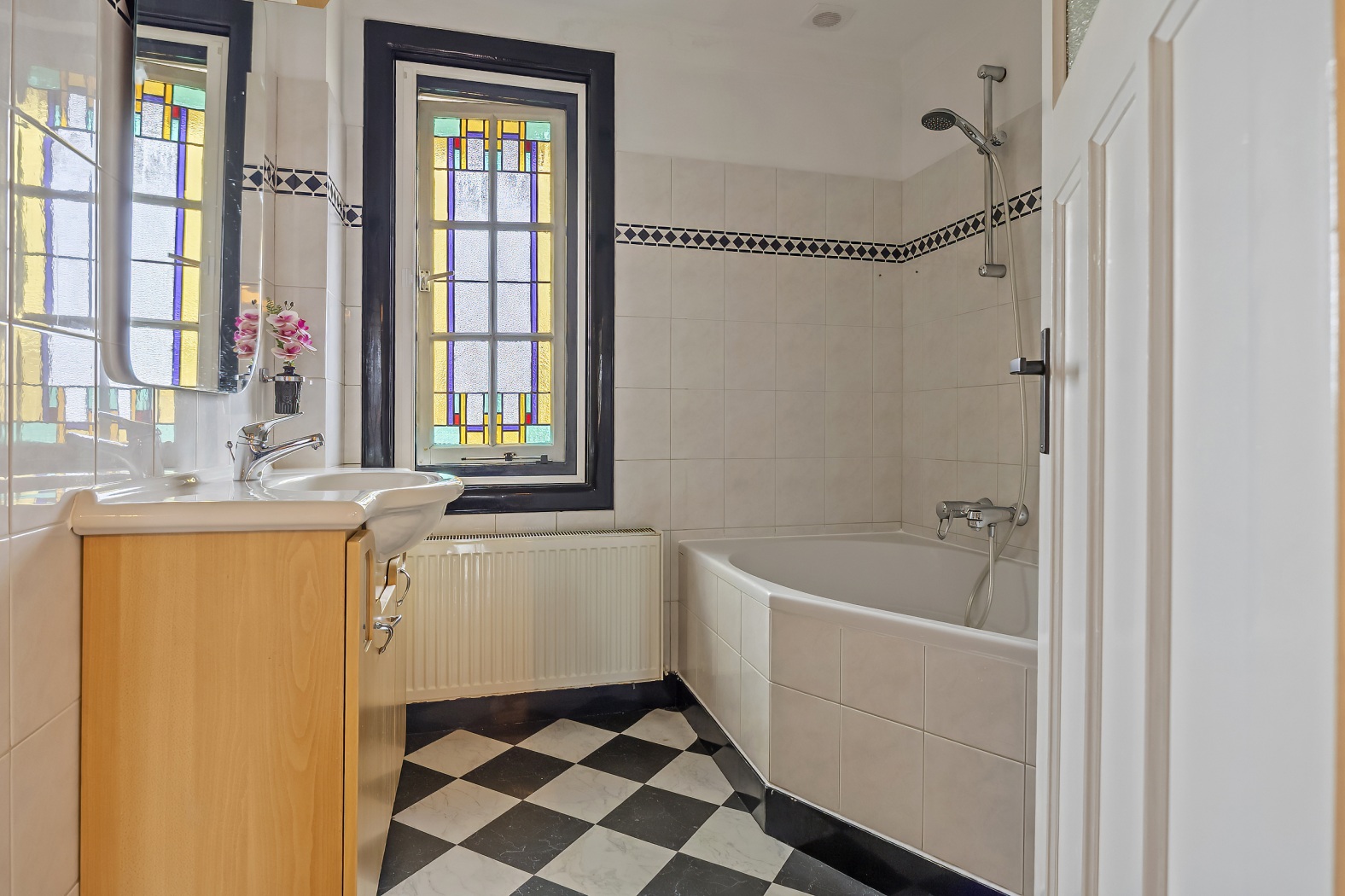 De badkamer is aan de voorzijde gelegen en wordt gekenmerkt door een prachtig glas-in-loodraam. De ruimte is ingericht met een hoekligbad met douche, een wastafelmeubel en een aansluiting voor de wasmachine, wat zorgt voor een comfortabele en praktische indeling.