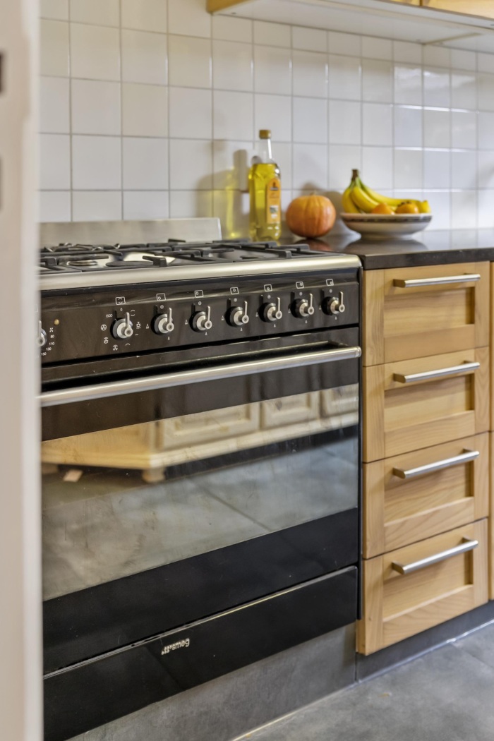 De keuken is bereikbaar vanuit de hal en heeft een deur naar de tuin. Het rechte keukenblok met houten kastfronten en een hardstenen aanrechtblad is geplaatst in 2020 en voorzien van diverse apparatuur, waaronder een 6-pits gasfornuis met oven, een vaatwasser (2023) en een close-in boiler. De antracietkleurige vloertegels vormen een rustige en tijdloze basis. Een charmante kast met ruitjes, afkomstig uit grootmoeders tijd, past hier perfect en onderstreept het karakter van de ruimte.