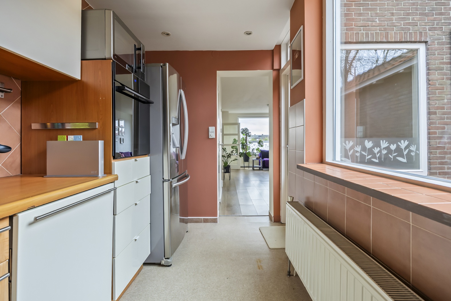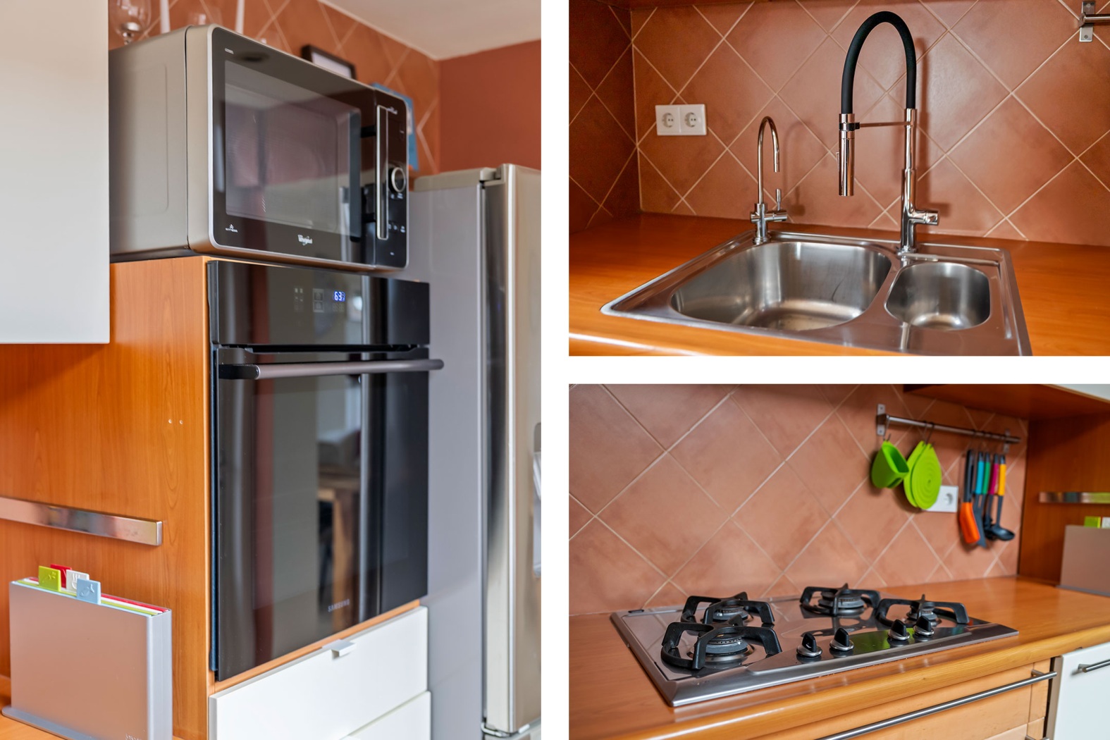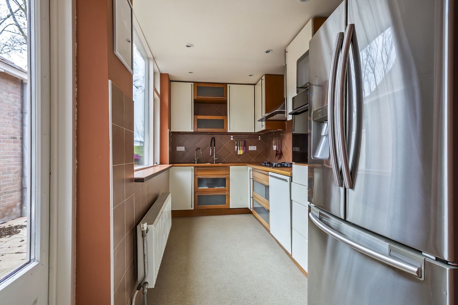 De keuken is slim uitgebouwd richting de tuin, met een deur die je zo naar buiten leidt. De L-vormige opstelling maakt koken makkelijk en overzichtelijk. Je hebt alles binnen handbereik: een 4-pits gascomfort, rvs-afzuigkap, oven, magnetron en een Amerikaanse koel-/vriescombinatie met ice & water dispenser — ideaal voor de warme zomerdagen of dat extra blokje ijs in je drankje.