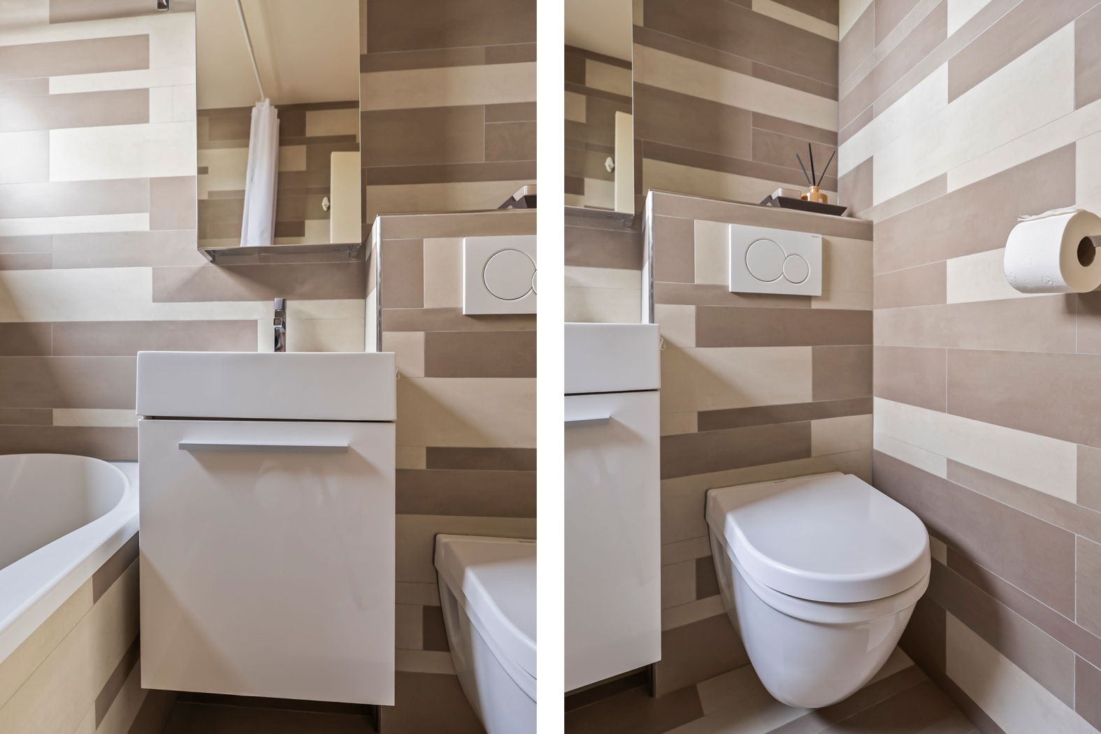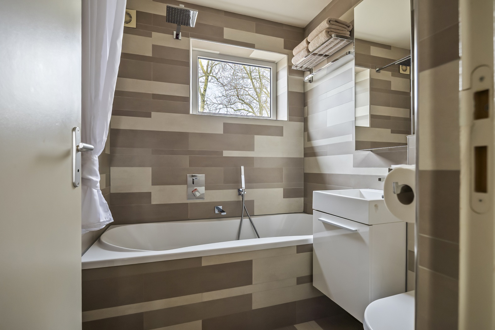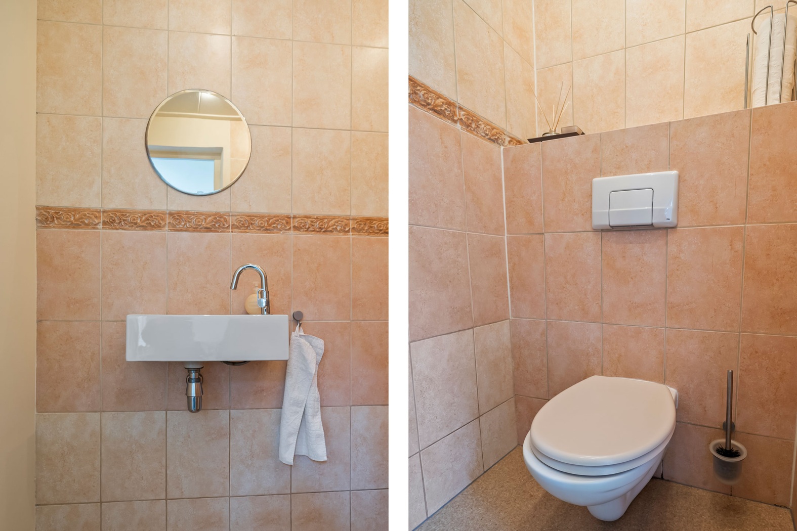 De moderne badkamer aan de achterzijde is stijlvol én praktisch. Warme beige tegels en vloerverwarming zorgen voor comfort (dag koude voeten!). Het royale ligbad met douchefunctie is ideaal: snel douchen of uitgebreid genieten in bad, jij kiest. Verder vind je er een wastafelmeubel met spiegelkast en een tweede toilet. Kortom: alles wat je nodig hebt om je dag fris te beginnen of ontspannen af te sluiten.