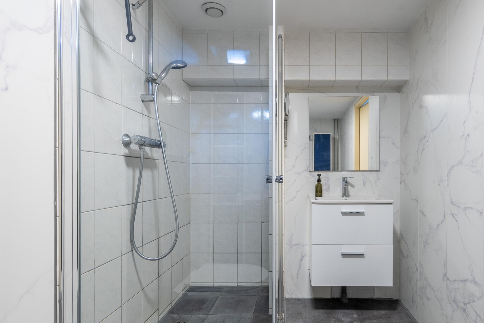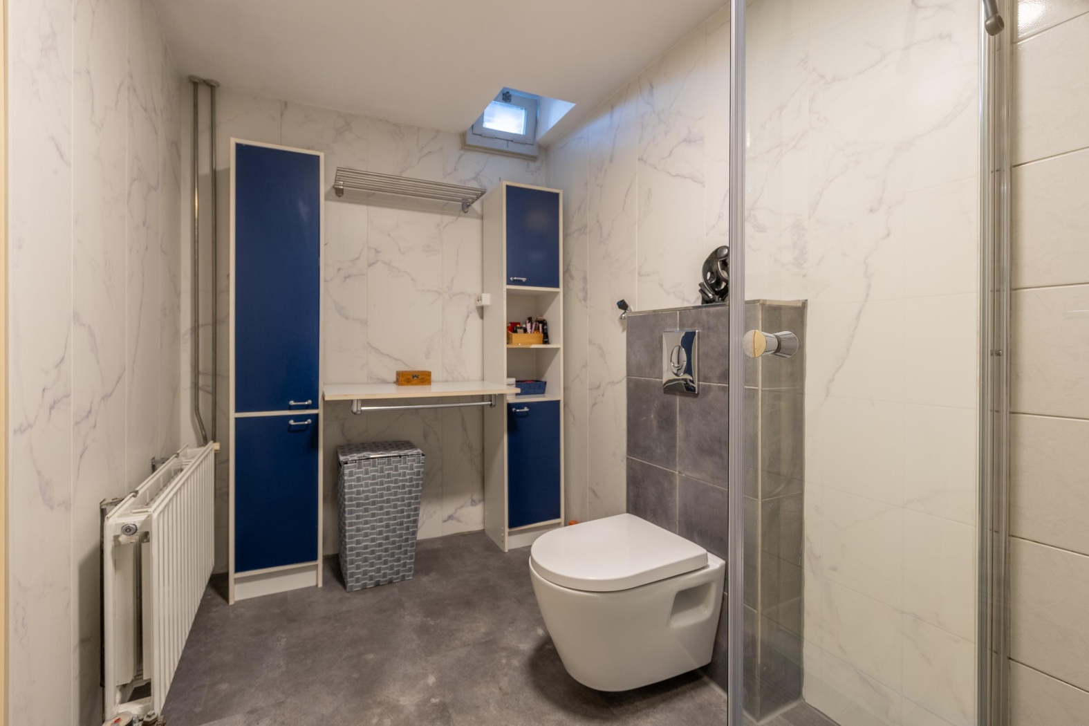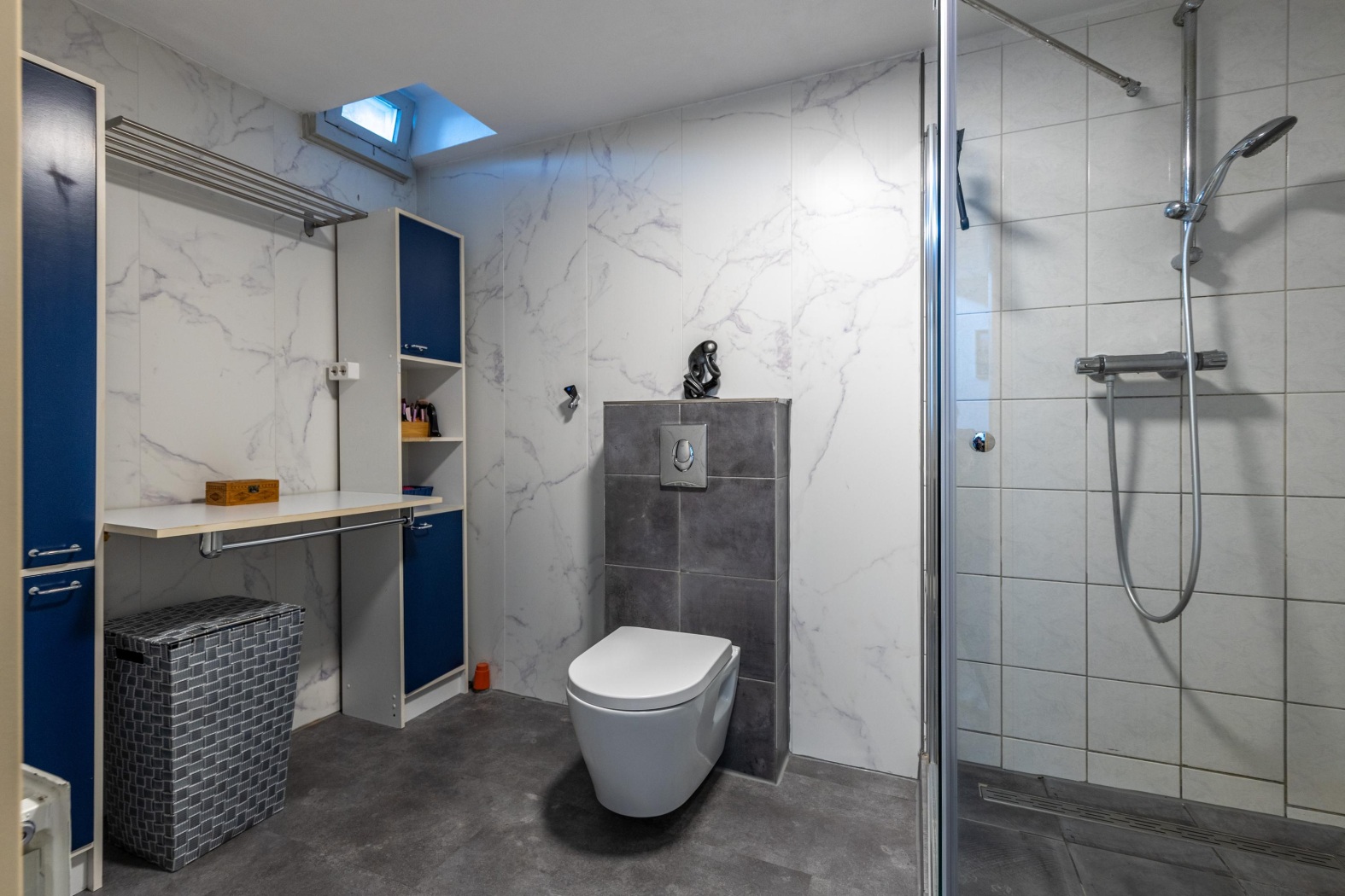 •Badkamer met zwevend toilet, wastafelmeubel en douchecabine