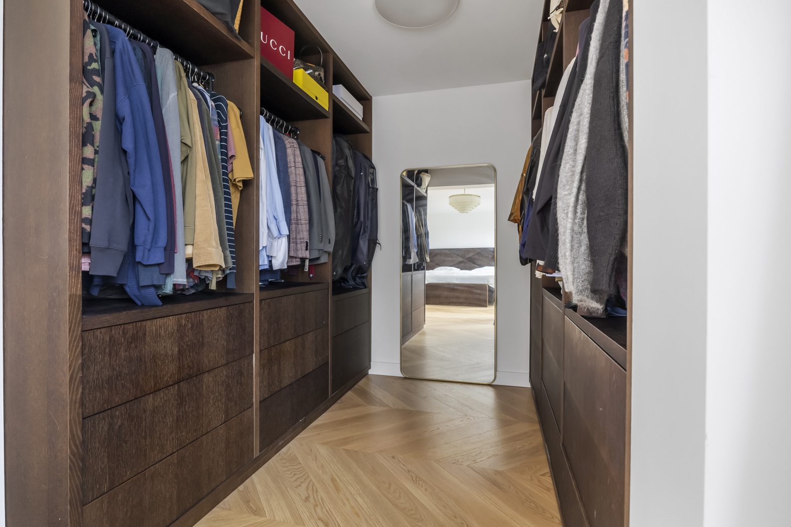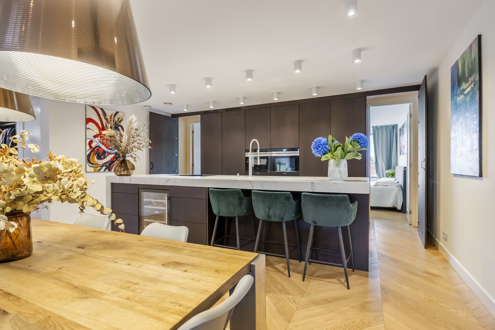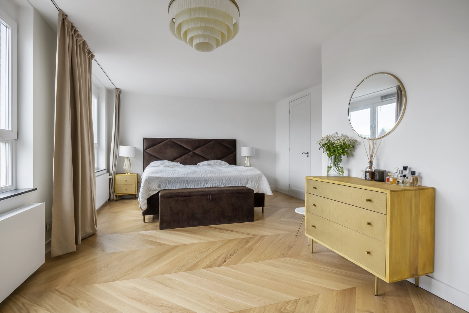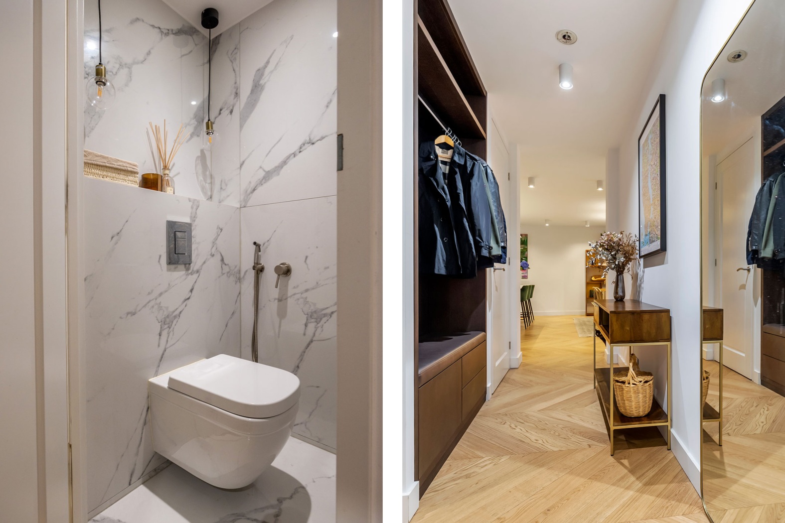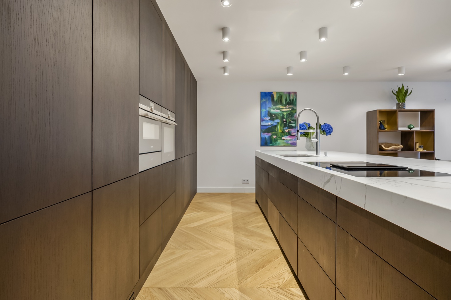 The floor, parquet crafted from oak, herringbone pattern, forms the perfect foundation: timeless, elegant, and with a warm appearance that lends the whole apartment a refined elegance.
