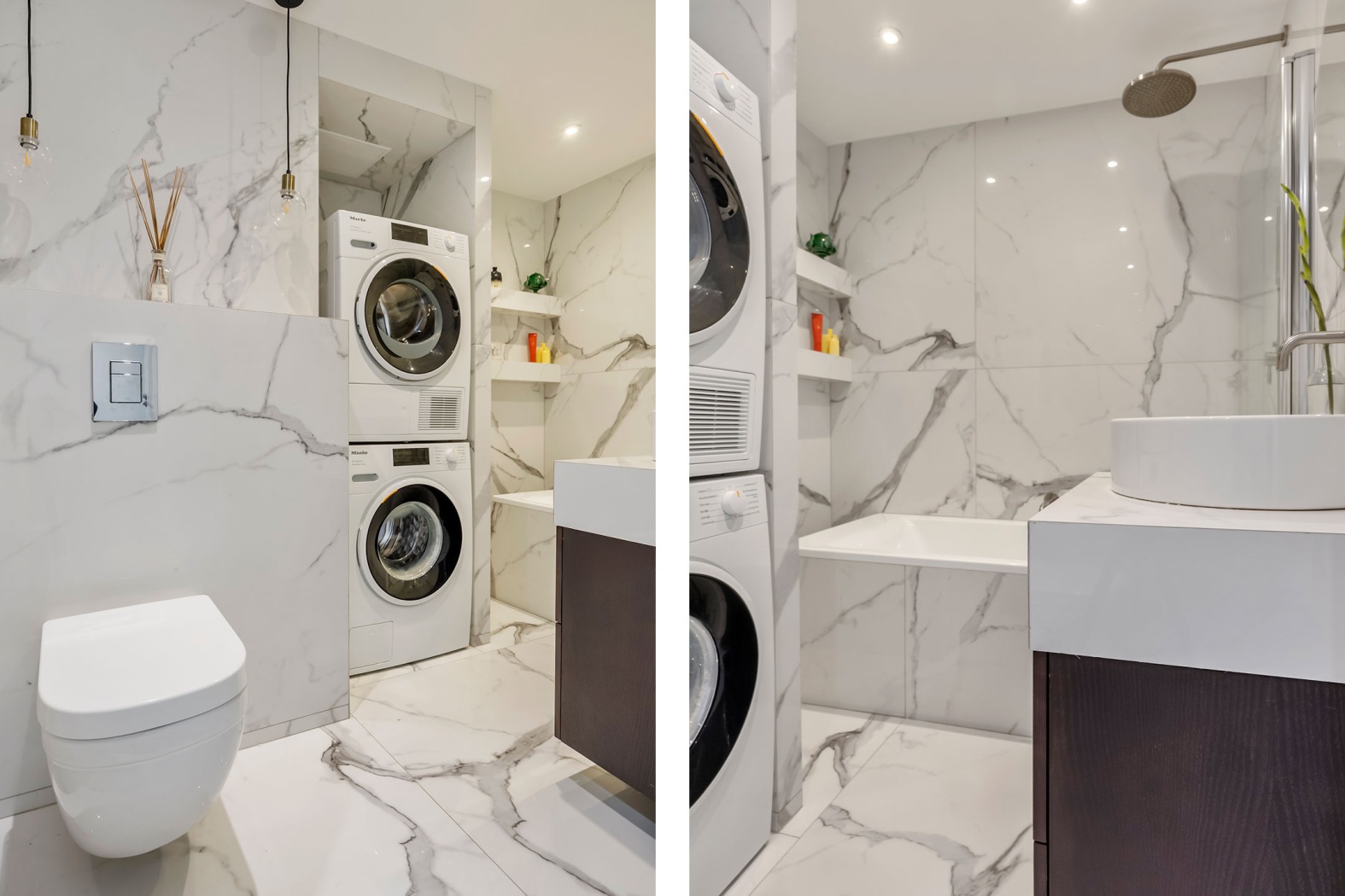 Connections for the washing machine and dryer are also located here, conveniently concealed yet within easy reach. This bathroom is ideal as guest bathroom or a practical family bathroom – stylish, complete, and thoughtfully designed in every detail.