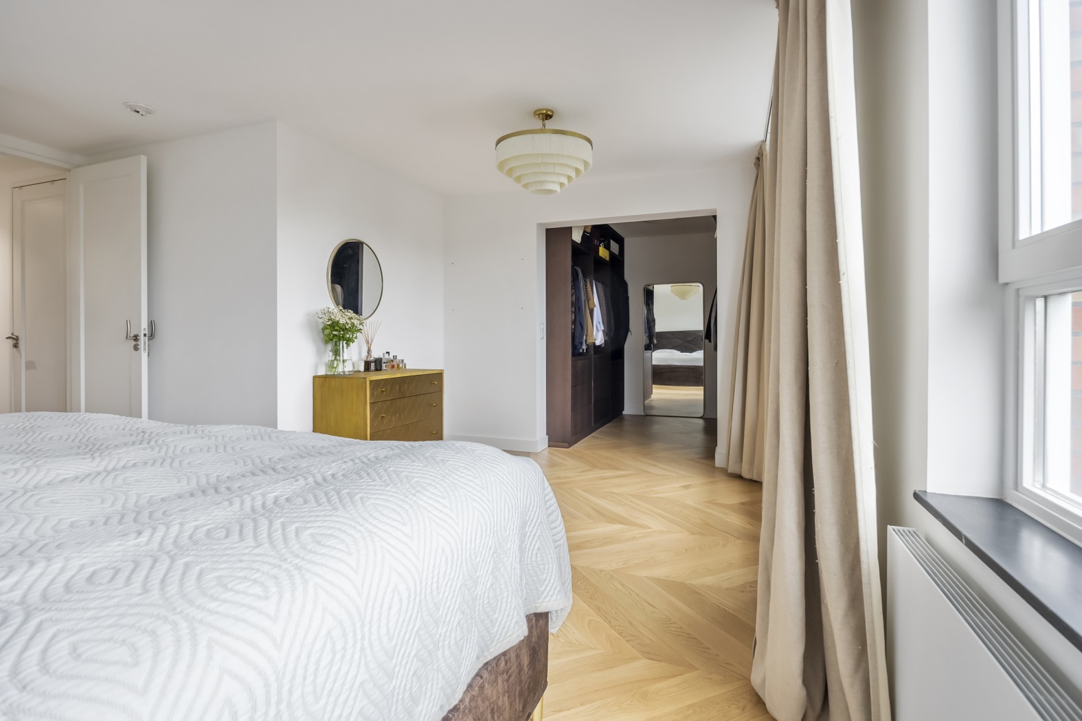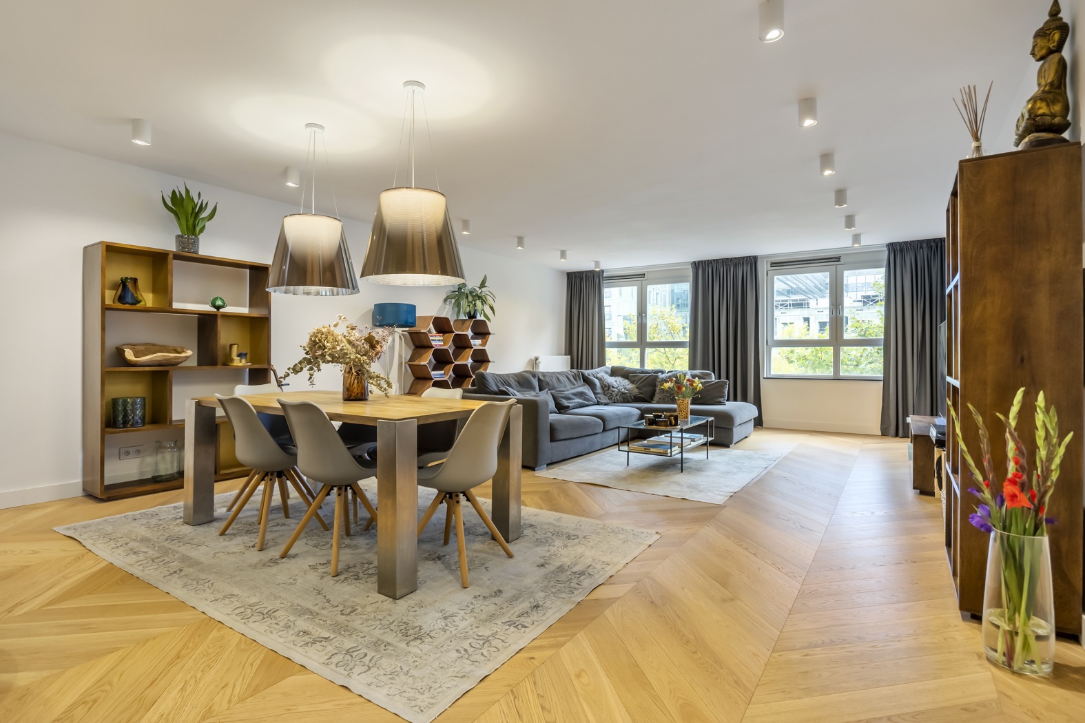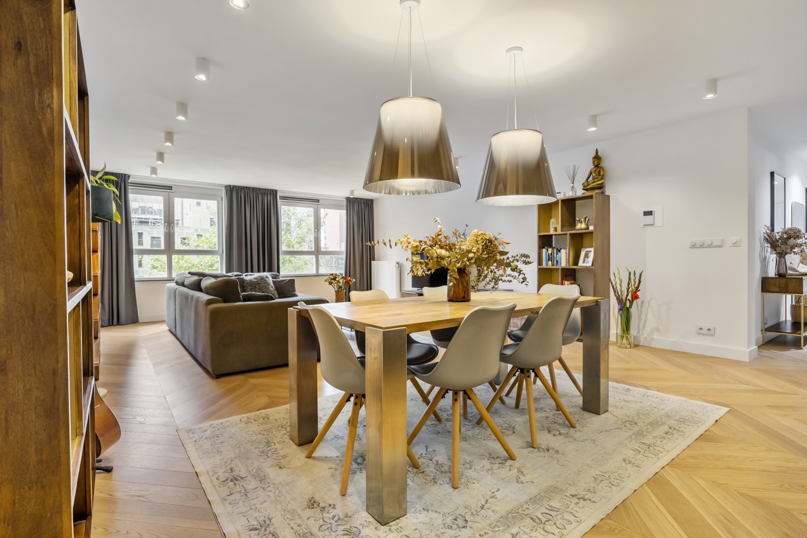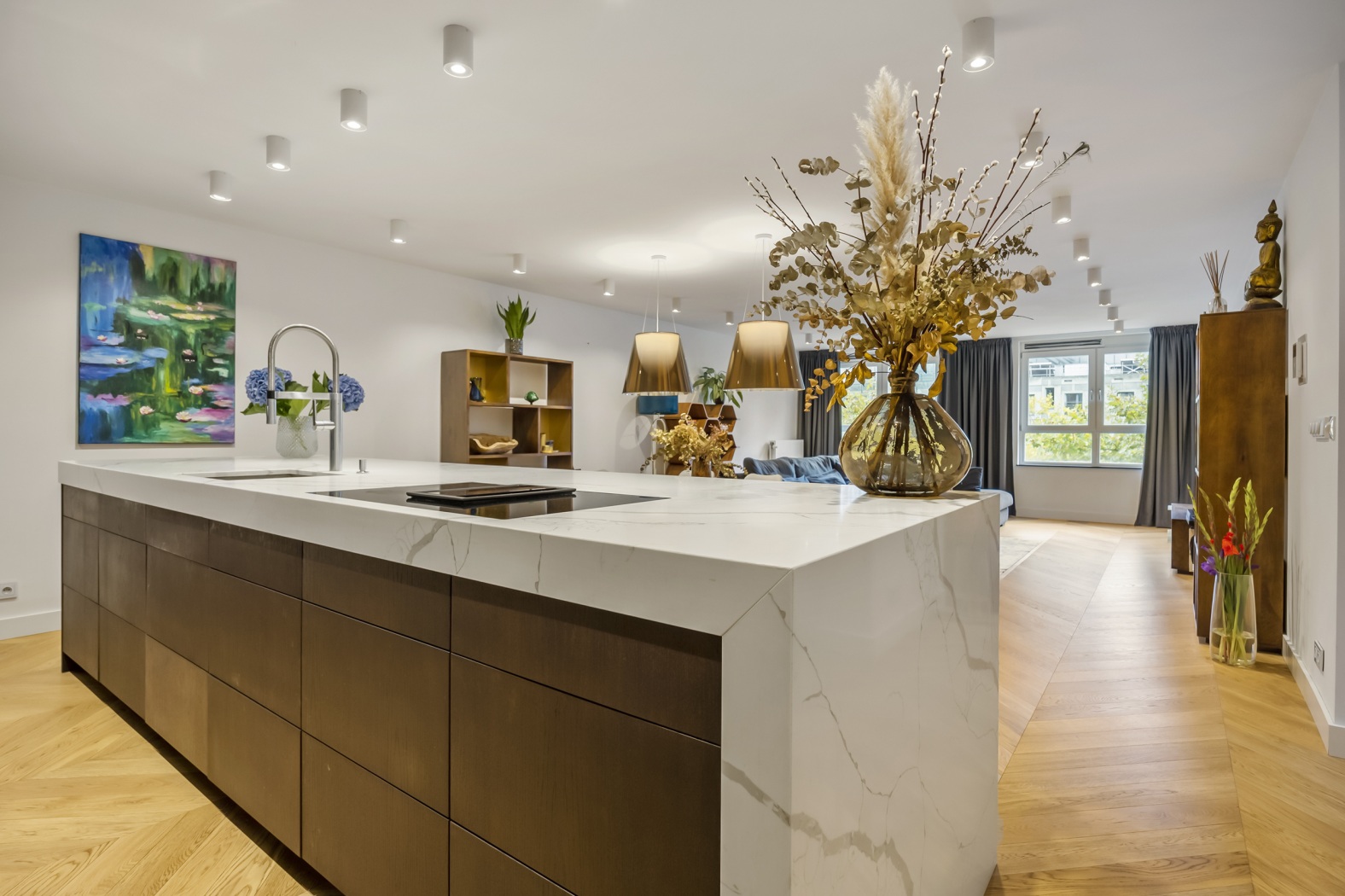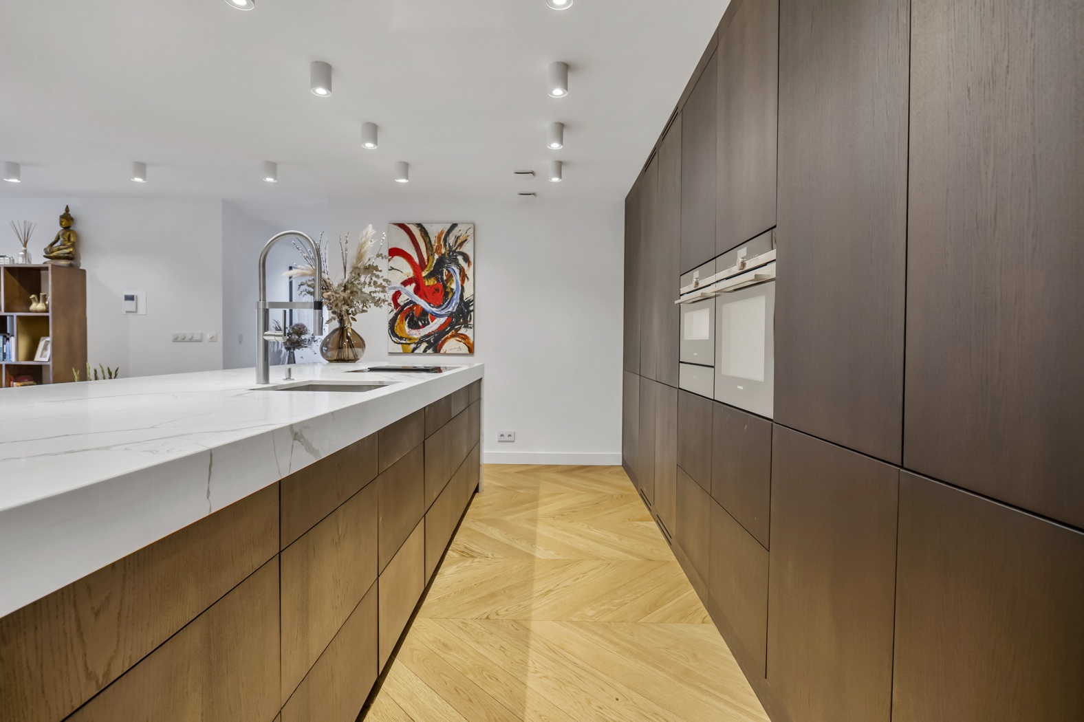 The floor, parquet crafted from oak, herringbone pattern, forms the perfect foundation: timeless, elegant, and with a warm appearance that lends the whole apartment a refined elegance.