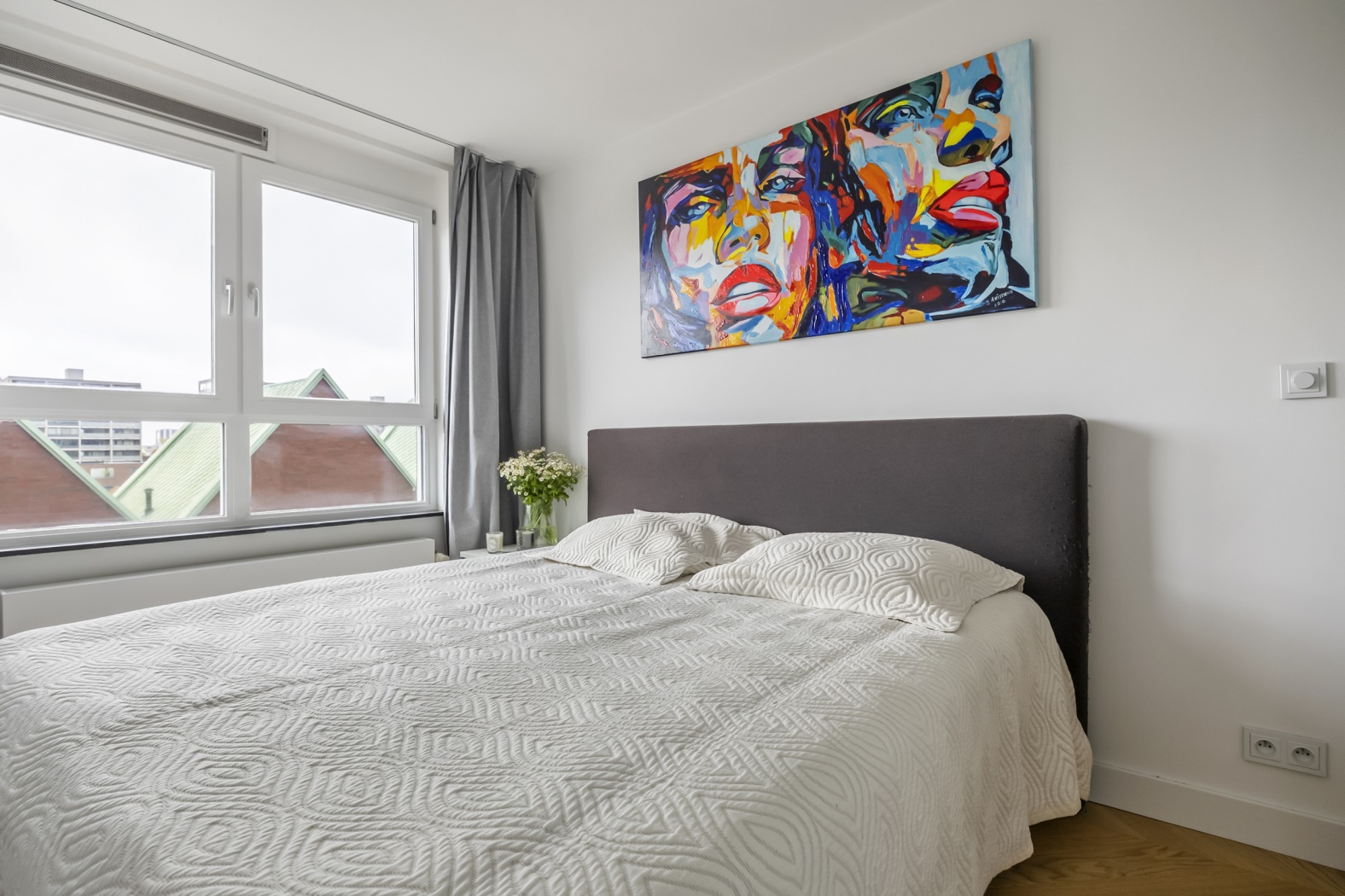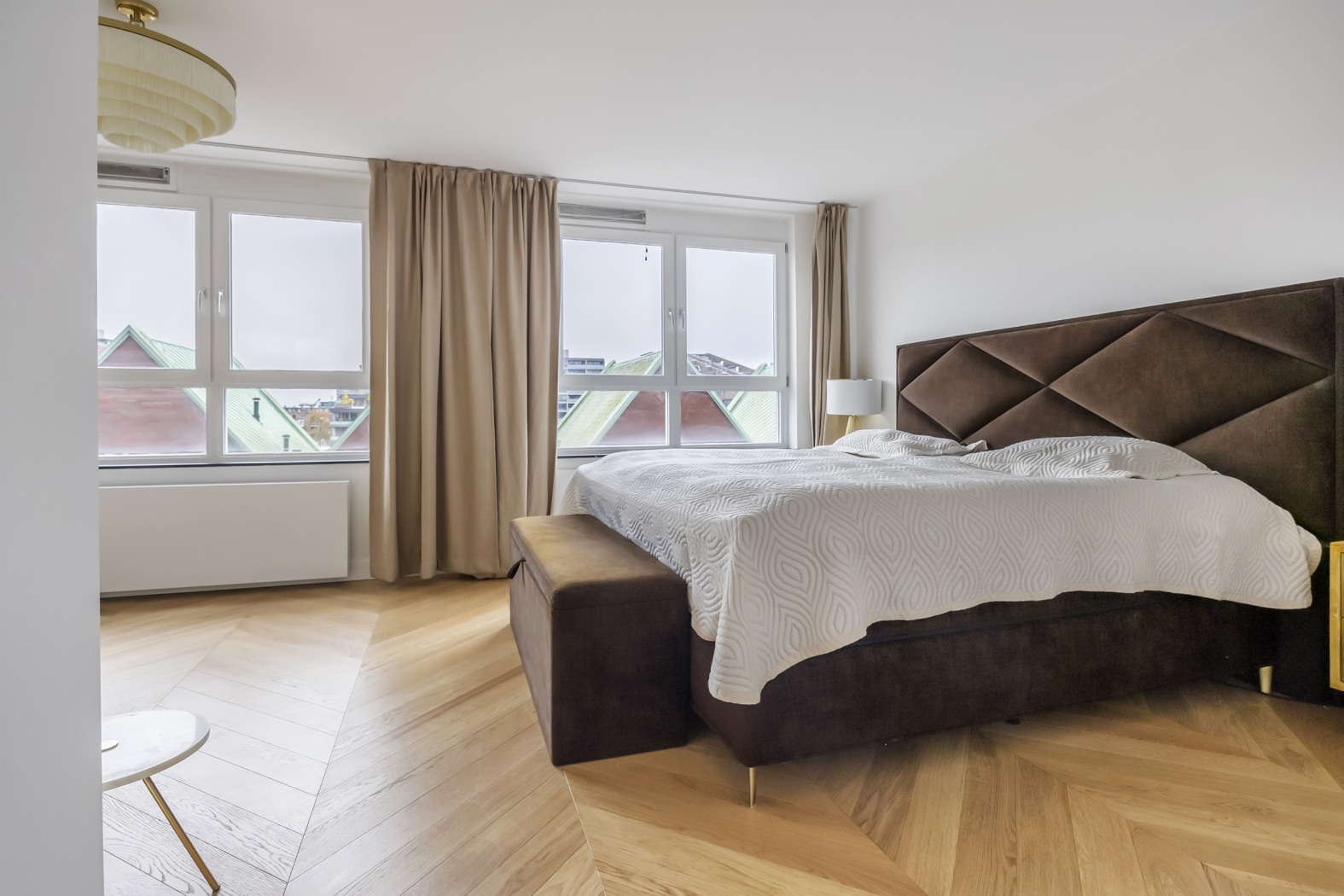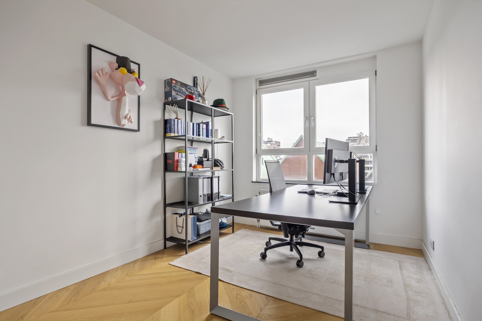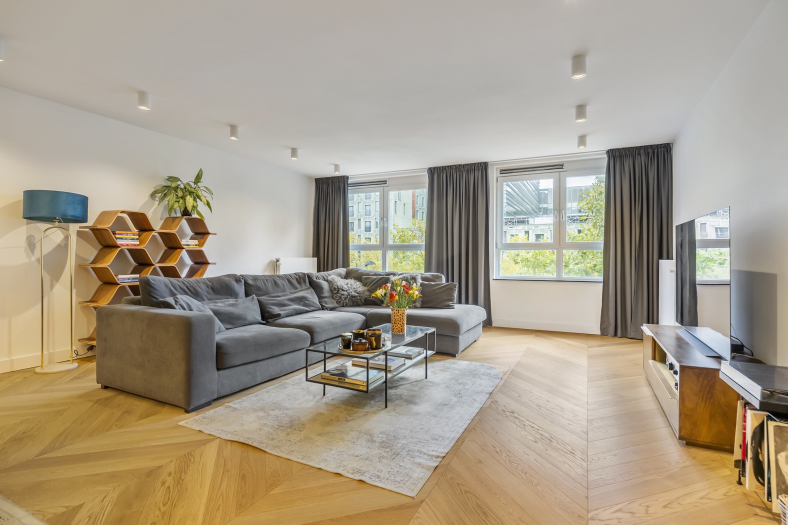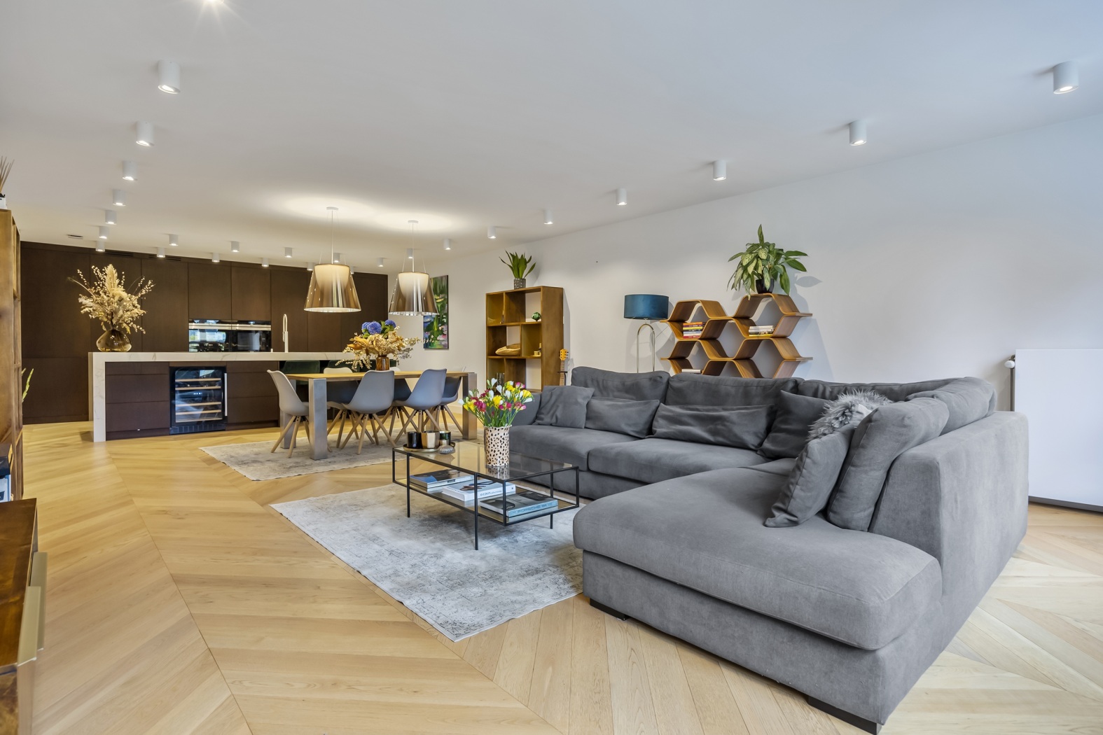 The floor, parquet crafted from oak, herringbone pattern, forms the perfect foundation: timeless, elegant, and with a warm appearance that lends the whole apartment a refined elegance.