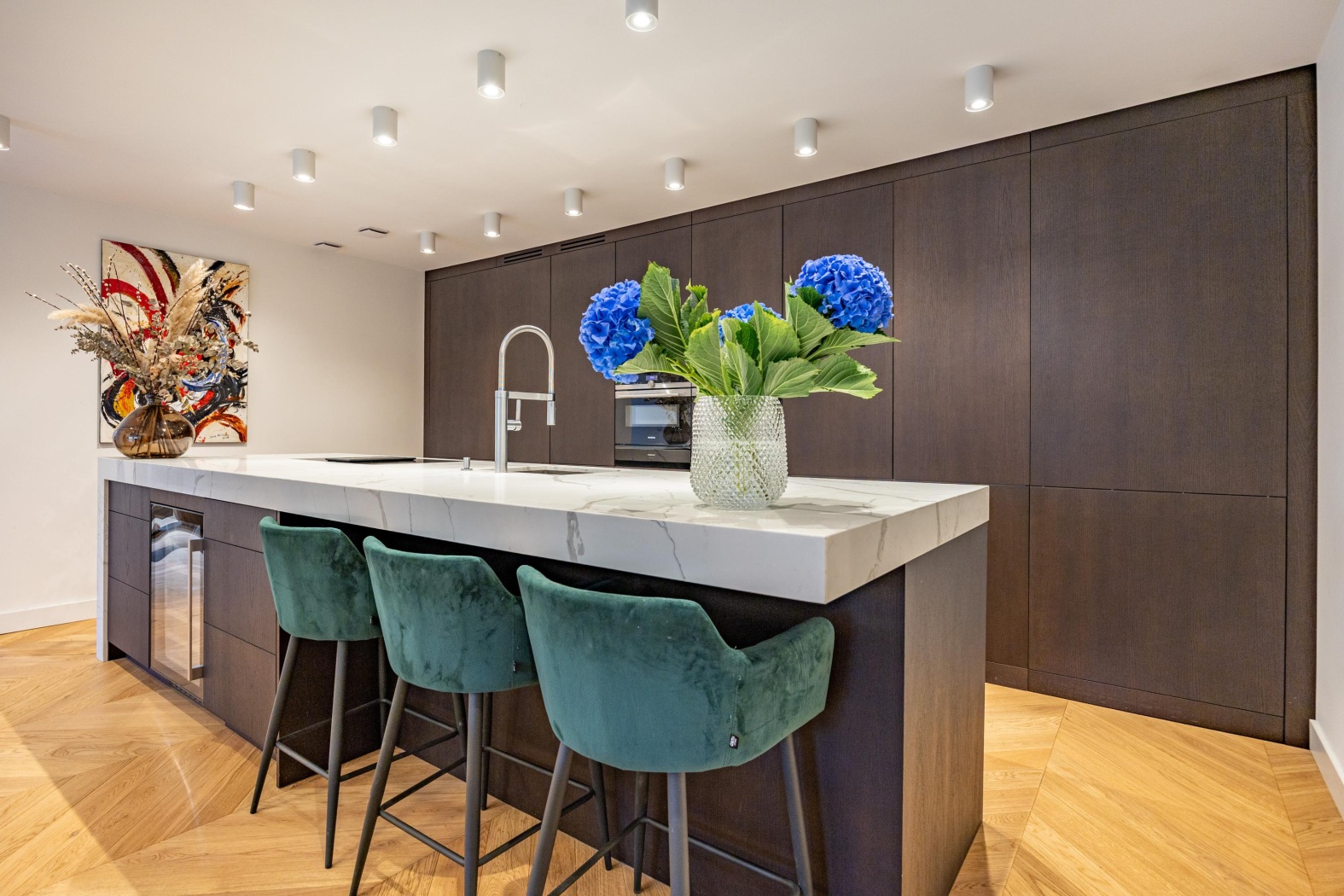 De vloer, uitgevoerd in eikenhout in Hongaarse punt, vormt de perfecte basis: tijdloos, elegant en met een warme uitstraling die het geheel een verfijnde grandeur geeft.