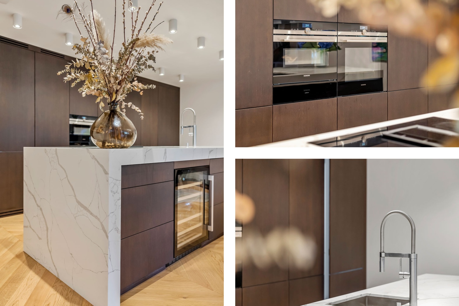 Het hart van de living wordt gevormd door de maatwerk keuken – een ware blikvanger, waar warmte, elegantie en vakmanschap samenkomen in een meesterwerk van design. Het imposante keukeneiland (3,6 x 1,2 m) nodigt uit tot uitgebreid koken, borrelen en samenzijn. Deze keuken combineert design en functionaliteit op hoog niveau en is uitgerust met hoogwaardige Siemens-apparatuur: