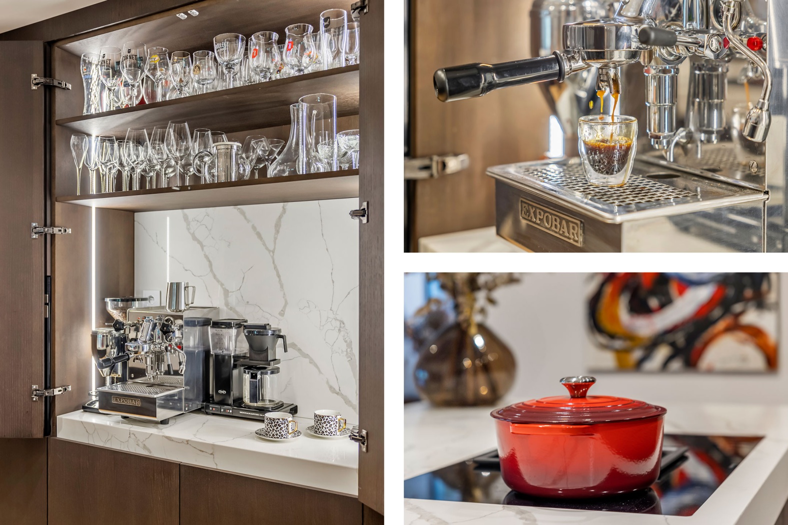 De greeploze fronten, uitgevoerd in echt eikenhoutfineer met beschermlaag, geven de keuken een natuurlijke, luxe uitstraling. De kastwand herbergt bovendien een slim verborgen werkblad met aansluitingen voor keukenapparatuur – ideaal voor uw koffiemachine, blender of mixer. LED-verlichting en geïntegreerde stopcontacten zorgen voor comfort en elegantie tot in het kleinste detail.